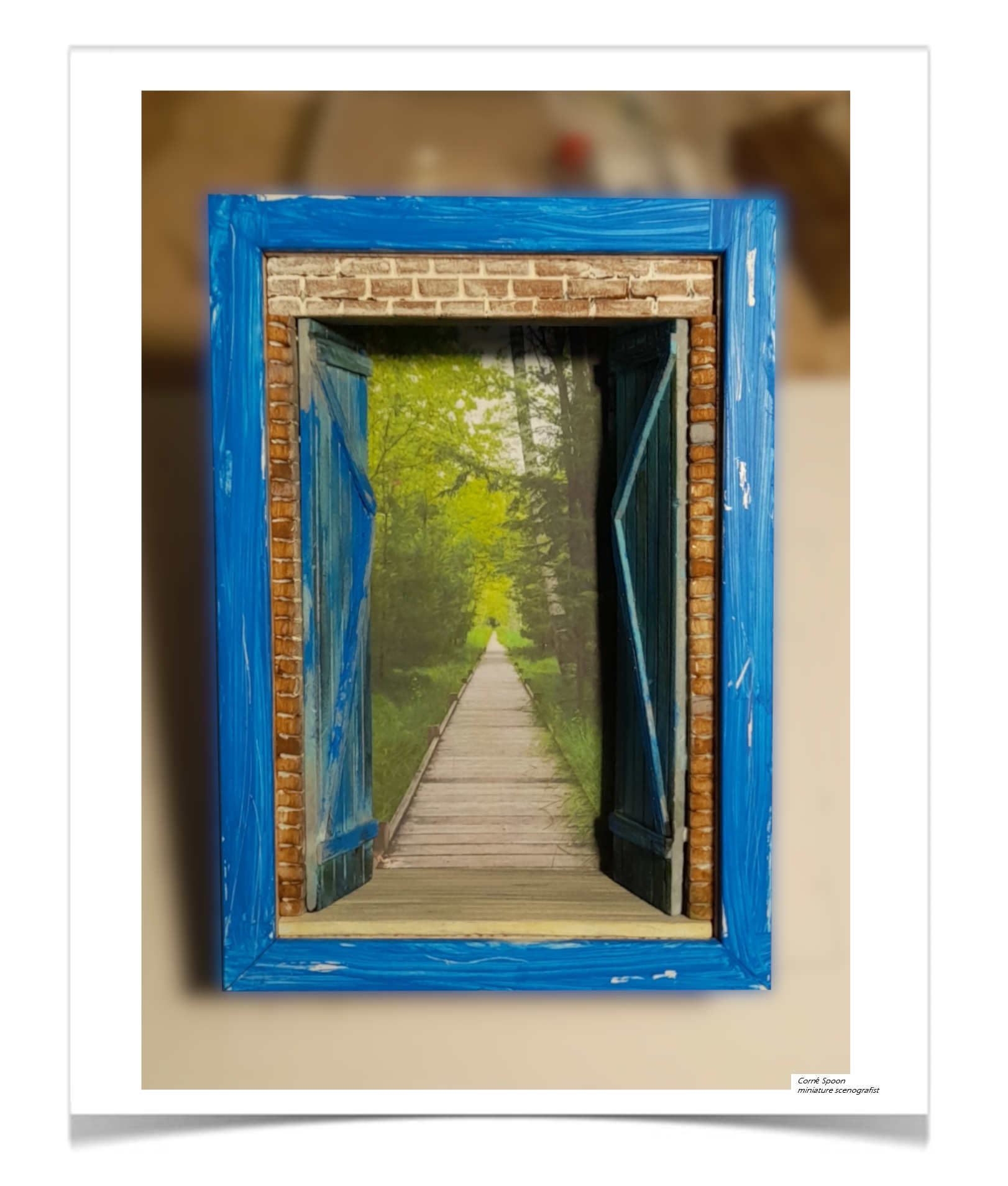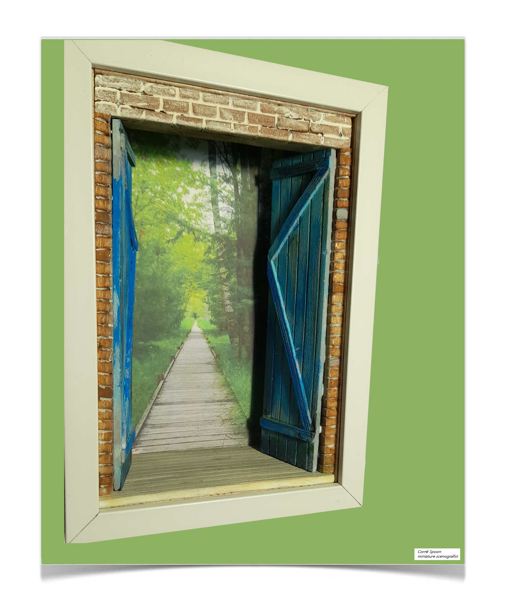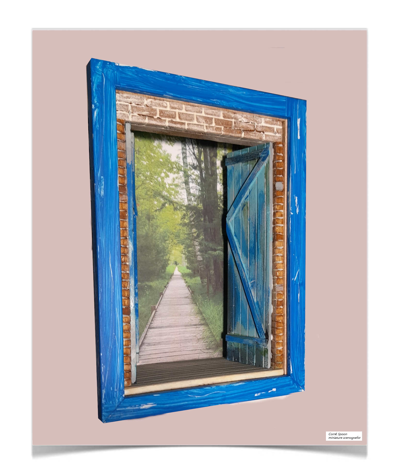 Deze miniatuur opent als een raam naar een andere wereld: blauwe luiken, een verweerde lijst en daarachter een uitnodigend pad dat tussen hoge bomen verdwijnt. Het werk speelt met perspectief en illusie, waardoor het voelt alsof je écht naar buiten kijkt. De combinatie van schilderachtige texturen en een dieptebeeld geeft het stuk een serene, bijna meditatieve sfeer. Het is juist die samensmelting van kunst en verbeelding die het zo mooi maakt: een klein venster dat grootse rust oproept.