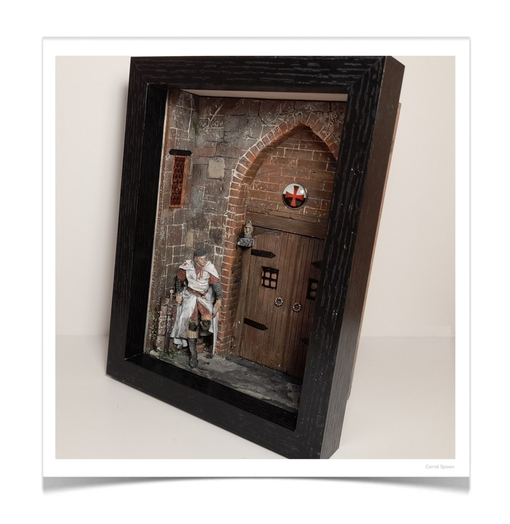 Prachtig gedetailleerde middeleeuwse diorama met een Tempelier-ridder bij een kasteelpoort. Dit sfeervolle stuk is rijk uitgevoerd met realistische steenstructuren, houten deuren en authentieke details. De handgeschilderde ridder straalt waakzaamheid en historie uit en maakt dit een echte blikvanger. Ideaal voor liefhebbers van middeleeuwen, ridders, fantasy of miniaturen