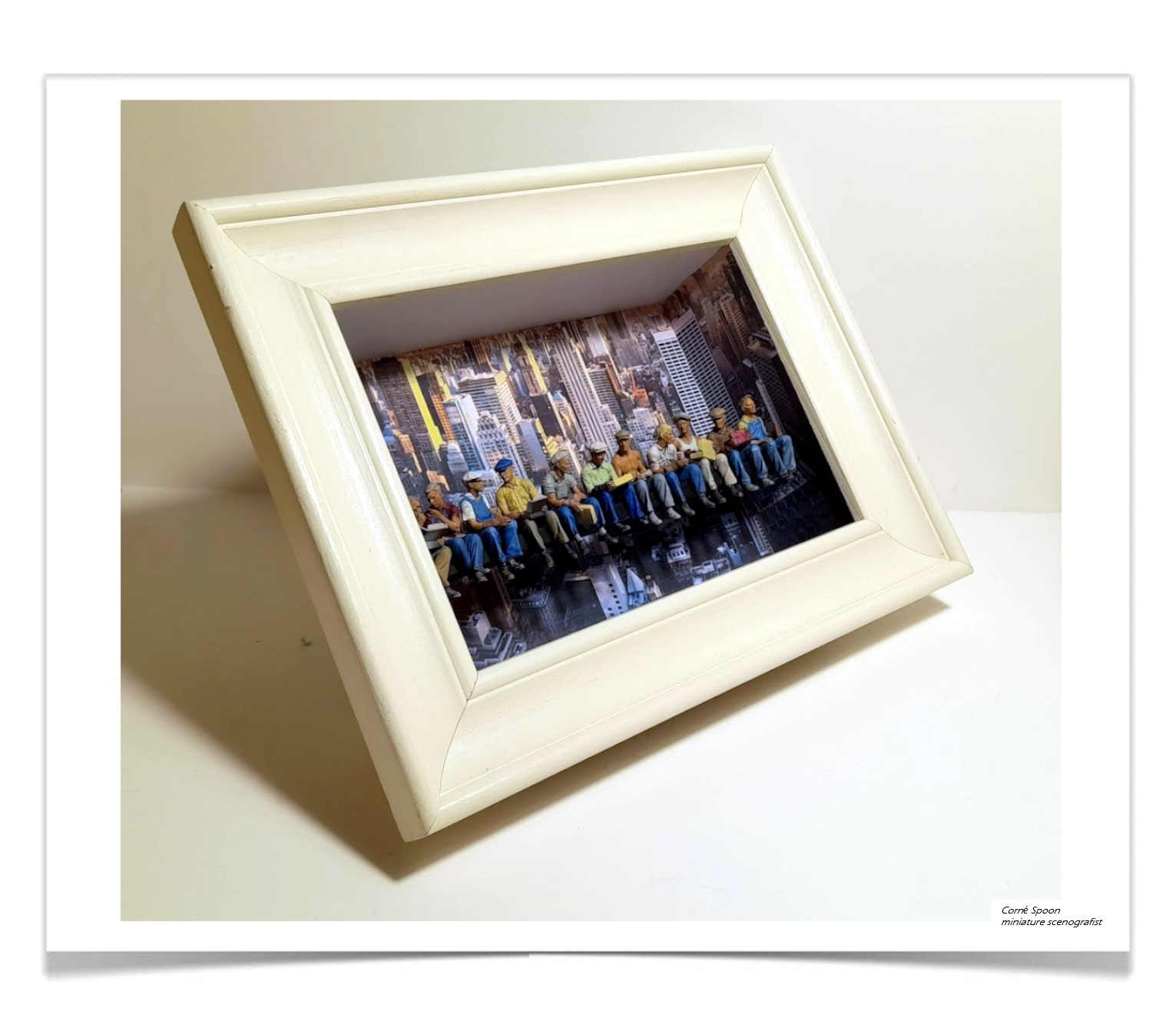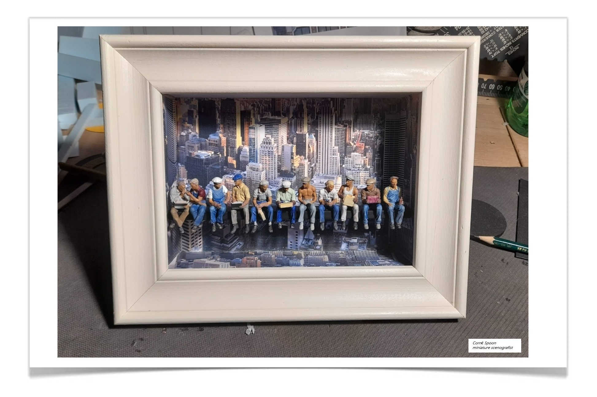 Op de foto zijn elf bouwvakkers te zien die ogenschijnlijk nonchalant op grote hoogte op een steunbalk zitten te lunchen terwijl hun voeten naar beneden bungelen. Ik heb ze na laten maken, zelf geverft en in een lijstje gedaan. Schaal is 1:35
