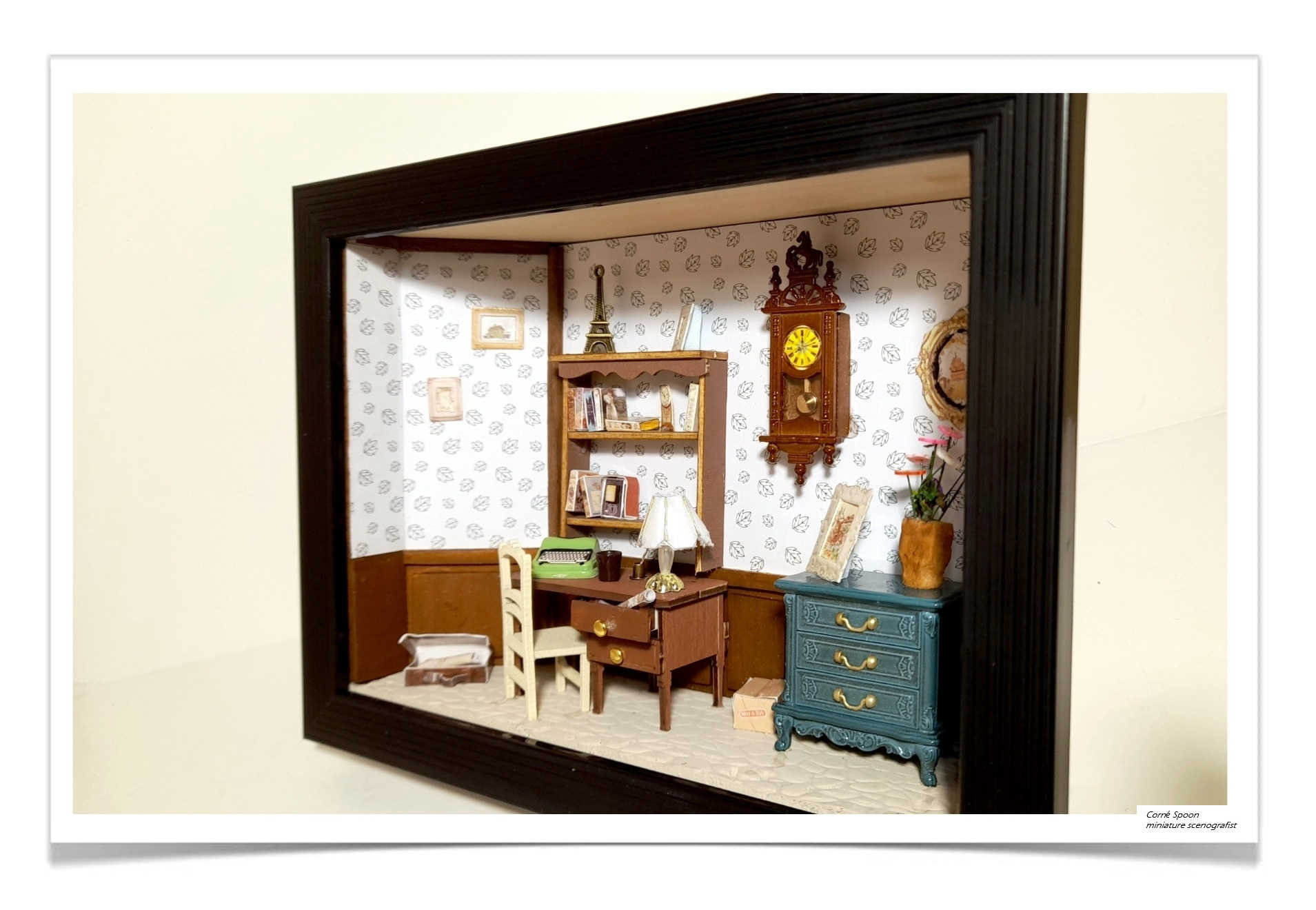 Deze miniatuur toont een sfeervolle vintage kamer vol karakter: bloemrijk behang, houten lambrisering en zorgvuldig geplaatste meubels zoals een bureau met lamp en boeken, een groene stoel en een kast vol miniatuurboeken en decoraties. Kleine details – een klok, ingelijste afbeeldingen, een vaas met bloemen en een blauwe ladekast – geven het geheel een huiselijke, bijna nostalgische warmte. Zelfs het kleine koffertje op de vloer vertelt een verhaal. Wat het zo mooi maakt, is de harmonie tussen kleur, textuur en detail: een intiem wereldje dat direct tot de verbeelding spreekt.