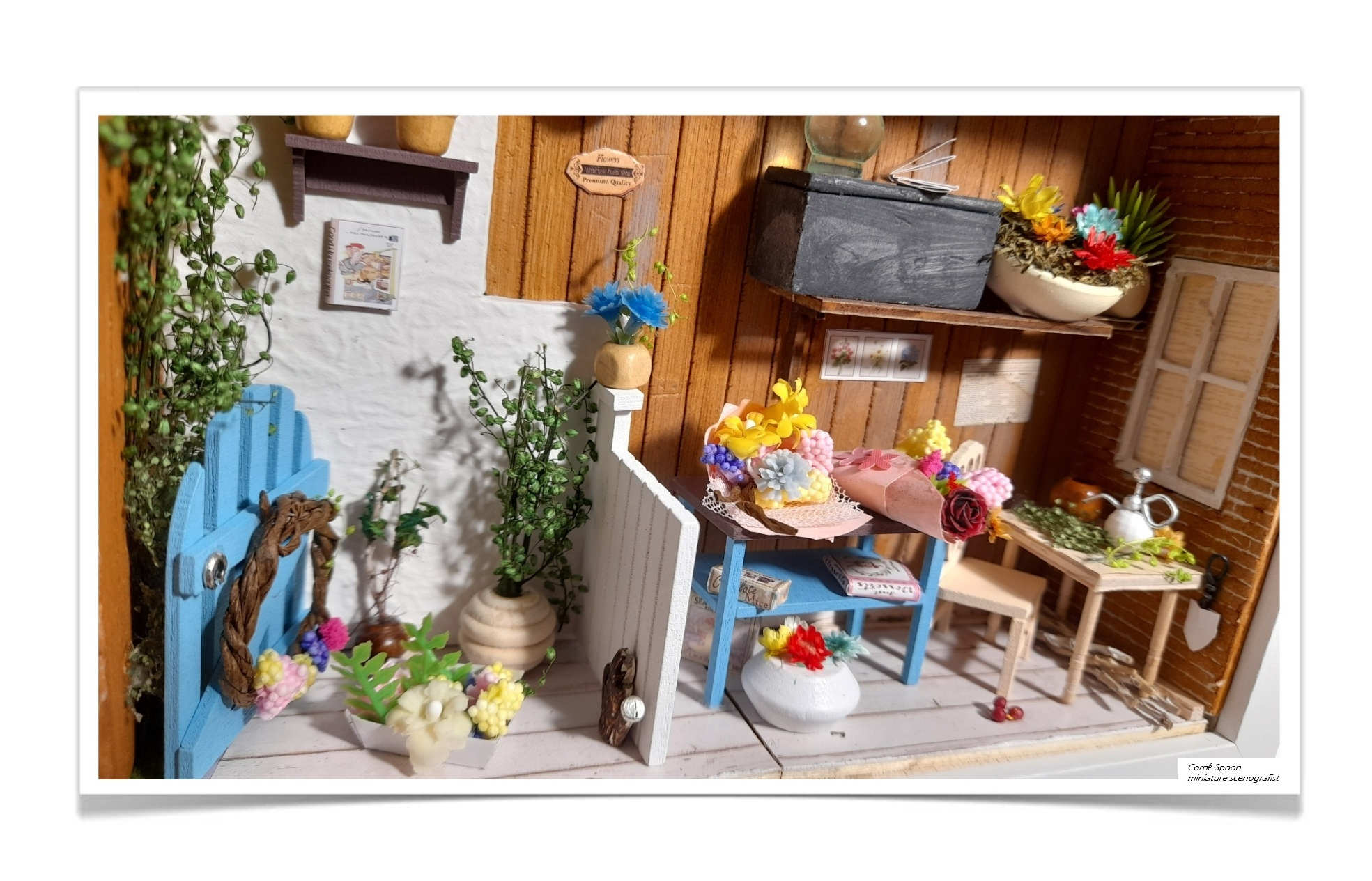Deze miniatuur toont een sfeervolle bloemenkamer vol kleur en leven. Links staat een blauw deurtje met krans, omringd door potplanten en klimmend groen. In het midden vult een werktafel zich met boeketten en losse bloemen, met een stoel die uitnodigt om even plaats te nemen. Boven de tafel staan kleine decoraties, rechts zorgen een plantenspuit, een dienblad met groen en een raam voor ambachtelijke charme. De vele details en warme compositie maken dit tot een betoverend, levendig miniatuurwereldje.