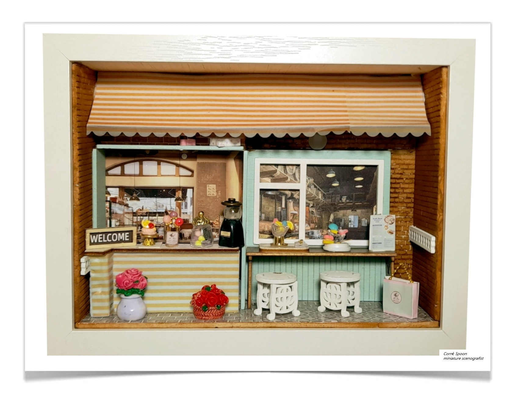Deze miniatuur toont een charmant te ijssalon met een fris oranje-wit gestreept luifeltje en een uitnodigende toonbank vol taartjes, potjes en een koffiemachine. Twee witte krukken nodigen uit om even neer te strijken, terwijl het menu en de kleine decoraties het geheel een levendige, gezellige sfeer geven. De achtergrond creëert diepte en laat het lijken alsof de zaak echt doorloopt. Bloemen, een tasje en subtiele details maken het tafereel compleet.