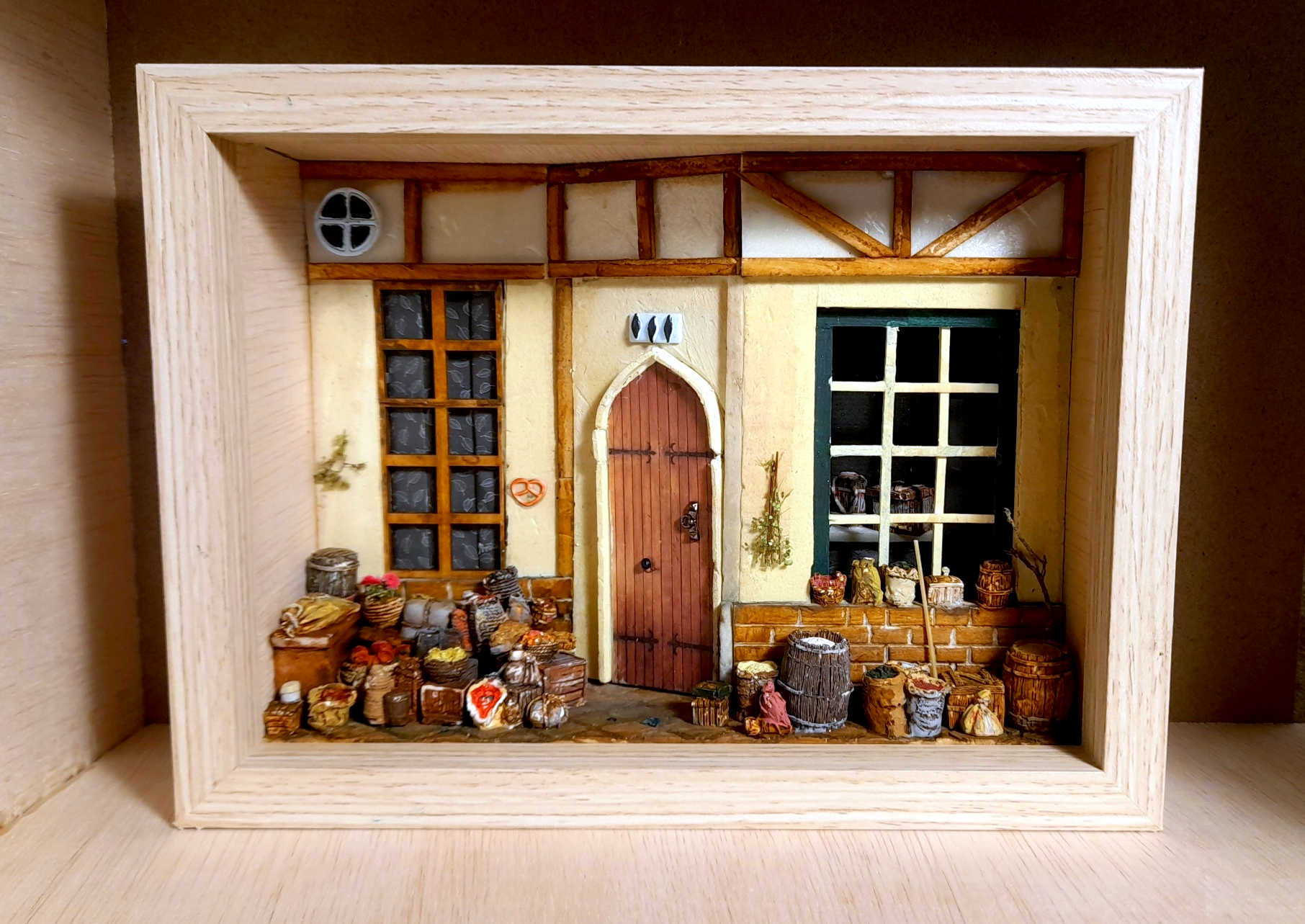 Deze sfeervolle gevel in rustieke stijl zit vol karakter: een houten boogdeur, authentieke ramen en een rijk gedetailleerde marktsetting met vaten, manden, kruiden en kleine handelswaren. Elk element is met zorg vervaardigd, waardoor het geheel een warme, historische uitstraling krijgt.