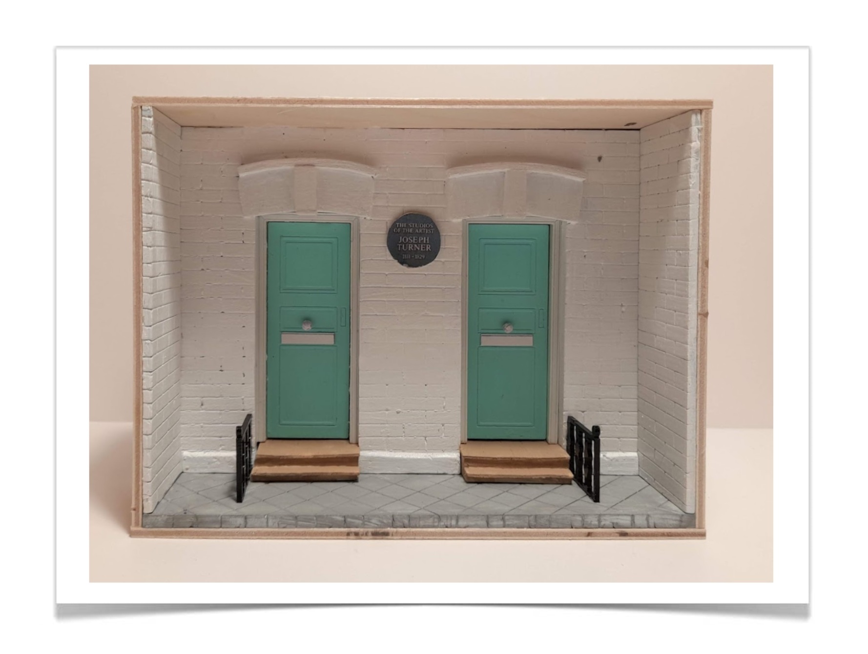 De twee groene deuren, elk met hun eigen karakter, lijken verhalen te bewaren van kunstenaars, bezoekers en voorbijgangers. De witte bakstenen muur en de smalle trappen met hun donkere leuningen geven het geheel een bijna Londense charme. Boven de linker deur prijkt een ronde plaquette die herinnert aan een tijd waarin creativiteit hier een thuis vond. Het is een klein, verstild fragment van een plek waar inspiratie ooit dagelijks door de ramen naar binnen viel — zorgvuldig gevangen in een intiem, tijdloos tableau.