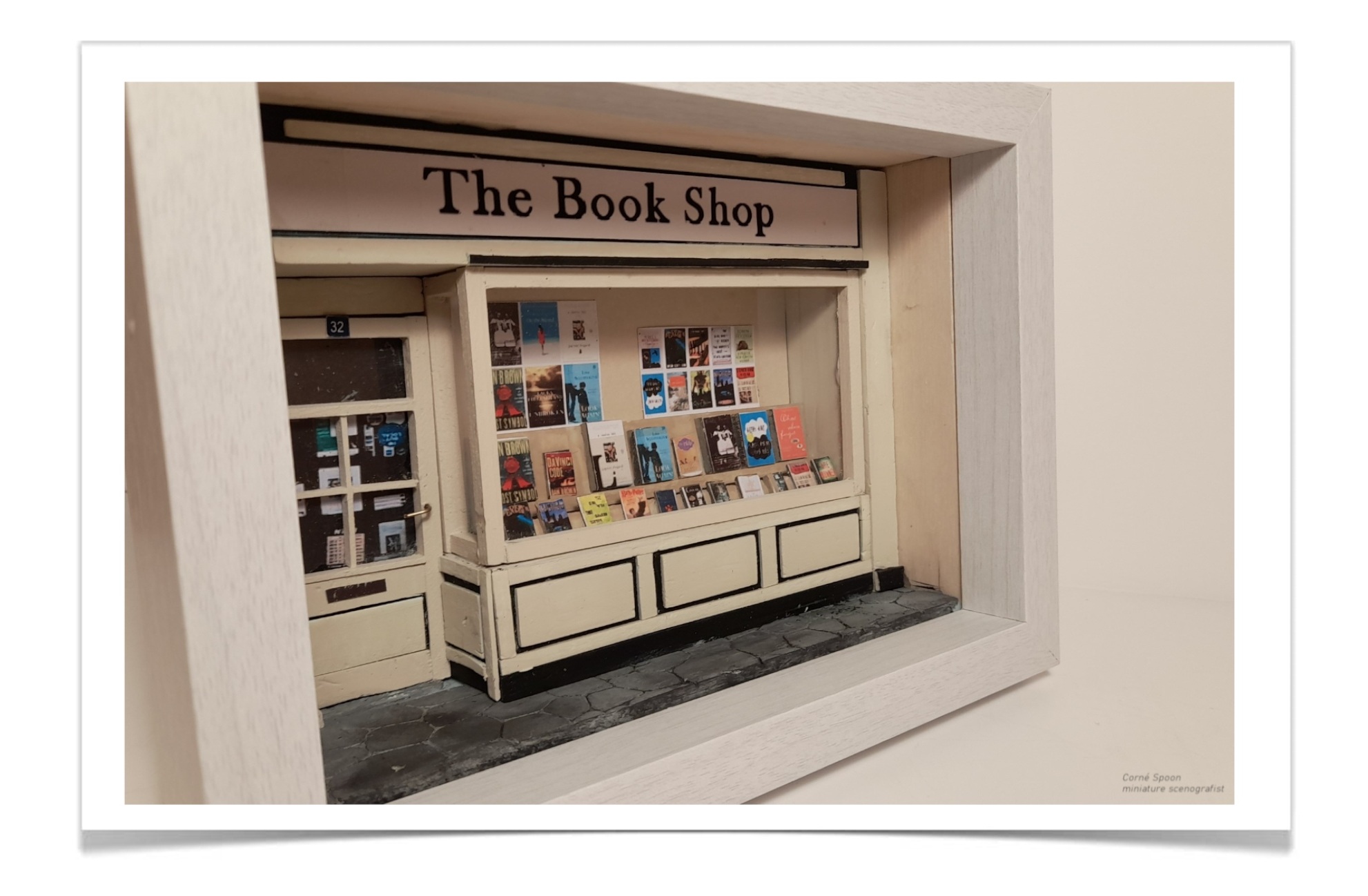 een kleine boekwinkel waar verhalen tot aan het raam reiken. De crèmekleurige gevel met zwarte accenten straalt rust uit, terwijl de etalage gevuld is met kleurrijke boekomslagen die nieuwsgierigheid wekken alsof je zo naar binnen wilt stappen. De deur met het nummer 32 lijkt te wachten op een bezoeker die even wil verdwalen tussen de planken. Het stenen trottoir ervoor maakt het tafereel compleet — een stil, intiem moment uit een straat waar boeken nog een eigen thuis hebben.