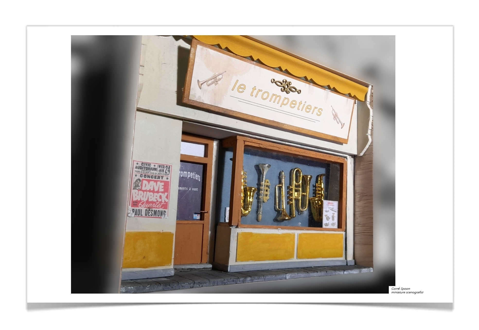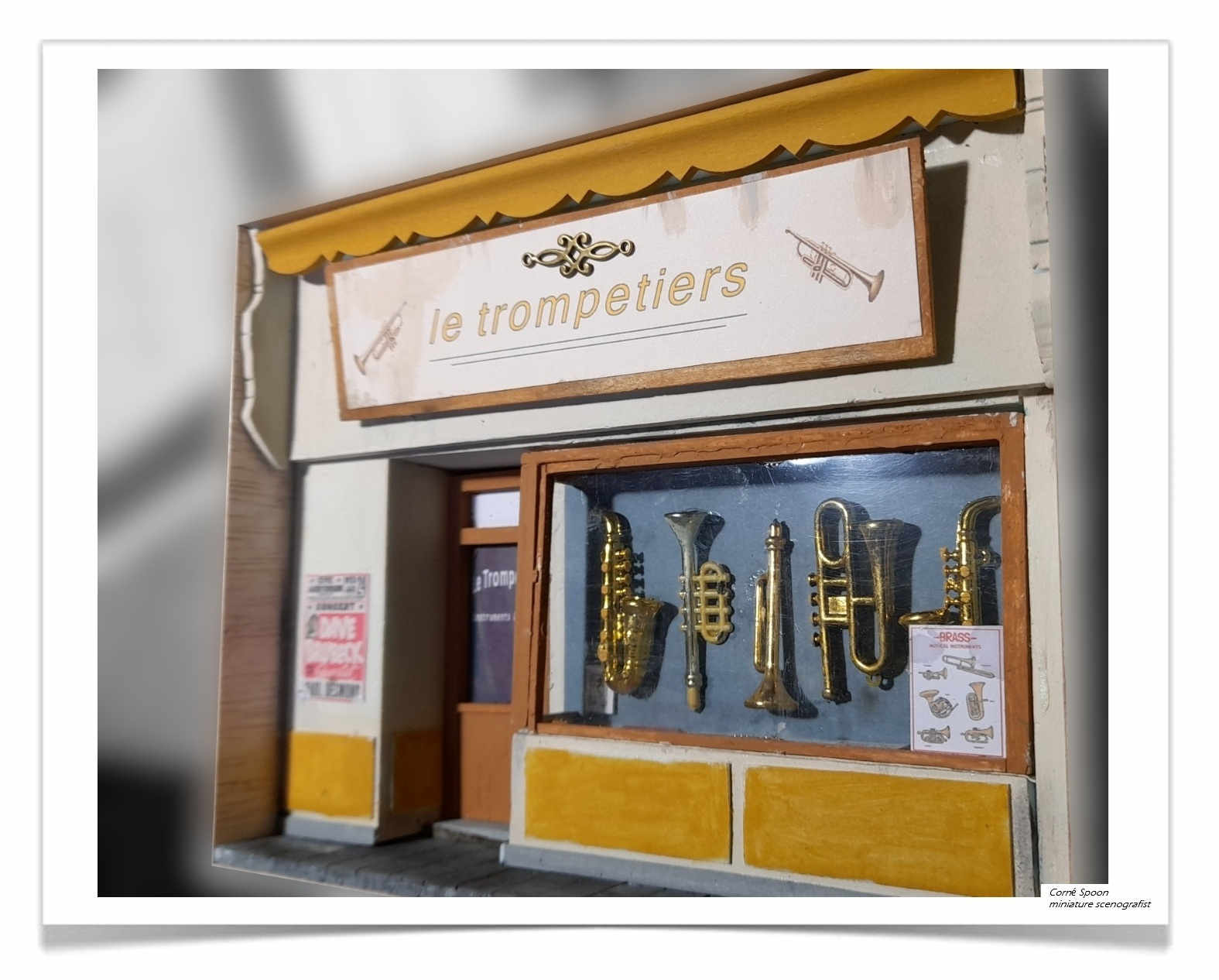 Deze miniatuur toont de gevel van Le Trompetiers, een winkel gespecialiseerd in blaasinstrumenten. In de etalage staan diverse koperinstrumenten uitgestald, waaronder een saxofoon, trompet, hoorn en tuba. Links hangt een concertaffiche, terwijl op de deur een bordje verwijst naar het assortiment van de winkel. De scène is uitgewerkt als een driedimensionale diorama binnen een houten lijst, met aandacht voor realistische details en sfeer.