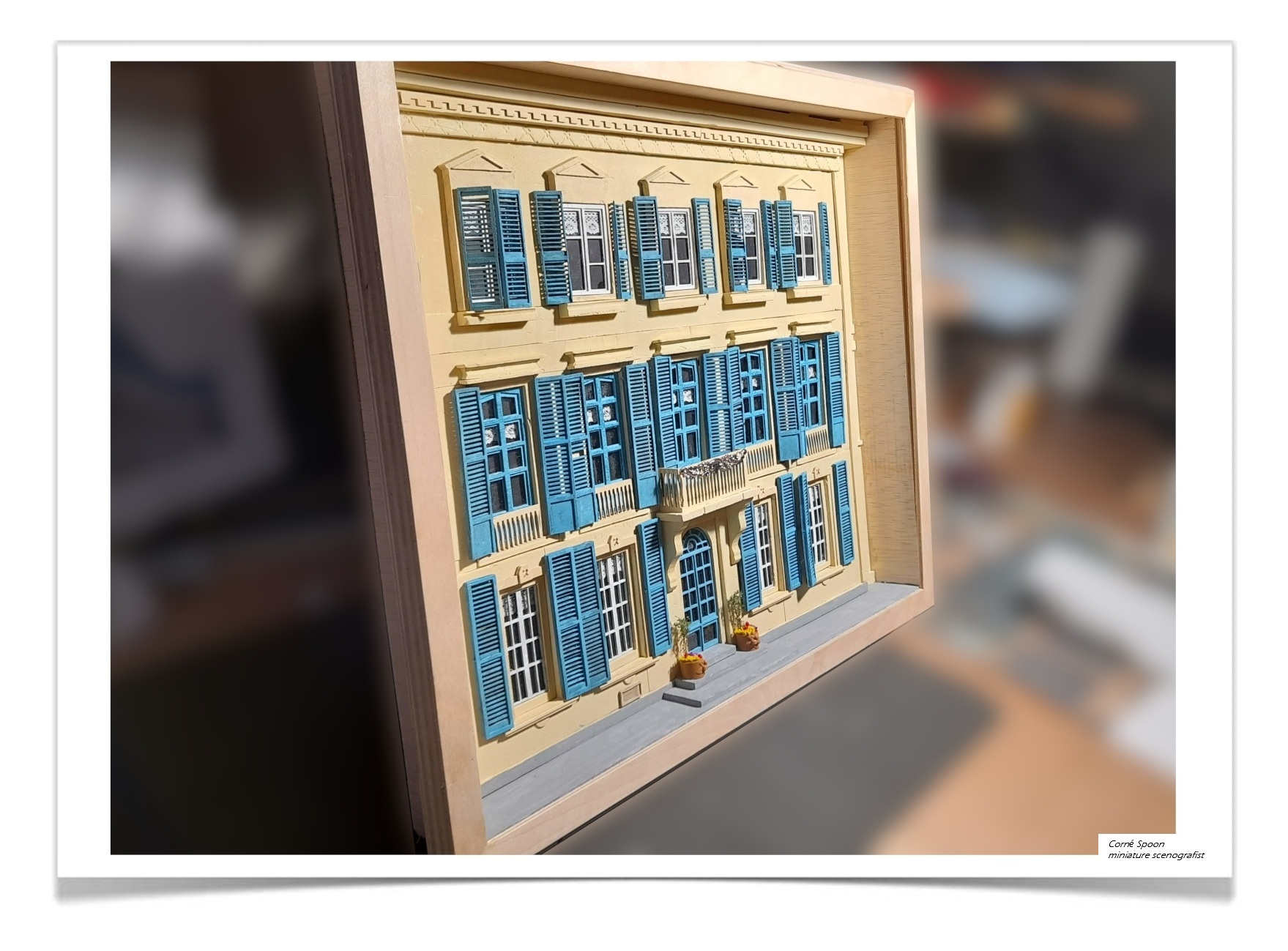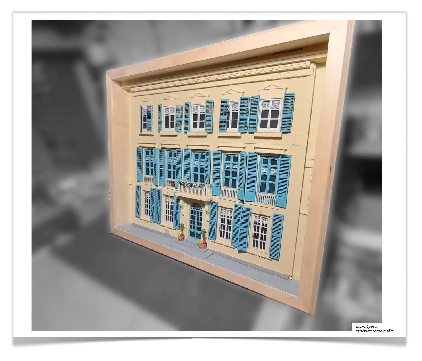 Deze miniatuur toont een gevel van een klassiek, symmetrisch gebouw met drie verdiepingen. Elke verdieping heeft ramen met blauwe luiken en witte decoratieve patronen. In het midden bevindt zich een klein balkon met een sierlijk hekwerk. De entree is uitgevoerd als een boogportaal, geflankeerd door twee planten in potten die extra detail en realisme geven. Het geheel is vormgegeven als een driedimensionale scenografie binnen een houten lijst.