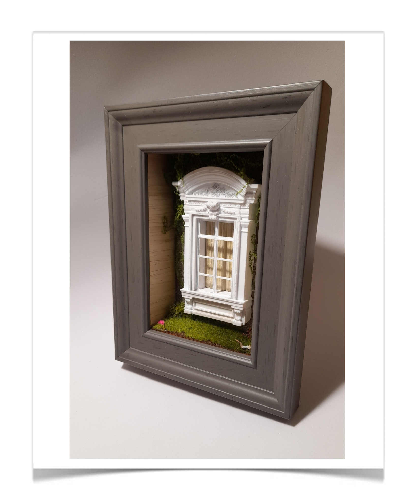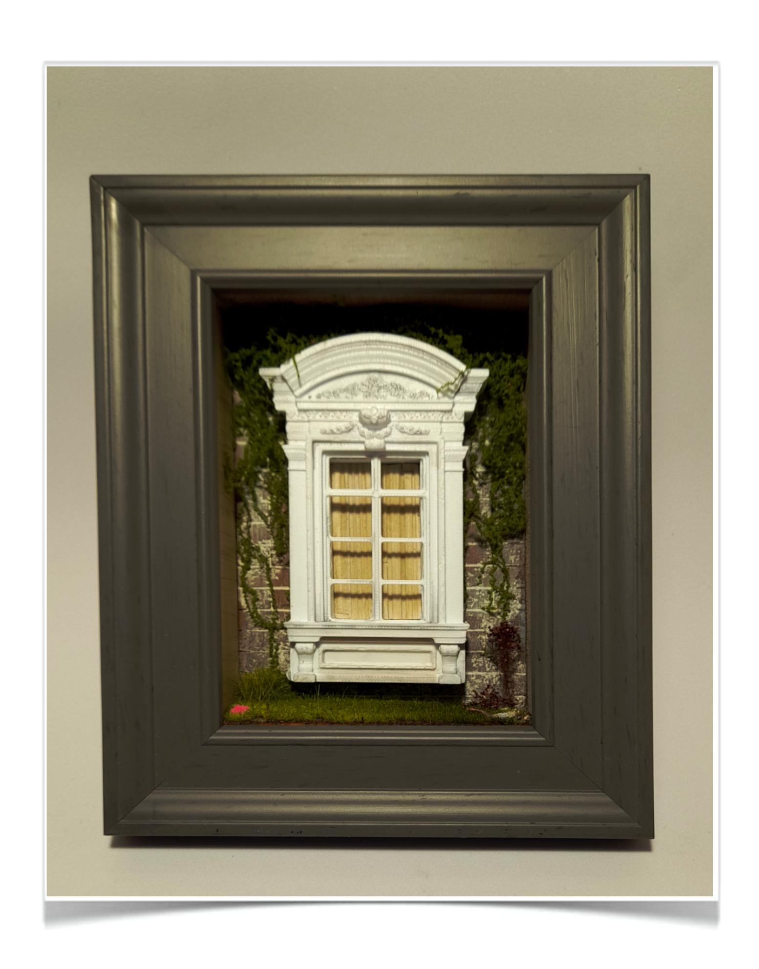 Deze miniatuur toont een klassiek vormgegeven raamnis met sierlijke architectonische details, zoals een pediment en pilasters. Achter het raam hangen lichte gordijnen die diepte en realisme toevoegen. De omliggende begroeiing en het gras met kleine bloemen creëren een natuurlijke, tuinachtige sfeer. Het geheel is uitgevoerd als een driedimensionale diorama in een shadowbox‑frame, waardoor het lijkt alsof je naar een klein stukje buitenwereld kijkt.