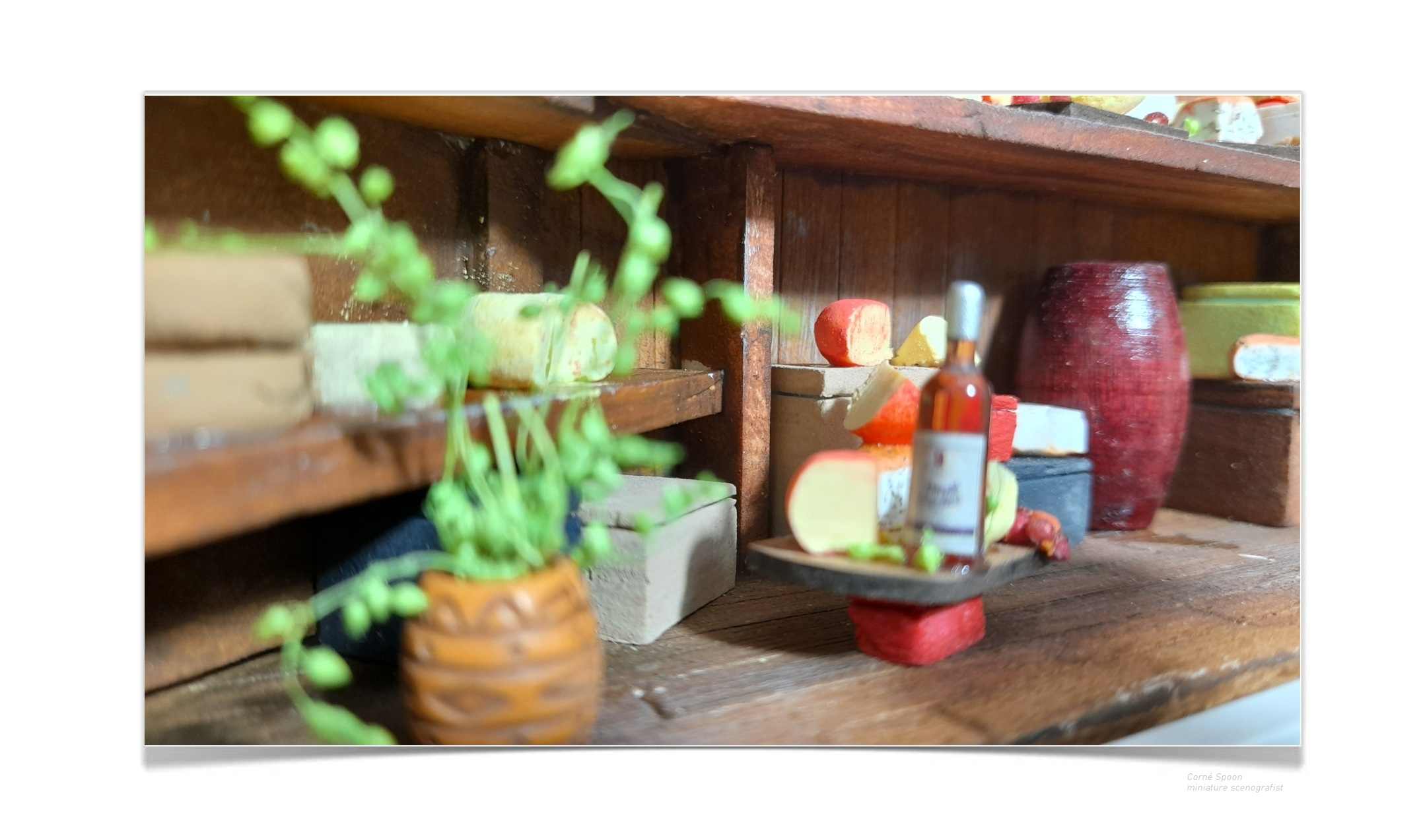 een heerlijk knus kijkje in een traditionele kaaskelder, waar houten planken vol liggen met ronde kazen in alle tinten geel en oranje. De flessen, kistjes en het oude wijnvat geven het gevoel dat hier al generaties lang met liefde wordt gewerkt. Een wagenwiel, hangende druiventrossen en een potplantje in de hoek brengen extra charme, alsof je zo een geurige, koele ruimte binnenstapt waar tijd geen haast kent.