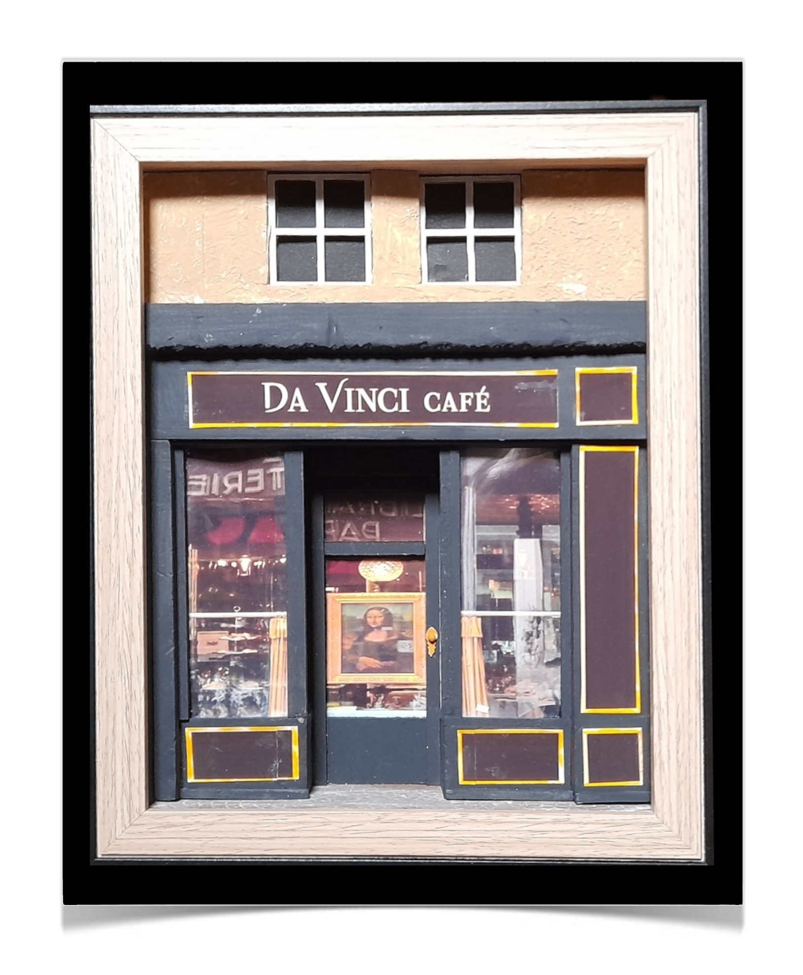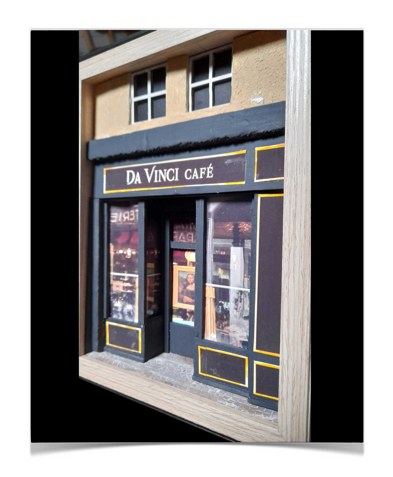Deze miniatuur toont de bestaande gevel van het Da Vinci Café, uitgevoerd met een donkere luifel, grote ramen en een glazen deur. Boven de entree staat de naam van het café in witte letters. Door het raam is een interieur te zien met verlichting en een afbeelding die verwijst naar het werk van Leonardo da Vinci.