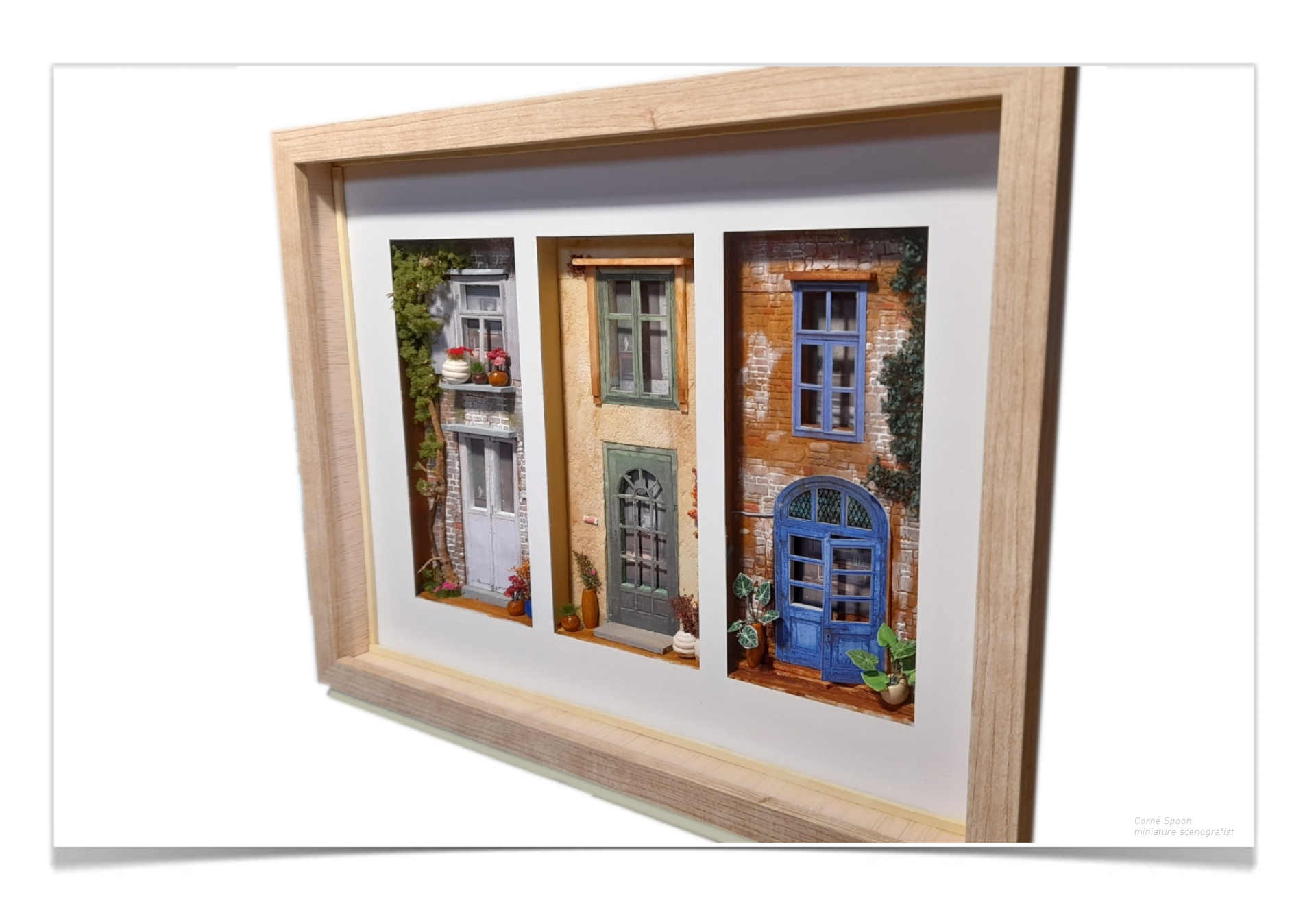 Drie werelden, één lijst. Dit handgemaakte drieluik toont een poëtische compositie van Europese gevels – elk met zijn eigen sfeer, kleur en verhaal. Van witte deuren met bloembakken tot blauwe poorten omringd door klimop: dit kunstwerk is een ode aan de schoonheid van het alledaagse.