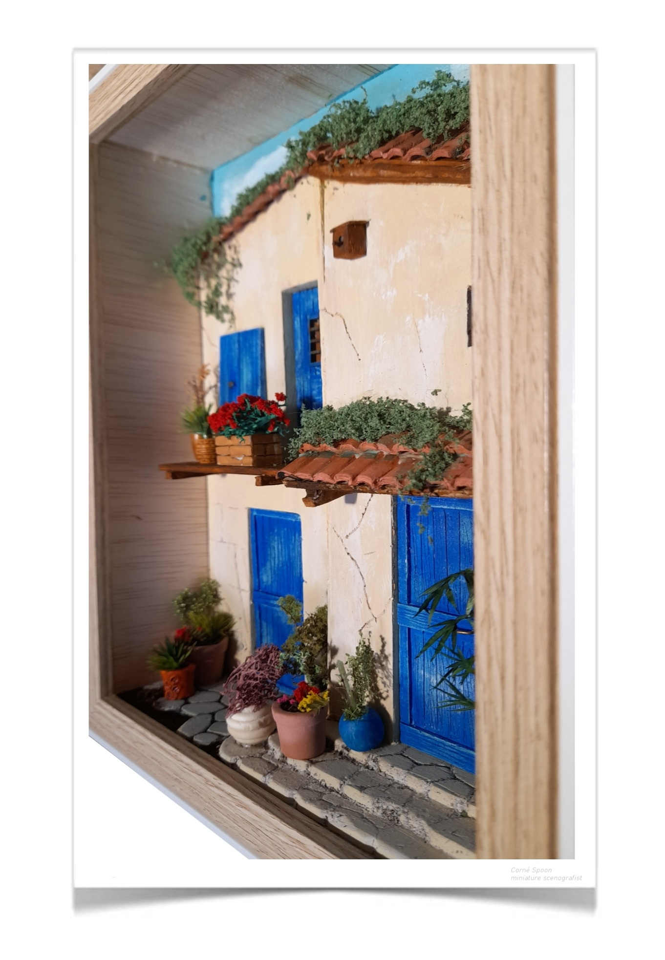 De warme, zuidelijke sfeer van een verweerd huisje met helderblauwe accenten. De scheuren in het pleisterwerk, de overgroeide dakrand en de vele potplanten geven het geheel een doorleefde charme. De blauwe deuren en ramen vormen een fris contrast met de zachte tinten van de muren. Een intiem tafereel dat direct doet verlangen naar zon, rust en een zacht briesje langs de kust