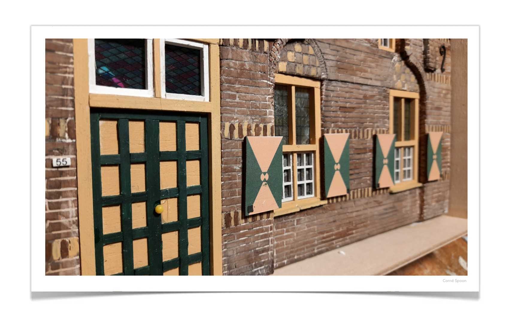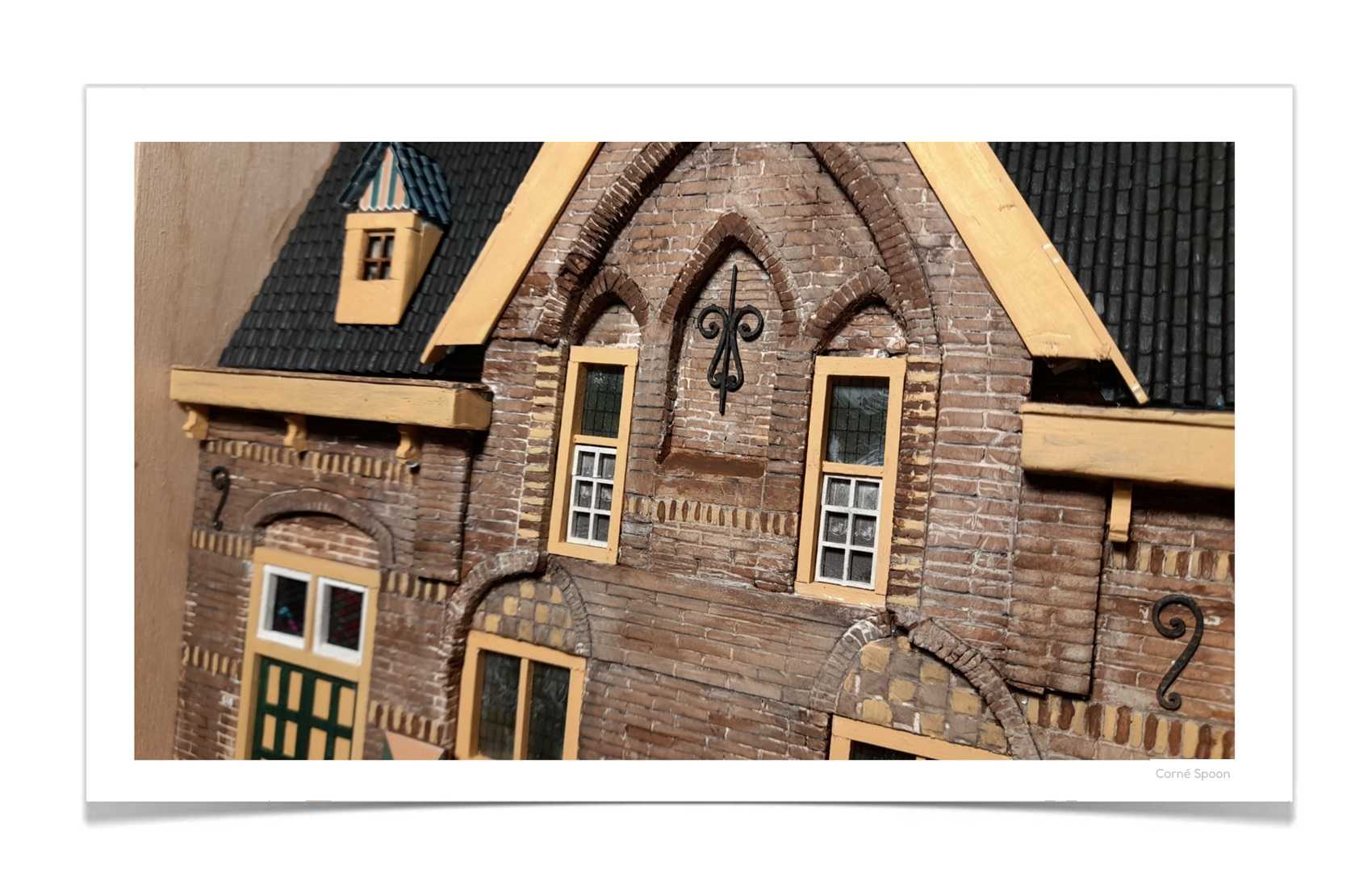 Dit is het neogotische jachthuis dat bij Kasteel Heeswijk hoort. Het gebouw, met een steil zadeldak en baksteenversieringen, dient als woning. De groene deur en luiken geven het geheel een warme, bijna dorpse uitstraling, terwijl het metselwerk en de daklijn een gevoel van historie oproepen. De symmetrie en kleine accenten maken het een intiem tafereel dat direct charme en herkenning uitstraalt.
