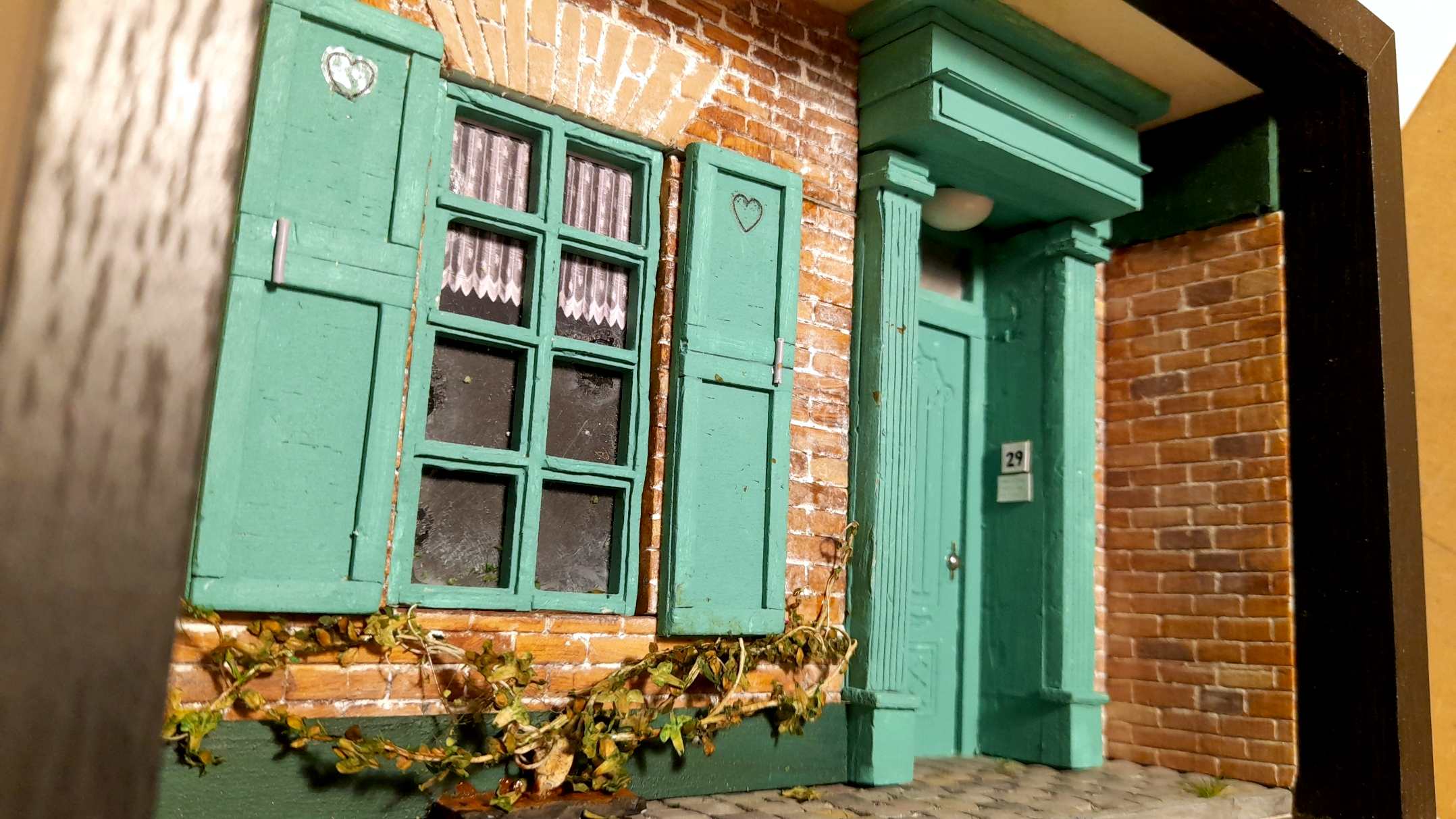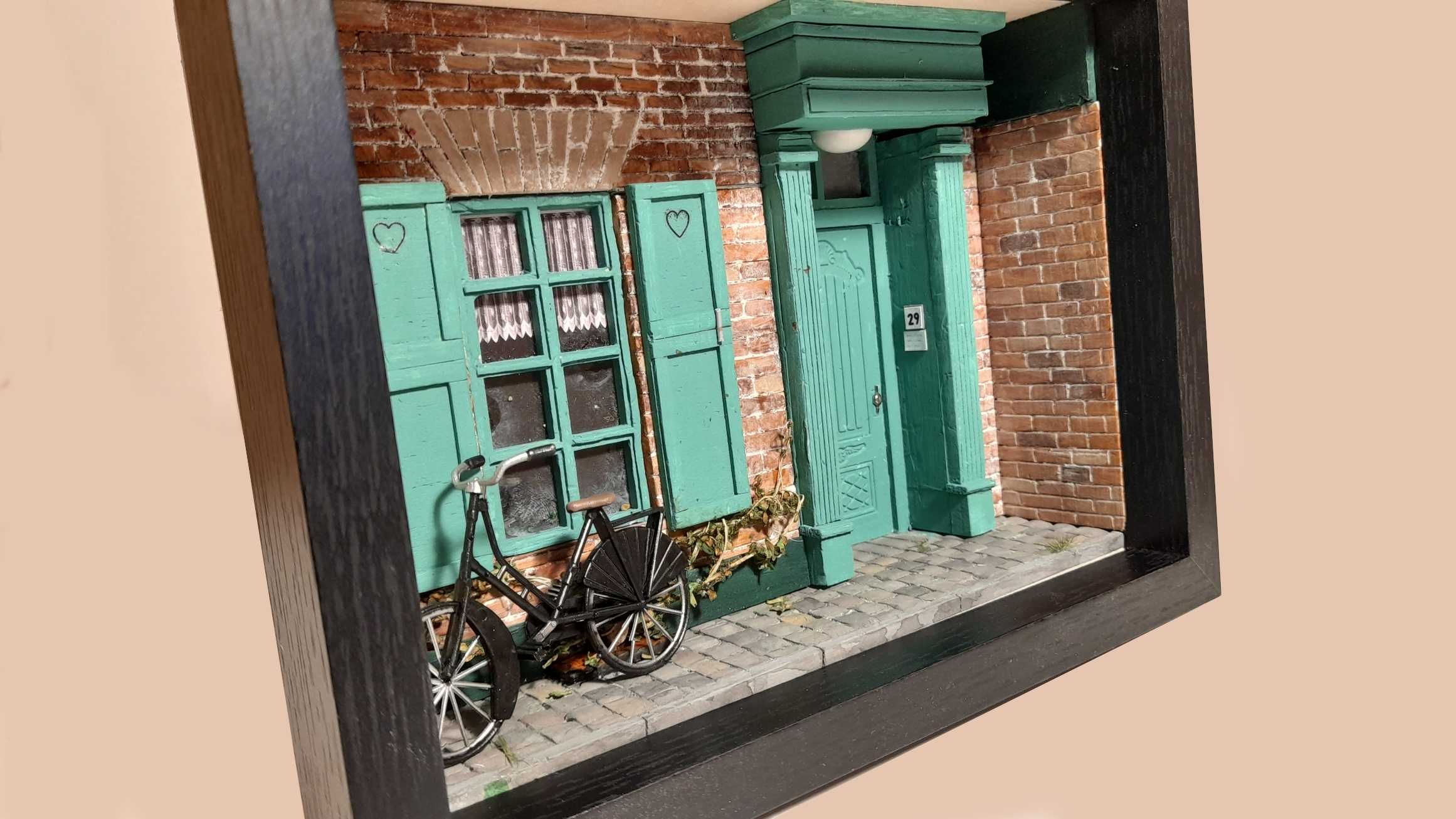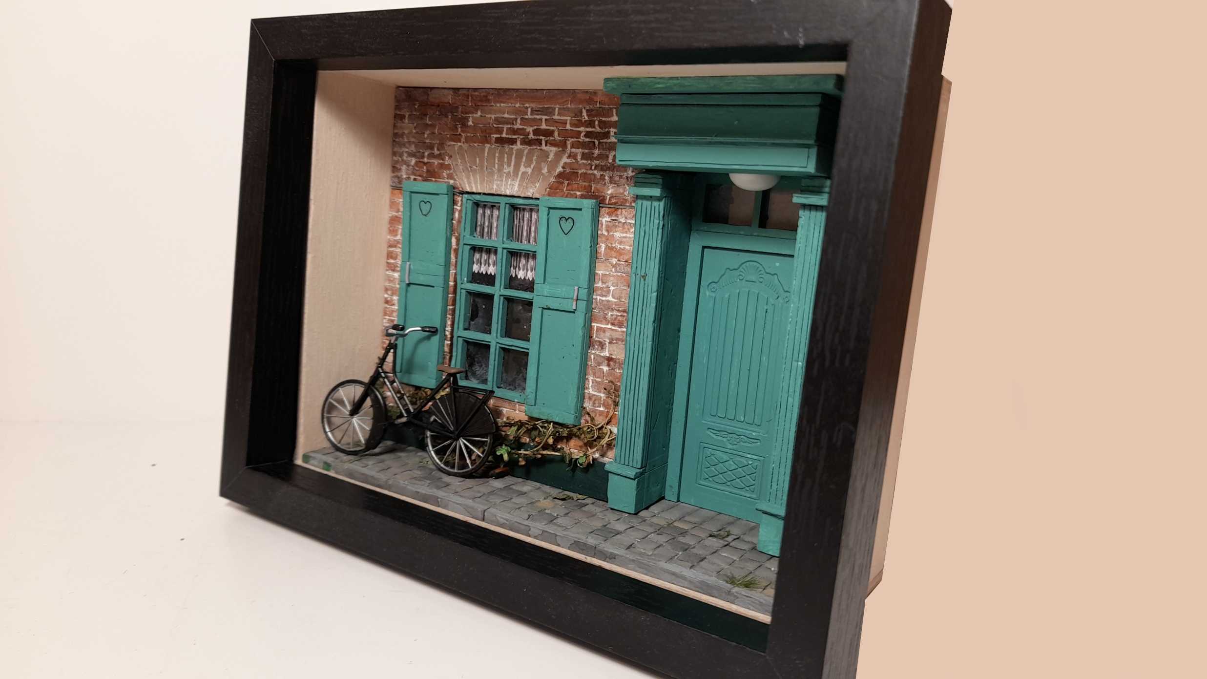 Het ontwerp richt zich op de zachte, bijna romantische architectuurtaal die zo kenmerkend is voor Brugge. De baksteenstructuur is opgebouwd in warme, genuanceerde tinten die de historische diepte van de stad oproepen. Het turquoise deur- en raamwerk vormt een helder kleuraccent dat het gevelvlak ritme en lichtheid geeft. De hartvormige uitsparingen in de luiken en de kantachtige gordijnen voegen een huiselijke, bijna folkloristische laag toe. De subtiele begroeiing langs de plint verzacht de compositie en verbindt het ontwerp met de organische sfeer van Brugse steegjes. Het geheel is een miniatuurstudie in verfijning, balans en stille charme.