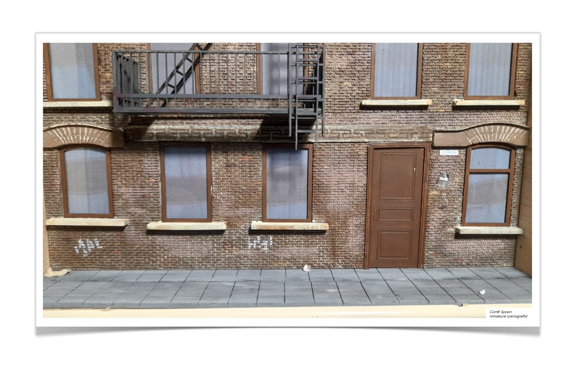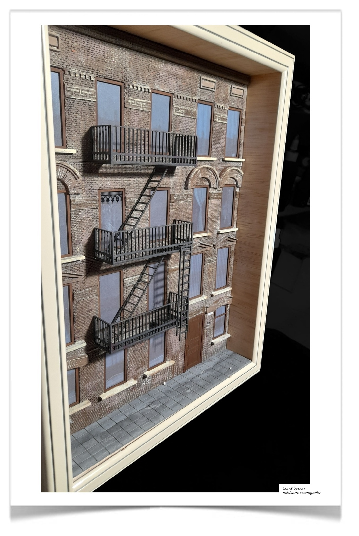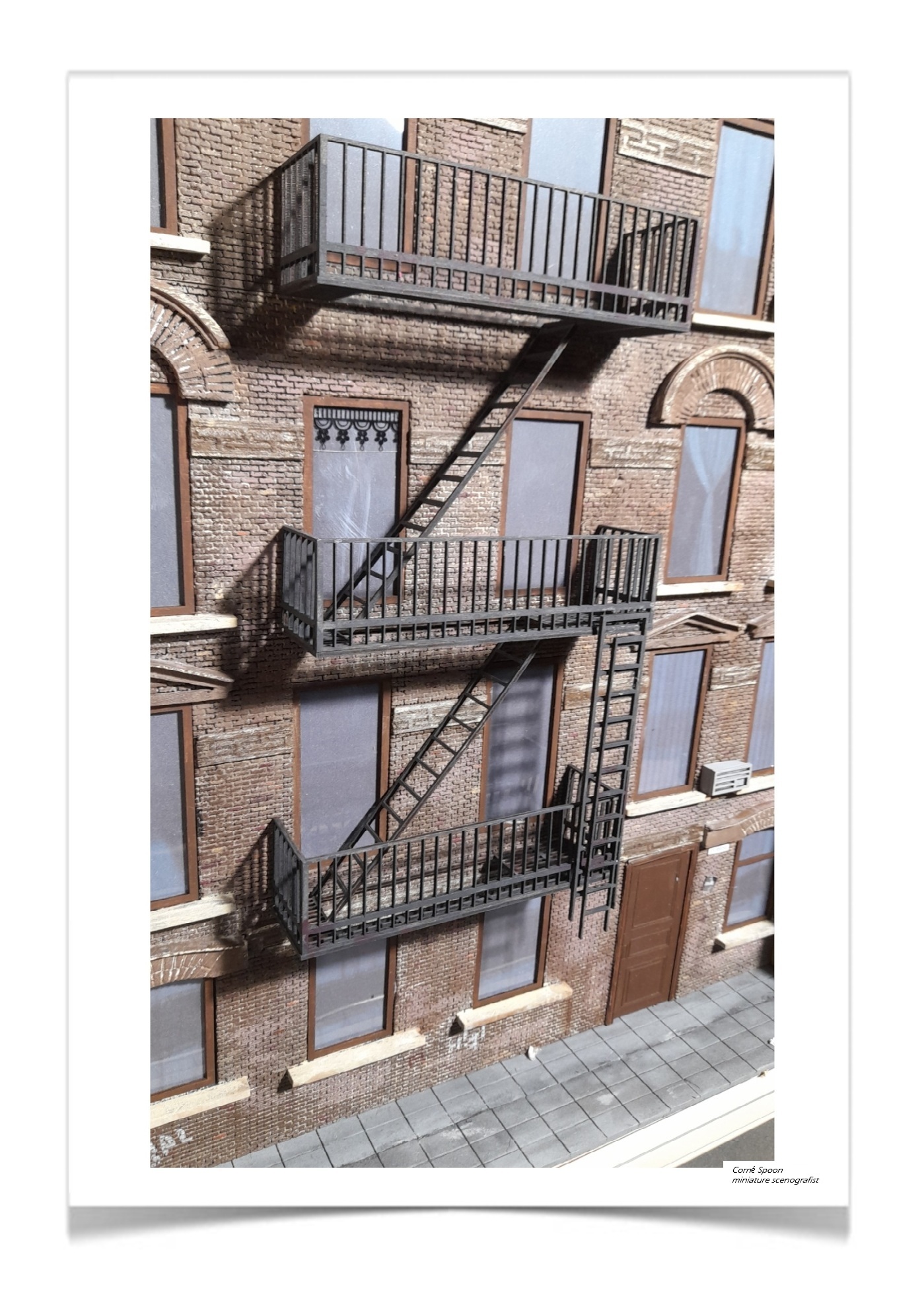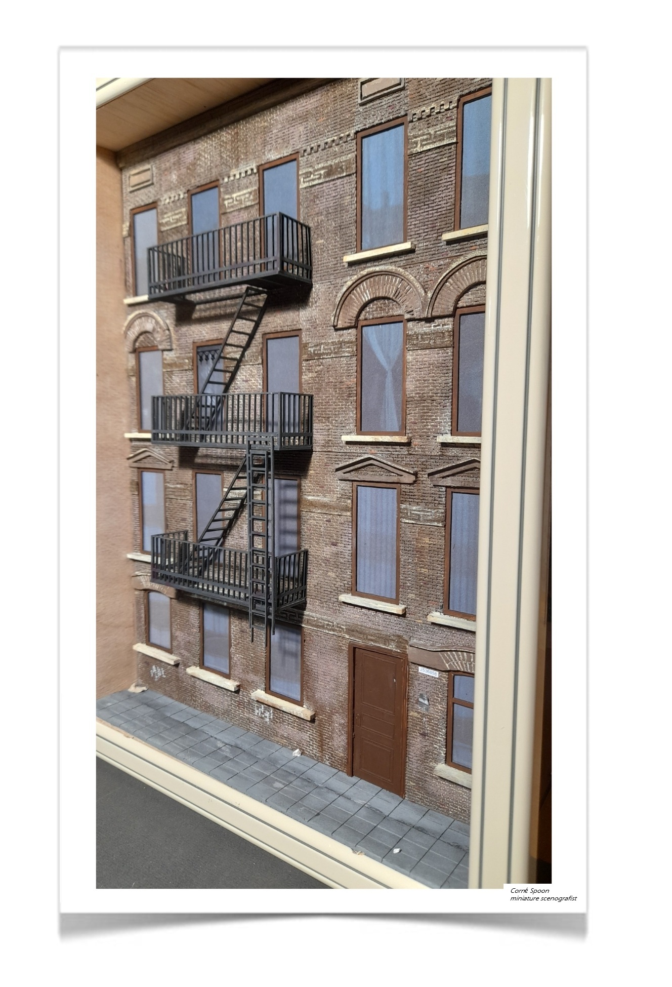 Deze miniatuur vangt de sfeer van een typisch stedelijk appartementengebouw met zijn kenmerkende brandtrappen. De gevel is opgebouwd uit realistisch metselwerk, met bogen boven de ramen en drie niveaus aan metalen balkons en ladders die direct doen denken aan New Yorkse straten. De matte ramen, het airco‑kastje en de eenvoudige toegangsdeur versterken het gevoel van een drukke, wat verweerde stadsomgeving. De stoep aan de voet van het gebouw maakt het tafereel compleet. Het geheel straalt vakmanschap uit en vertelt in één oogopslag het verhaal van een levendige, compacte stad.