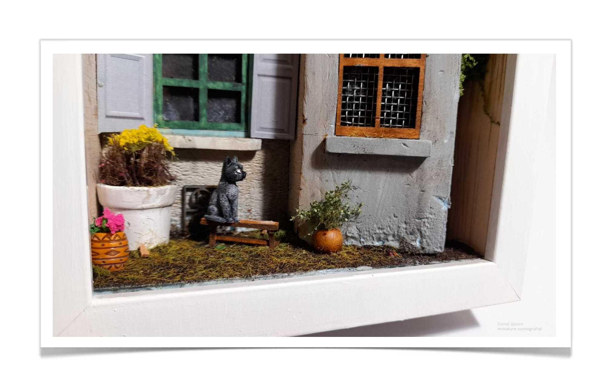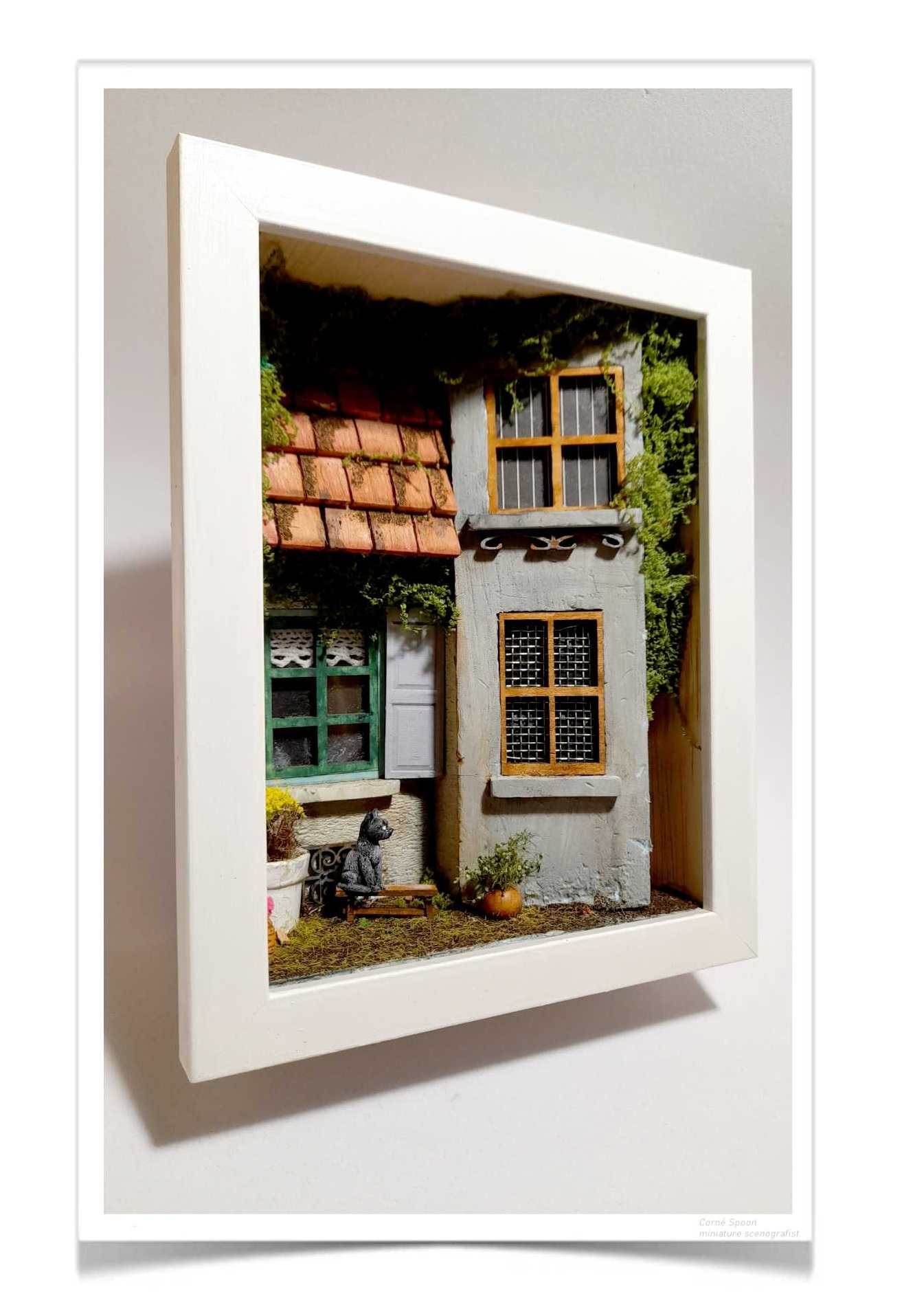 “Haal de charme van het platteland in huis met deze met de hand gemaakte miniatuur. De verweerde blauwe gevel, het roze raamkozijn en de met bloemen begroeide stenen muur creëren een warme, rustieke sfeer. Elk detail — van het houten bankje tot het kleine hondenbeeldje — vertelt een verhaal. Een uniek kunstwerk dat elke ruimte verrijkt en liefhebbers van miniaturen, ambacht en landelijke romantiek zal betoveren.