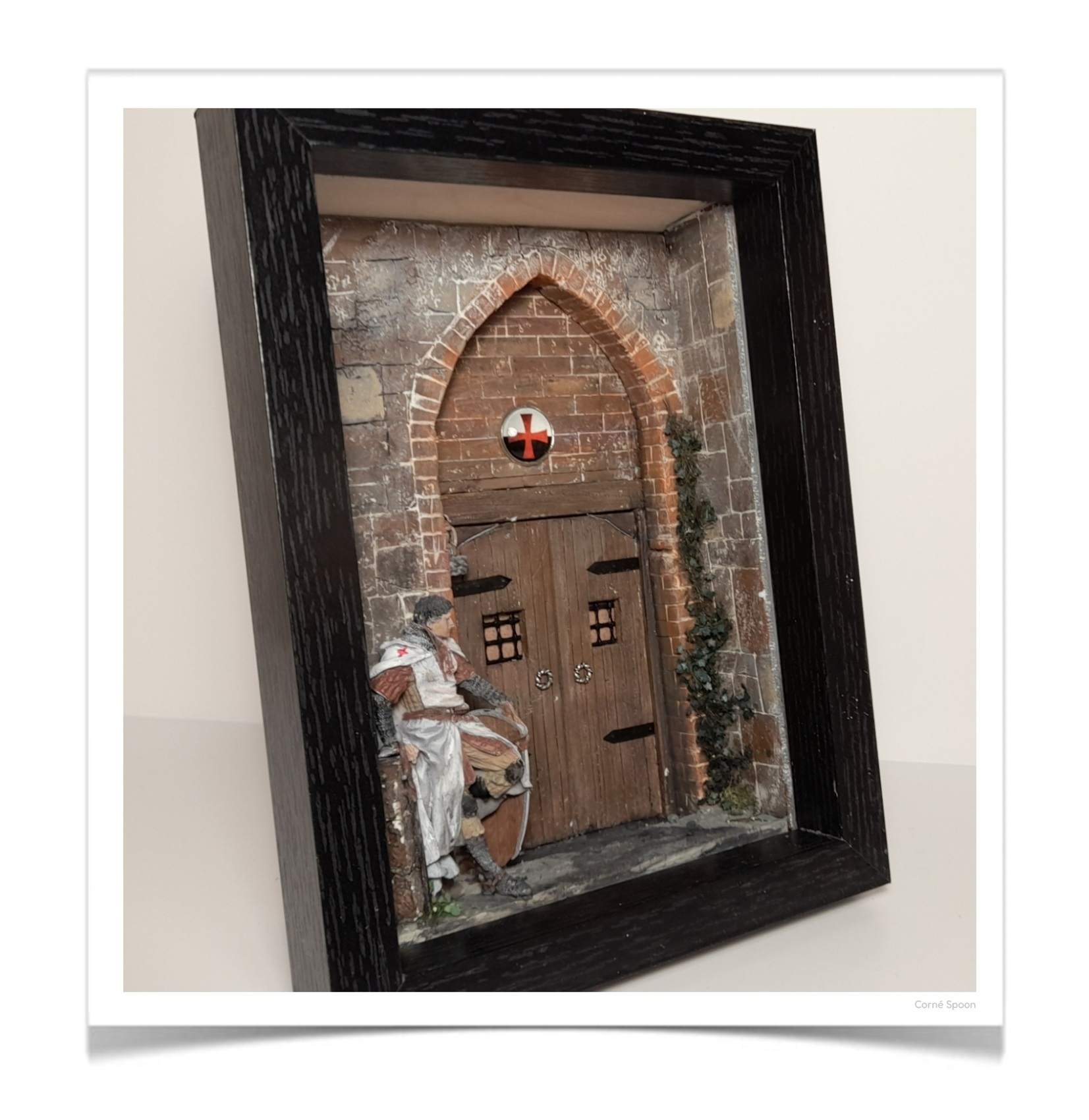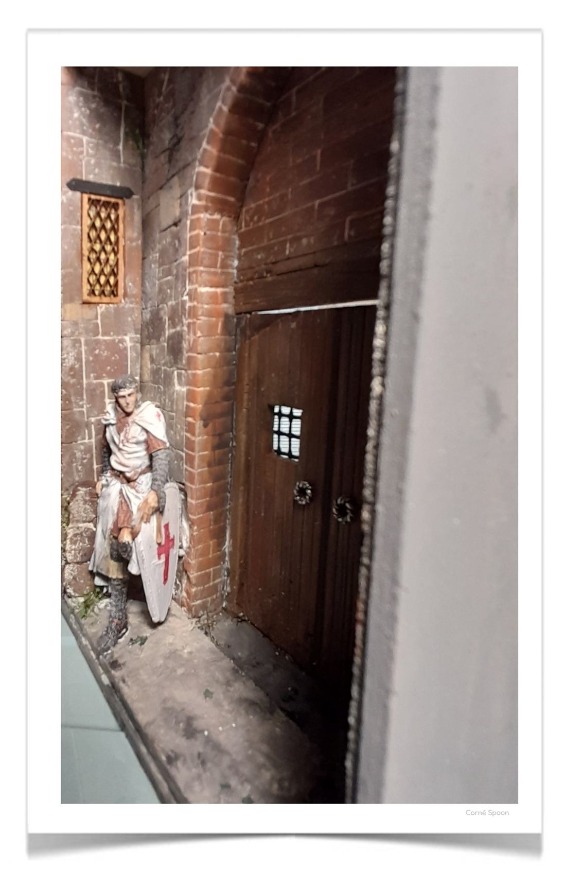 Prachtig gedetailleerde middeleeuwse diorama met een Tempelier-ridder bij een kasteelpoort. Dit sfeervolle stuk is rijk uitgevoerd met realistische steenstructuren, houten deuren en authentieke details. De handgeschilderde ridder straalt waakzaamheid en historie uit en maakt dit een echte blikvanger. Ideaal voor liefhebbers van middeleeuwen, ridders, fantasy of miniaturen