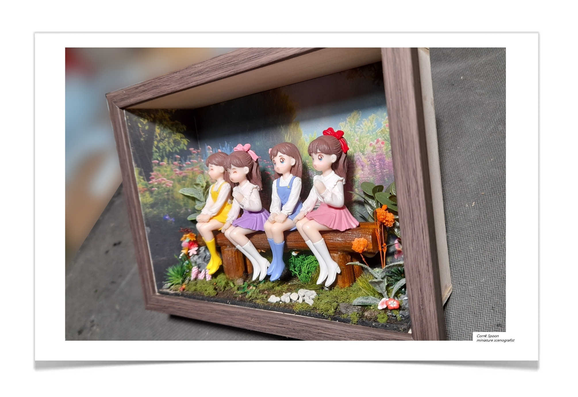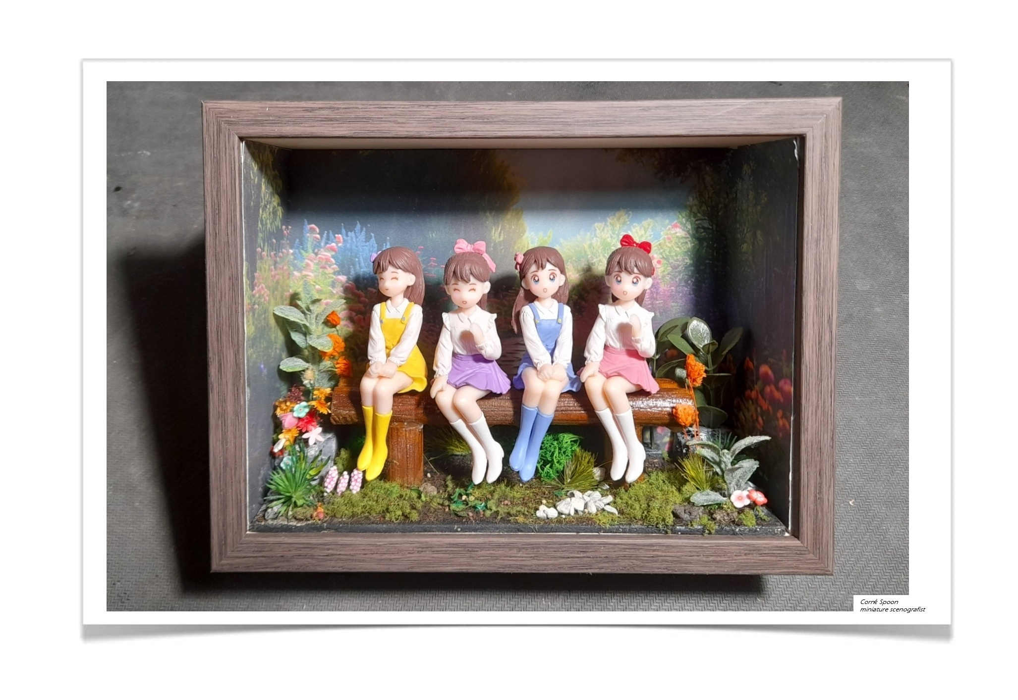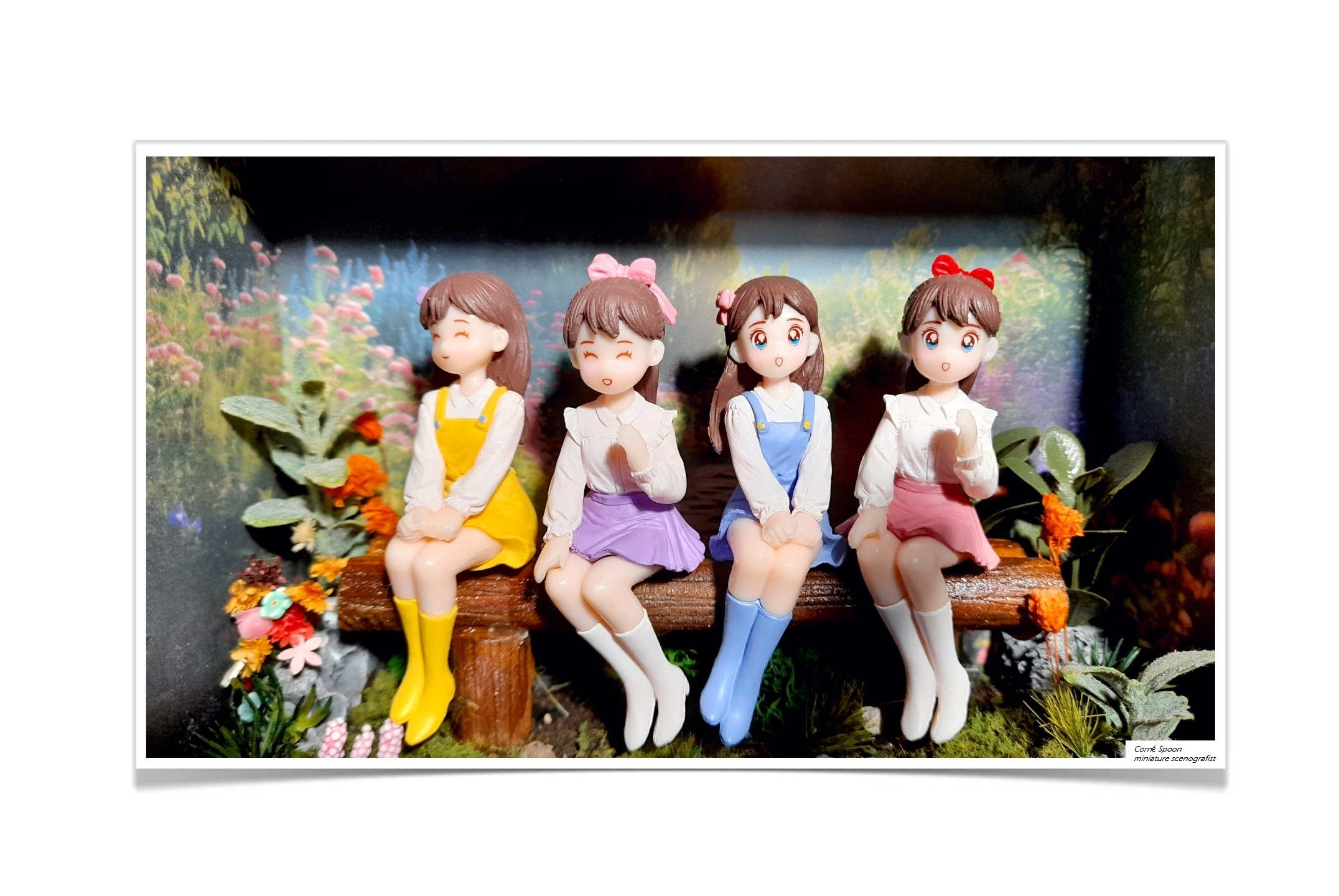 Ik zag viertal miniatuur meisjes liggen in een doosje onder in de kast. Ooit een keer gekocht op een rommelmarkt. En direct had ik een voorstelling vaneen bankje waarop ze zouden zitten, in een parkje vol met bloemen. En zo geschiedde het...