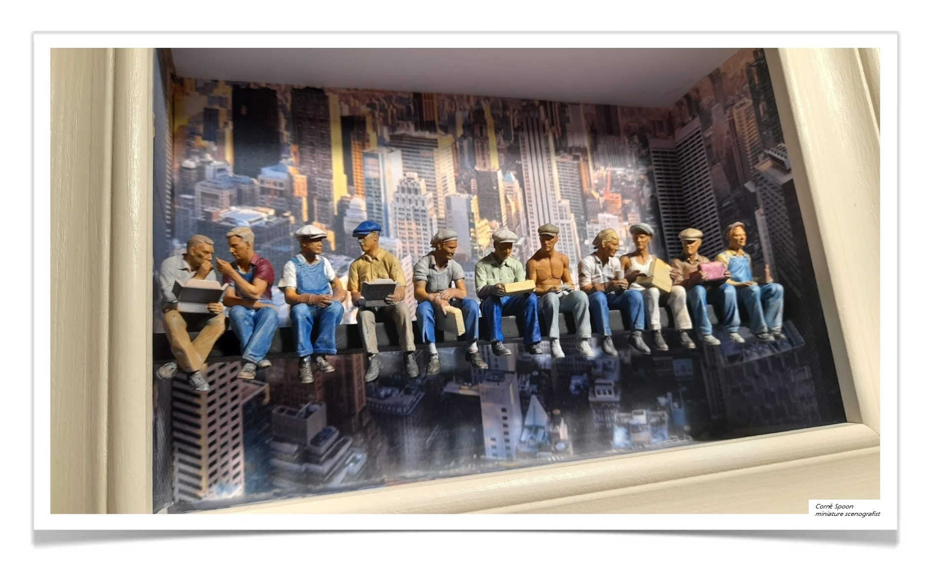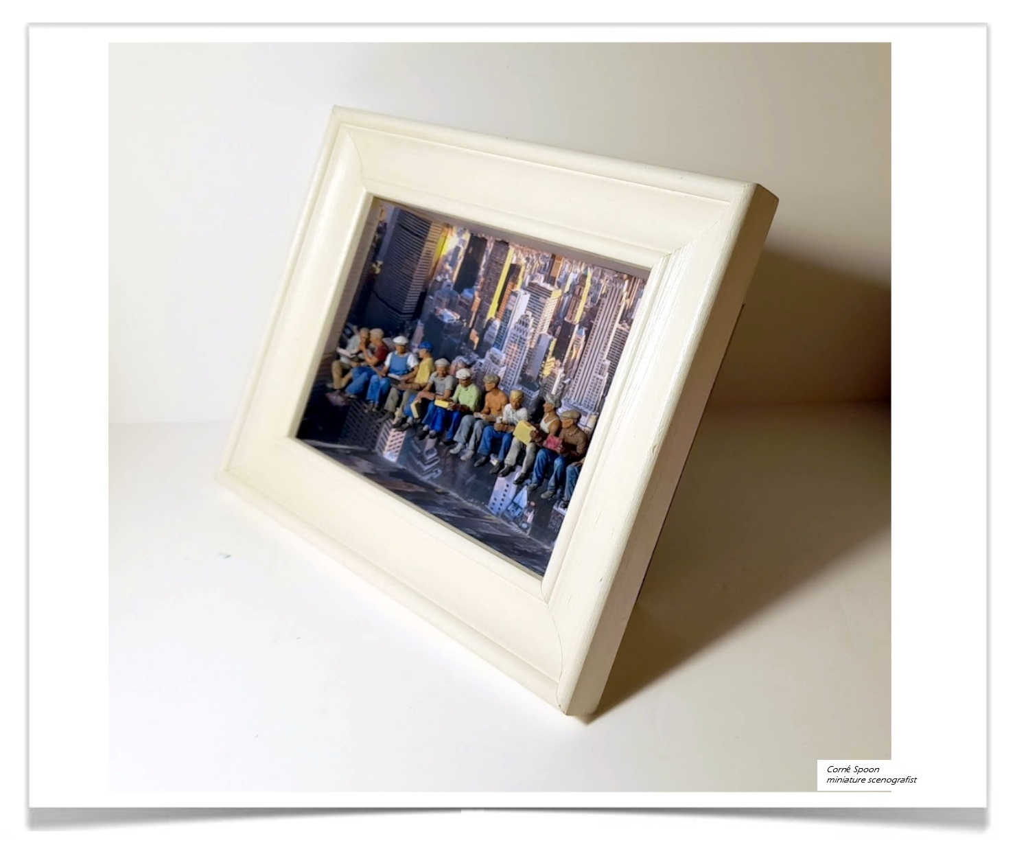 Op de foto zijn elf bouwvakkers te zien die ogenschijnlijk nonchalant op grote hoogte op een steunbalk zitten te lunchen terwijl hun voeten naar beneden bungelen. Ik heb ze na laten maken, zelf geverft en in een lijstje gedaan. Schaal is 1:35