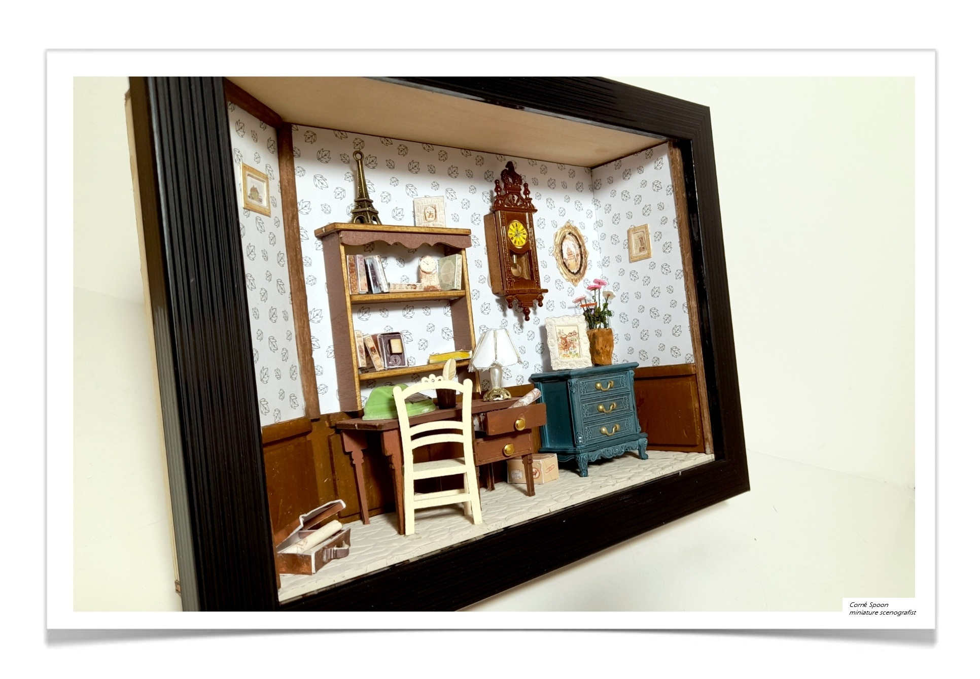 Deze miniatuur toont een sfeervolle vintage kamer vol karakter: bloemrijk behang, houten lambrisering en zorgvuldig geplaatste meubels zoals een bureau met lamp en boeken, een groene stoel en een kast vol miniatuurboeken en decoraties. Kleine details – een klok, ingelijste afbeeldingen, een vaas met bloemen en een blauwe ladekast – geven het geheel een huiselijke, bijna nostalgische warmte. Zelfs het kleine koffertje op de vloer vertelt een verhaal. Wat het zo mooi maakt, is de harmonie tussen kleur, textuur en detail: een intiem wereldje dat direct tot de verbeelding spreekt.