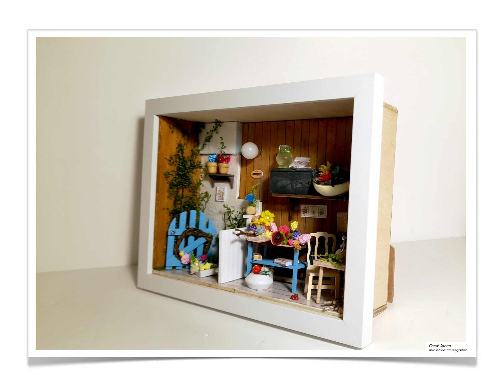 Deze miniatuur toont een sfeervolle bloemenkamer vol kleur en leven. Links staat een blauw deurtje met krans, omringd door potplanten en klimmend groen. In het midden vult een werktafel zich met boeketten en losse bloemen, met een stoel die uitnodigt om even plaats te nemen. Boven de tafel staan kleine decoraties, rechts zorgen een plantenspuit, een dienblad met groen en een raam voor ambachtelijke charme. De vele details en warme compositie maken dit tot een betoverend, levendig miniatuurwereldje.