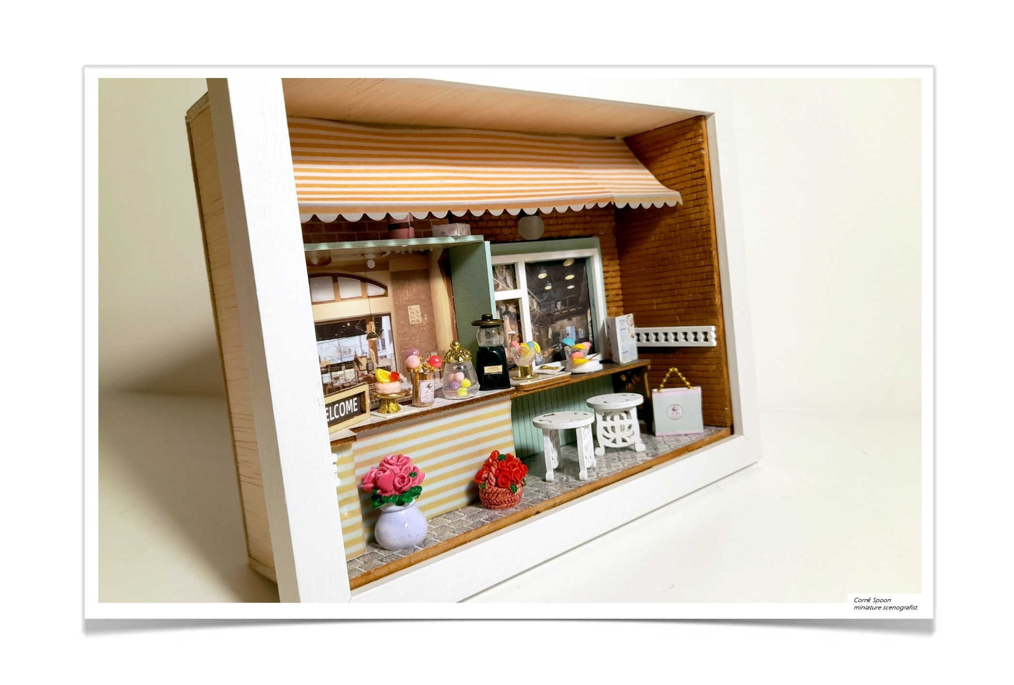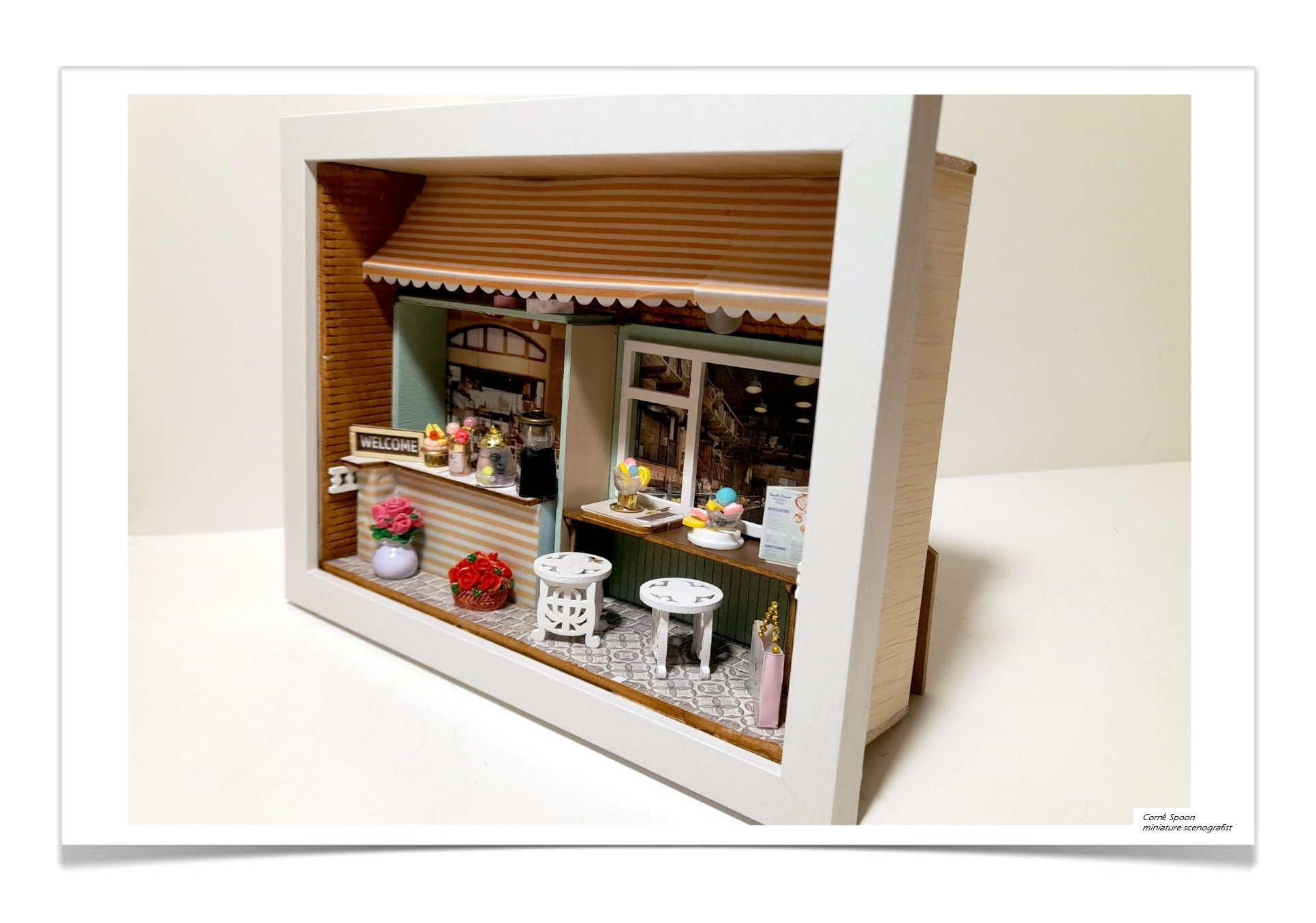 Deze miniatuur toont een charmant te ijssalon met een fris oranje-wit gestreept luifeltje en een uitnodigende toonbank vol taartjes, potjes en een koffiemachine. Twee witte krukken nodigen uit om even neer te strijken, terwijl het menu en de kleine decoraties het geheel een levendige, gezellige sfeer geven. De achtergrond creëert diepte en laat het lijken alsof de zaak echt doorloopt. Bloemen, een tasje en subtiele details maken het tafereel compleet.