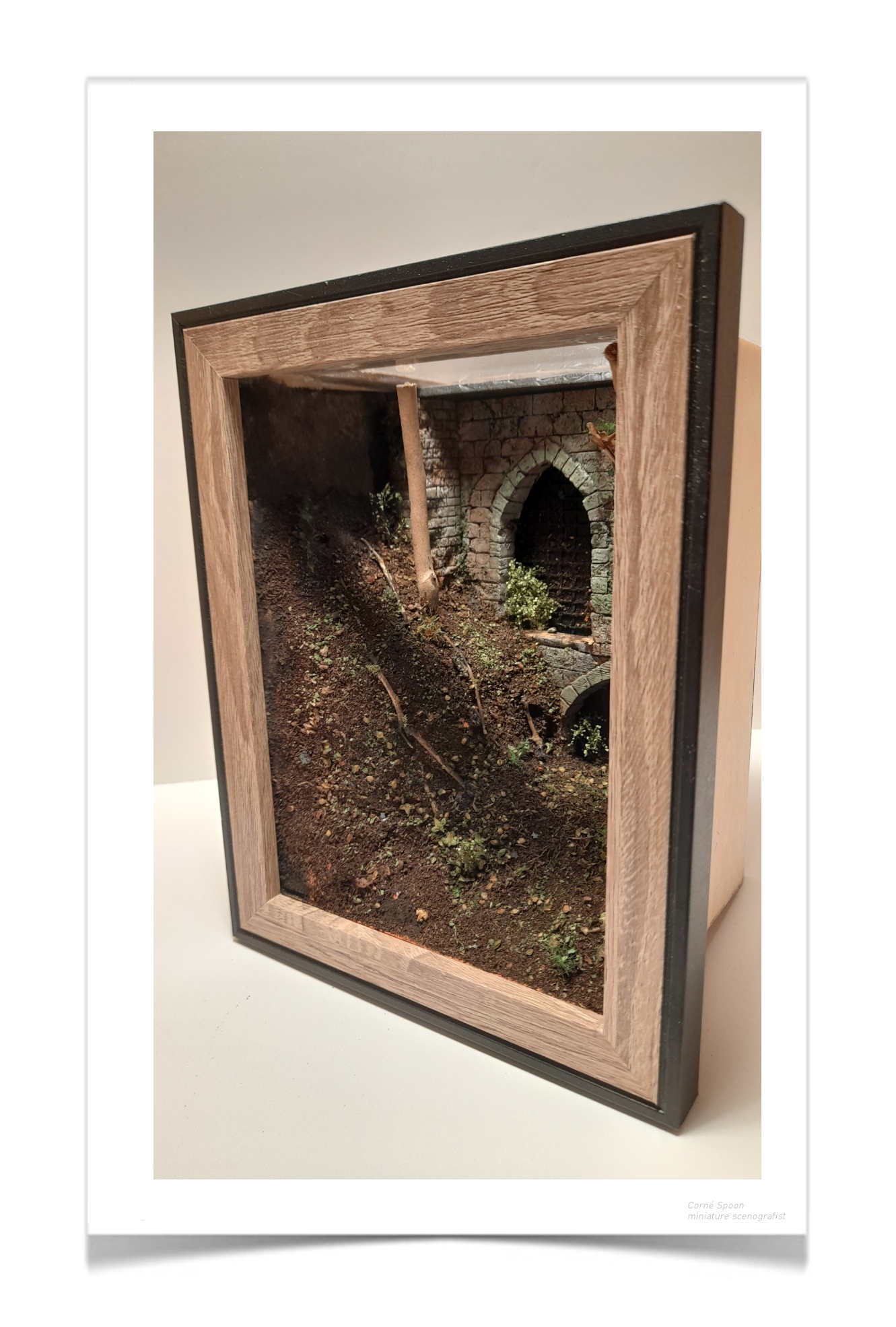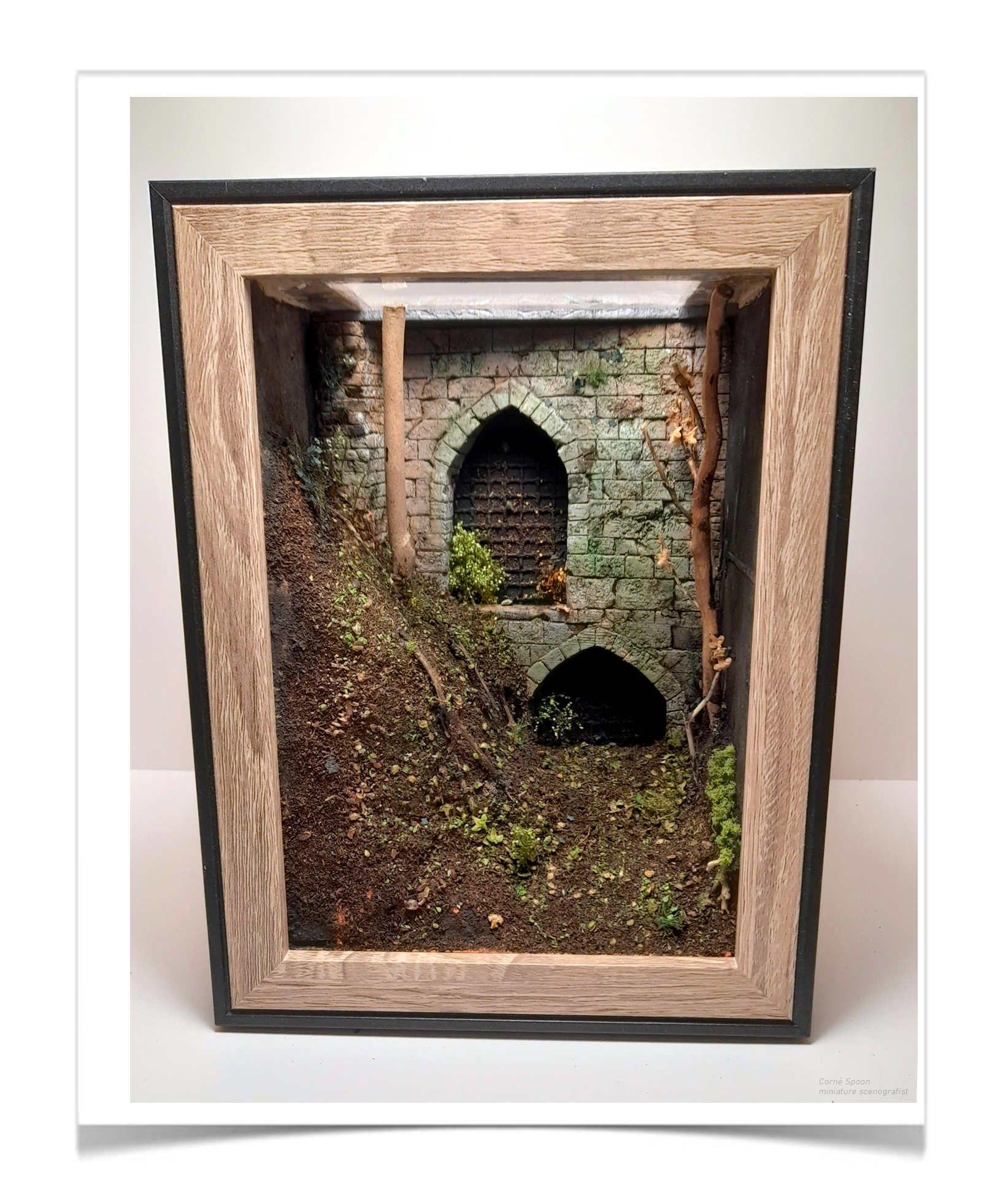De onderste boog leidt naar de vochtige kelders, waar volgens de lokale folklore nog steeds een kist met gouden dukaten staat—bewaakt door een nukkige trol. De bovenste poort, afgesloten met een zwaar ijzeren hek, fluistert verhalen over ridders die hier heimelijk ontsnapten aan de vijand. Wie goed kijkt, ziet de takken trillen. Is het de wind, of zoekt er een piepkleine bewoner een weg door het mos naar buiten?