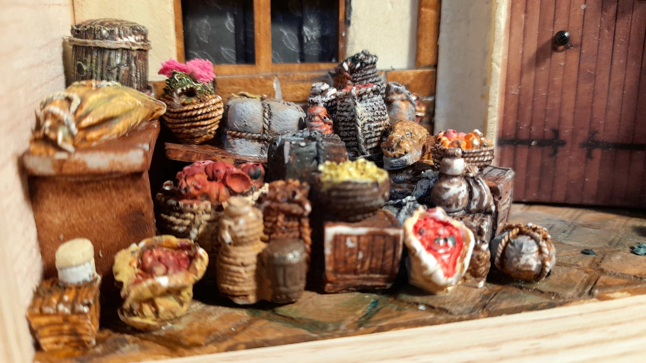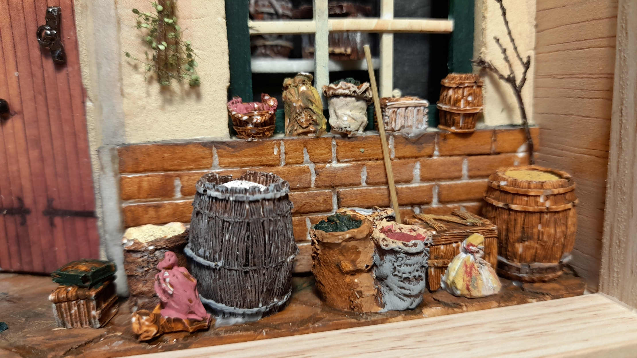 Deze sfeervolle gevel in rustieke stijl zit vol karakter: een houten boogdeur, authentieke ramen en een rijk gedetailleerde marktsetting met vaten, manden, kruiden en kleine handelswaren. Elk element is met zorg vervaardigd, waardoor het geheel een warme, historische uitstraling krijgt.