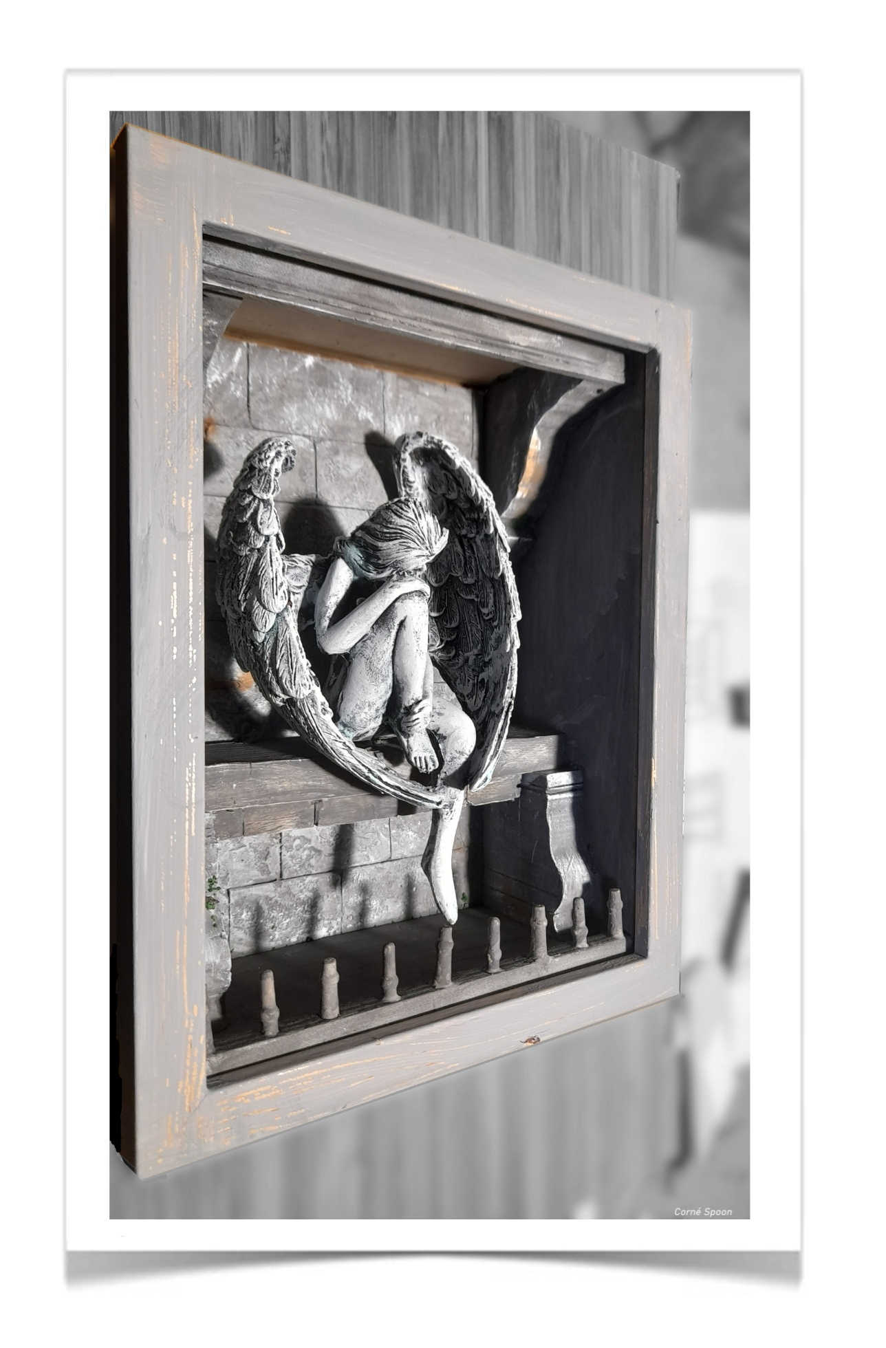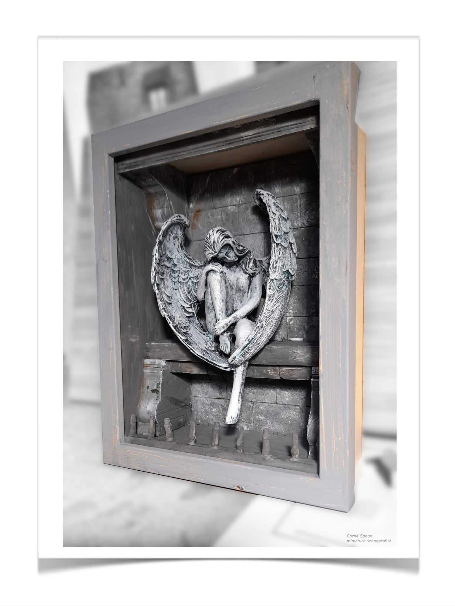 Dit miniatuur toont een engel dat ineengedoken op een bank zit, een moment van pure introspectie. De houding – hoofd op de knieën, vleugels als een beschermende mantel – geeft het tafereel een kwetsbare, bijna tijdloze emotie. De ruwe, sobere omgeving versterkt dat gevoel van stilte en afzondering. Onder de bank staan kleine figuurtjes die een symbolische laag toevoegen, alsof herinneringen of toeschouwers zwijgend aanwezig zijn. De kracht van dit werk zit in de combinatie van verfijnde details en een diep menselijke sfeer, waardoor het direct raakt.