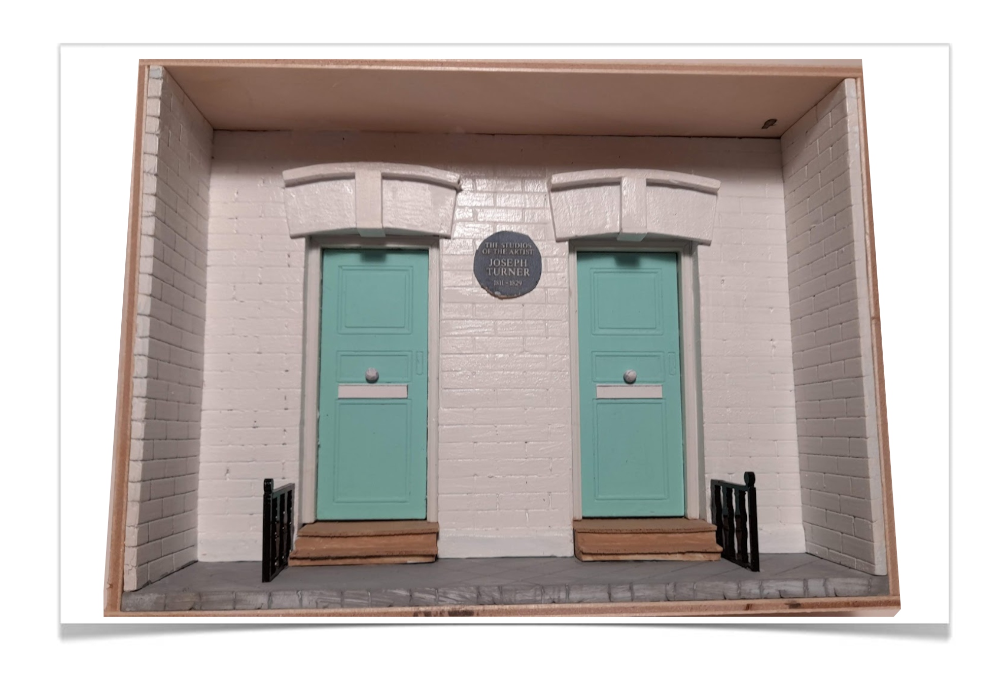 De twee groene deuren, elk met hun eigen karakter, lijken verhalen te bewaren van kunstenaars, bezoekers en voorbijgangers. De witte bakstenen muur en de smalle trappen met hun donkere leuningen geven het geheel een bijna Londense charme. Boven de linker deur prijkt een ronde plaquette die herinnert aan een tijd waarin creativiteit hier een thuis vond. Het is een klein, verstild fragment van een plek waar inspiratie ooit dagelijks door de ramen naar binnen viel — zorgvuldig gevangen in een intiem, tijdloos tableau.