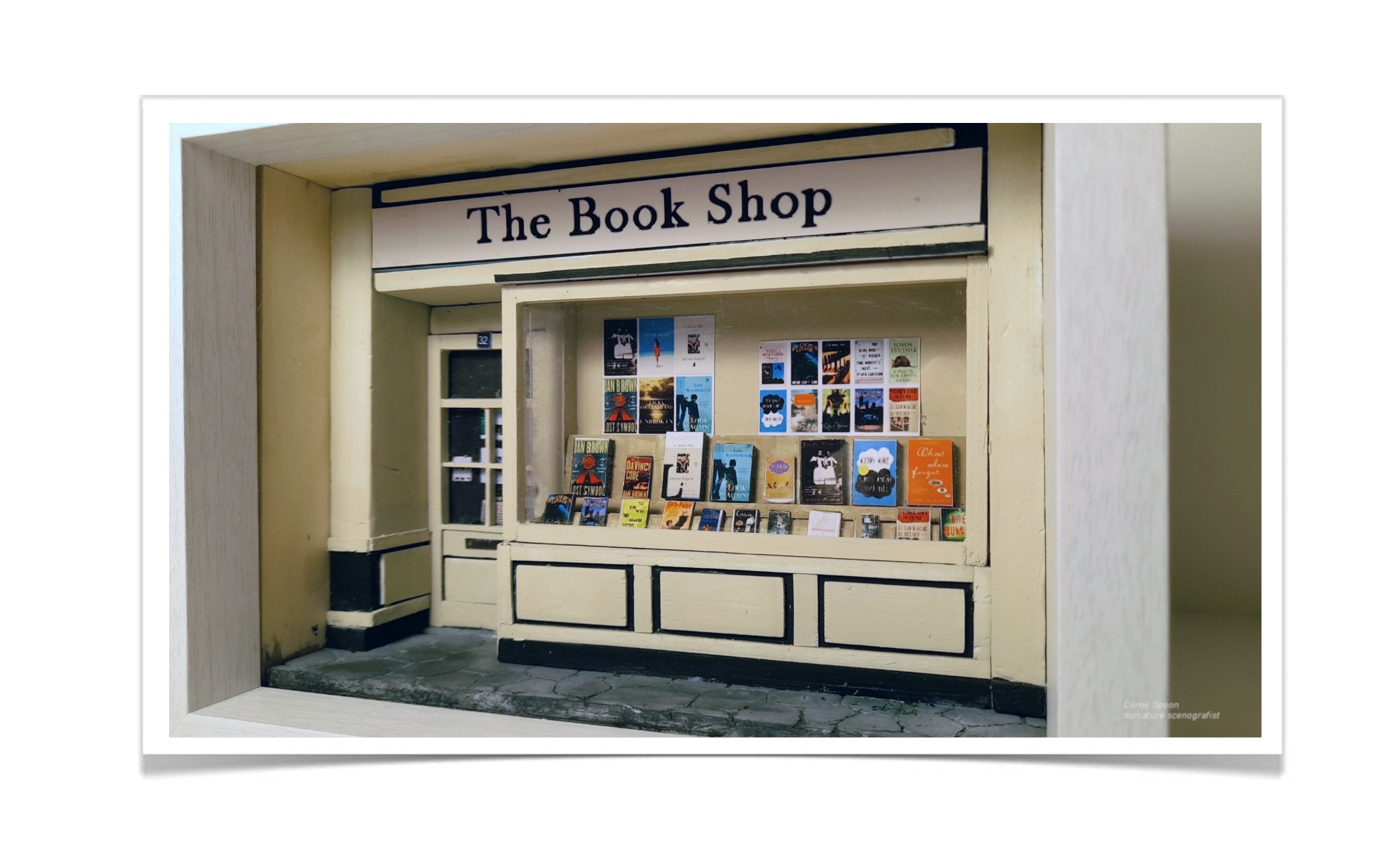 een kleine boekwinkel waar verhalen tot aan het raam reiken. De crèmekleurige gevel met zwarte accenten straalt rust uit, terwijl de etalage gevuld is met kleurrijke boekomslagen die nieuwsgierigheid wekken alsof je zo naar binnen wilt stappen. De deur met het nummer 32 lijkt te wachten op een bezoeker die even wil verdwalen tussen de planken. Het stenen trottoir ervoor maakt het tafereel compleet — een stil, intiem moment uit een straat waar boeken nog een eigen thuis hebben.