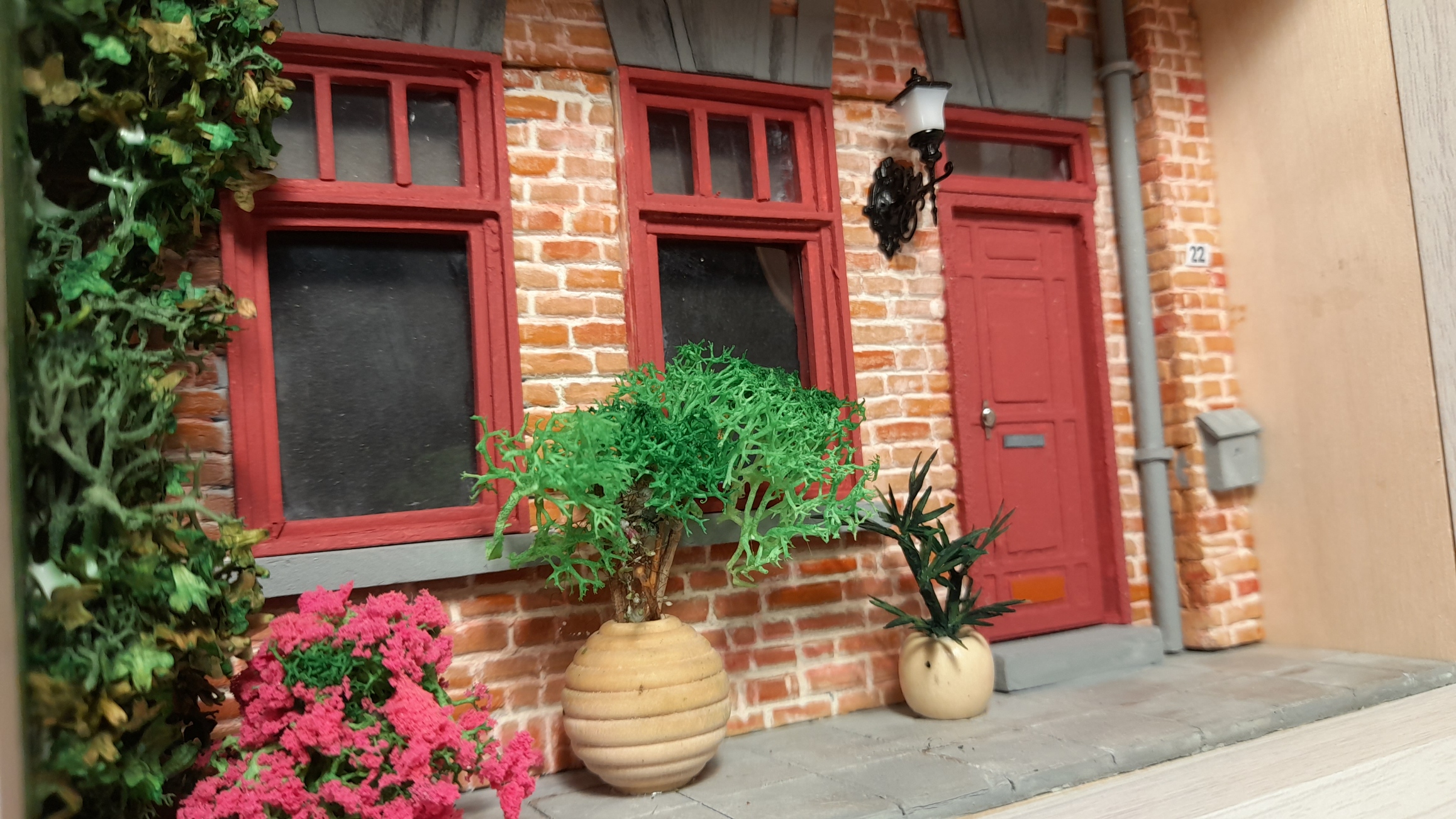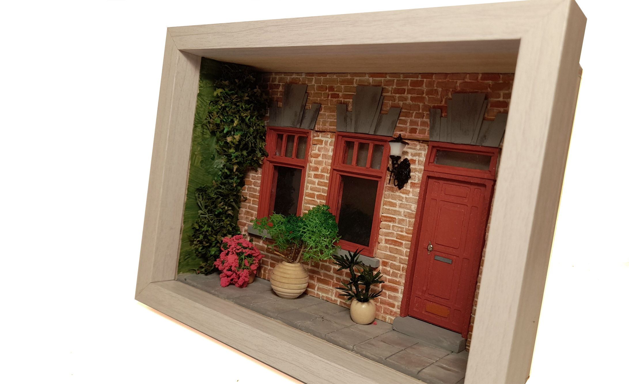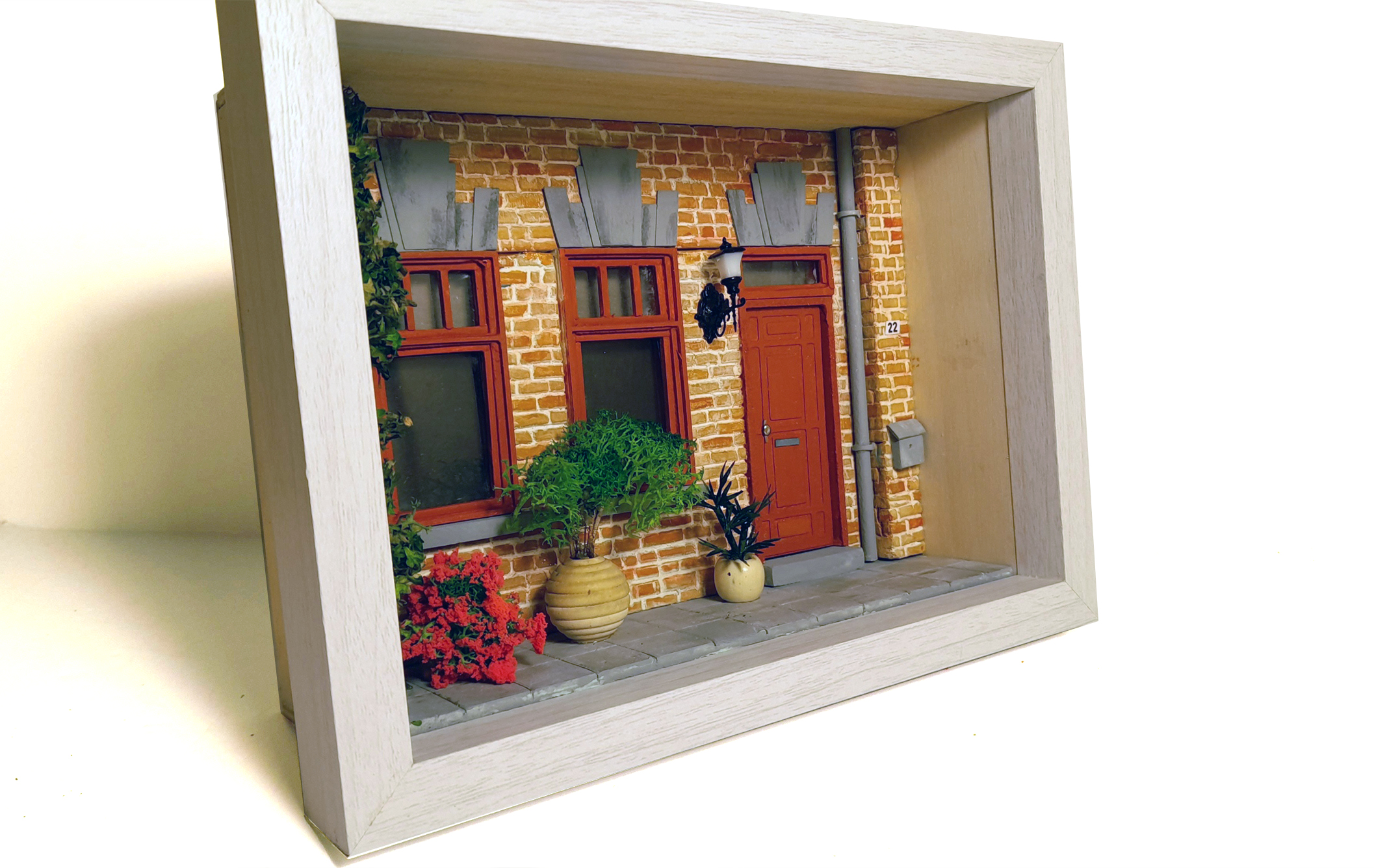 Bewonder deze prachtige, handgemaakte diorama van een charmant, historisch pand. Een miniatuur wereld, gevangen in een elegant frame. Perfect als cadeau of om een vleugje nostalgie en karakter aan uw interieur toe te voegen.