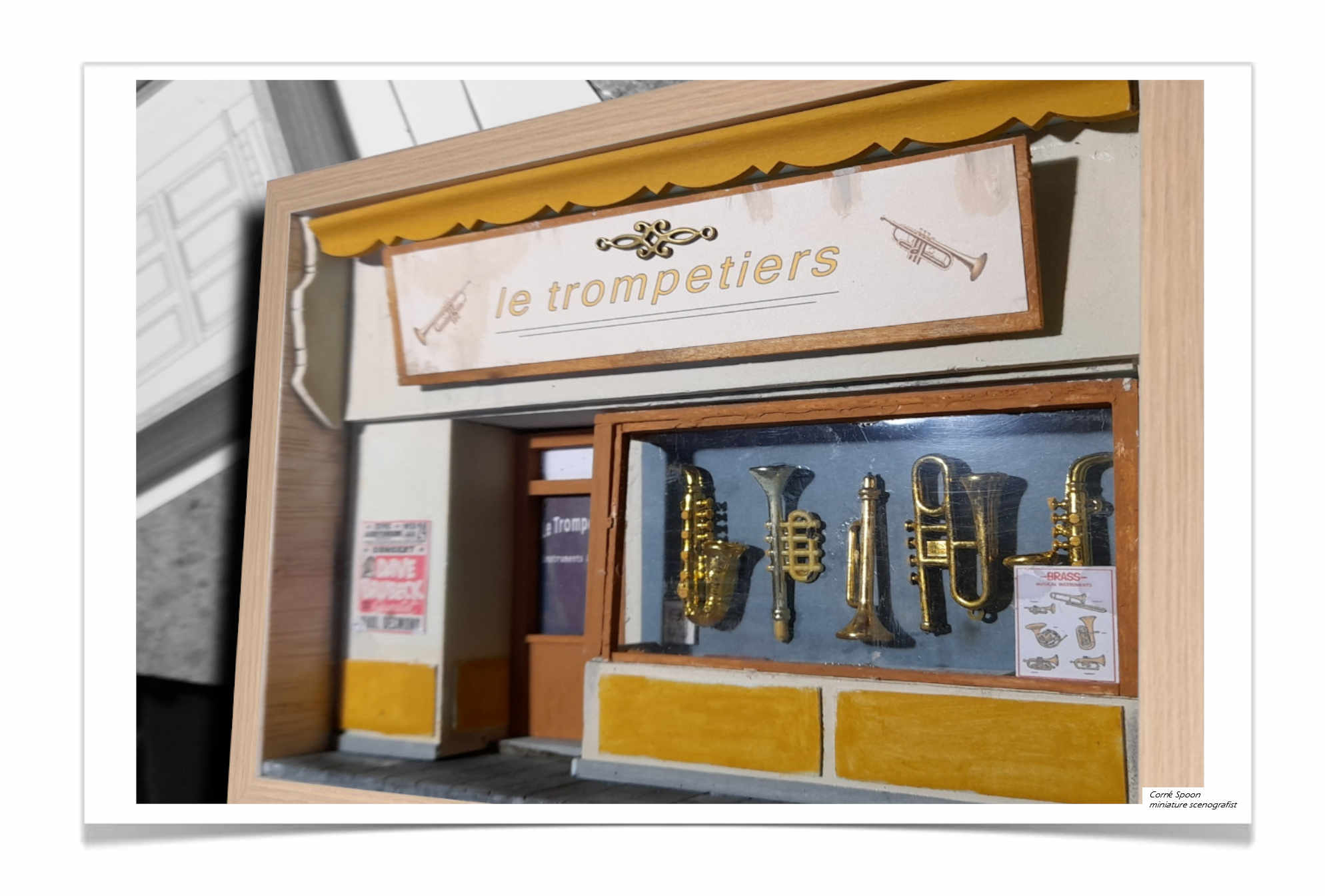 Deze miniatuur toont de gevel van Le Trompetiers, een winkel gespecialiseerd in blaasinstrumenten. In de etalage staan diverse koperinstrumenten uitgestald, waaronder een saxofoon, trompet, hoorn en tuba. Links hangt een concertaffiche, terwijl op de deur een bordje verwijst naar het assortiment van de winkel. De scène is uitgewerkt als een driedimensionale diorama binnen een houten lijst, met aandacht voor realistische details en sfeer.