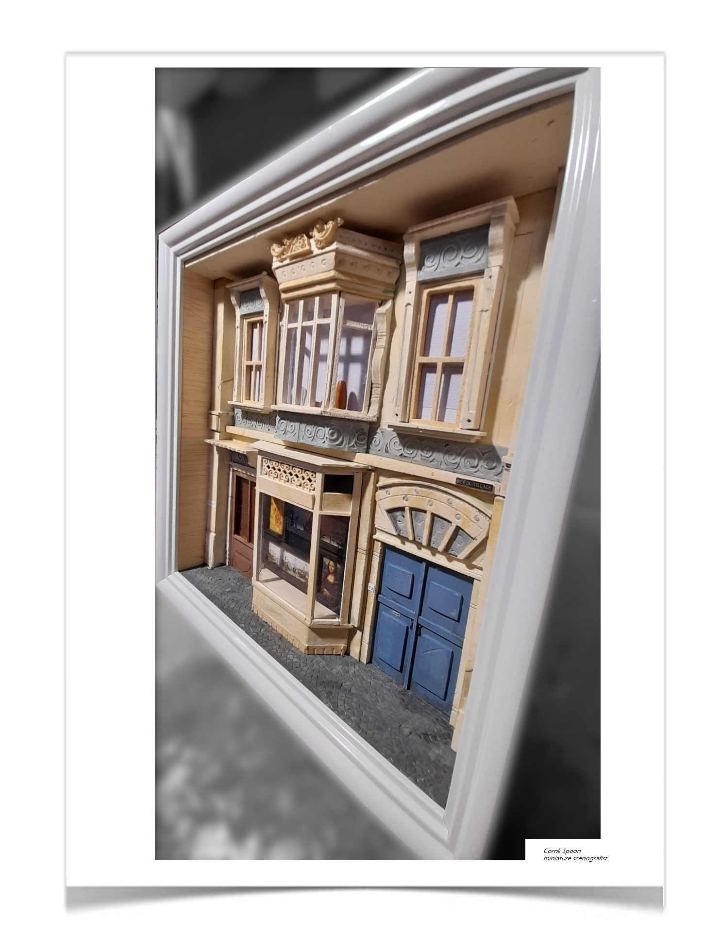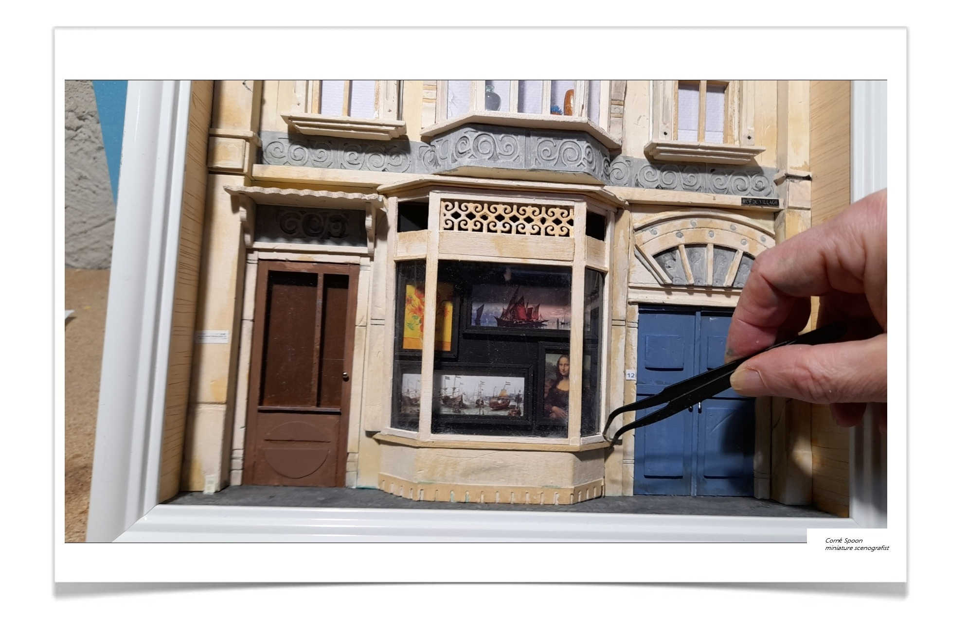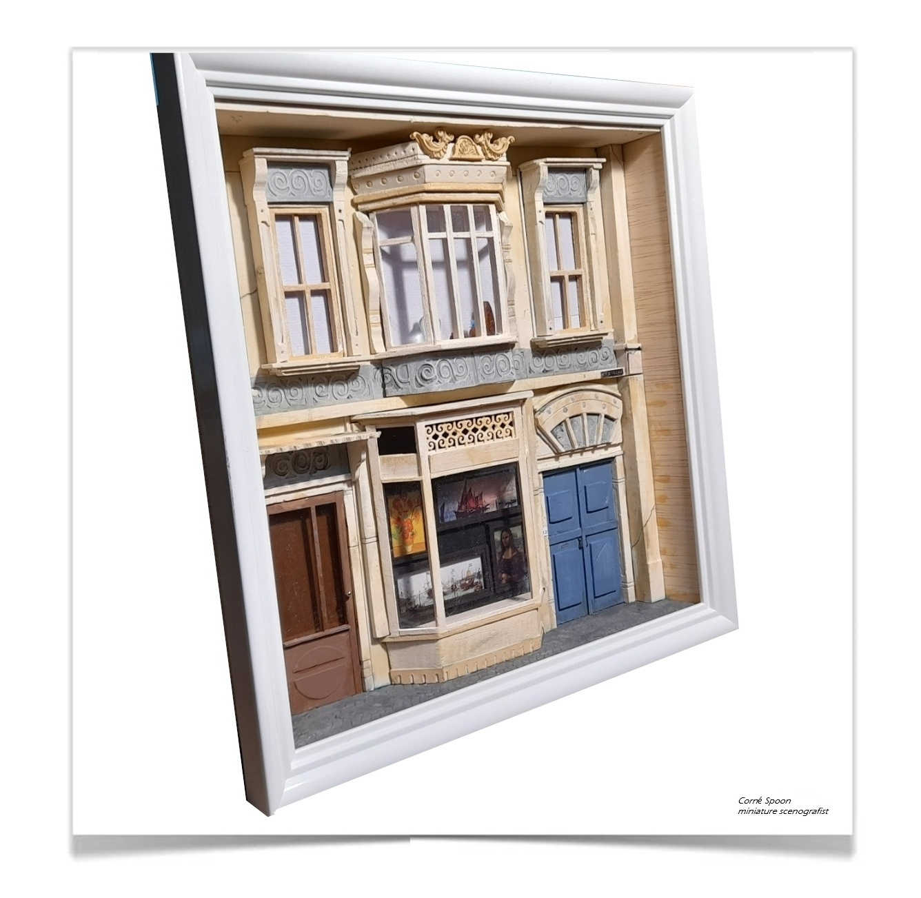 Deze miniatuur toont de gevel van een gebouw met diverse architectonische stijlelementen. De voorzijde bevat meerdere ramen met luiken, een centraal geplaatste erker en twee verschillend vormgegeven deuren. In de erker is een afbeelding van een schilderij van een schip zichtbaar, wat extra diepte en context aan de scène geeft. De gevel is rijk gedetailleerd met ornamenten en realistische texturen.
