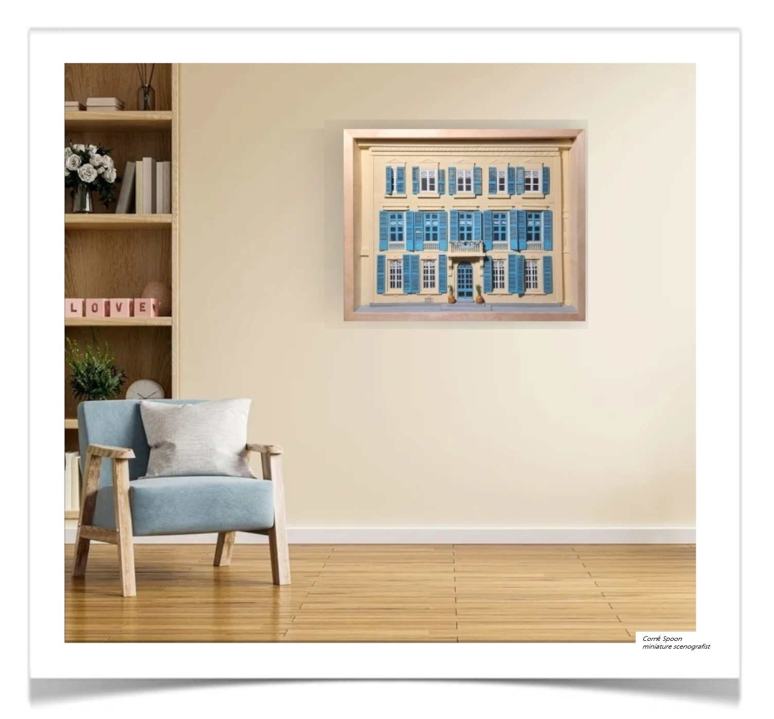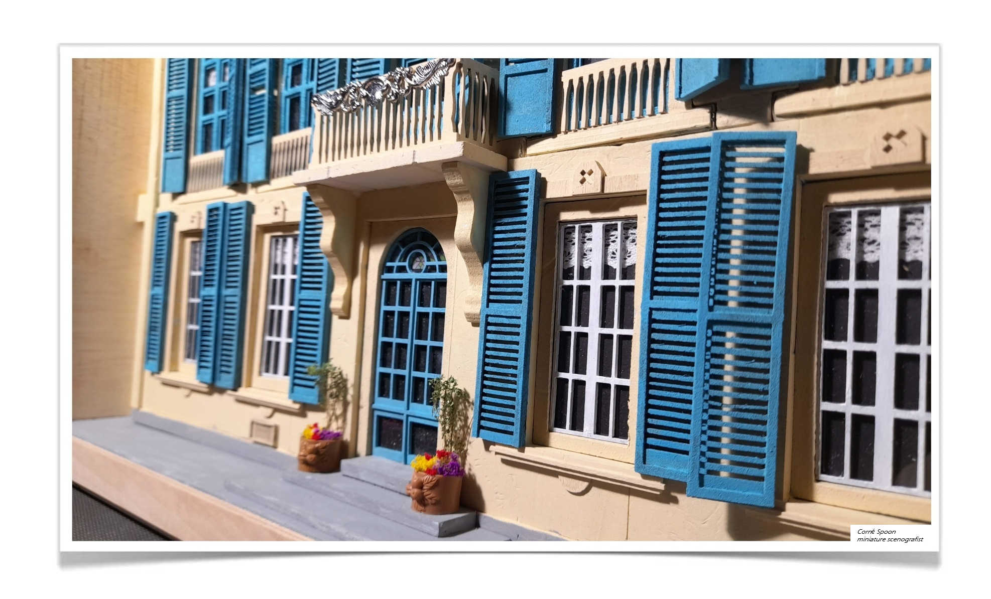 Deze miniatuur toont een gevel van een klassiek, symmetrisch gebouw met drie verdiepingen. Elke verdieping heeft ramen met blauwe luiken en witte decoratieve patronen. In het midden bevindt zich een klein balkon met een sierlijk hekwerk. De entree is uitgevoerd als een boogportaal, geflankeerd door twee planten in potten die extra detail en realisme geven. Het geheel is vormgegeven als een driedimensionale scenografie binnen een houten lijst.