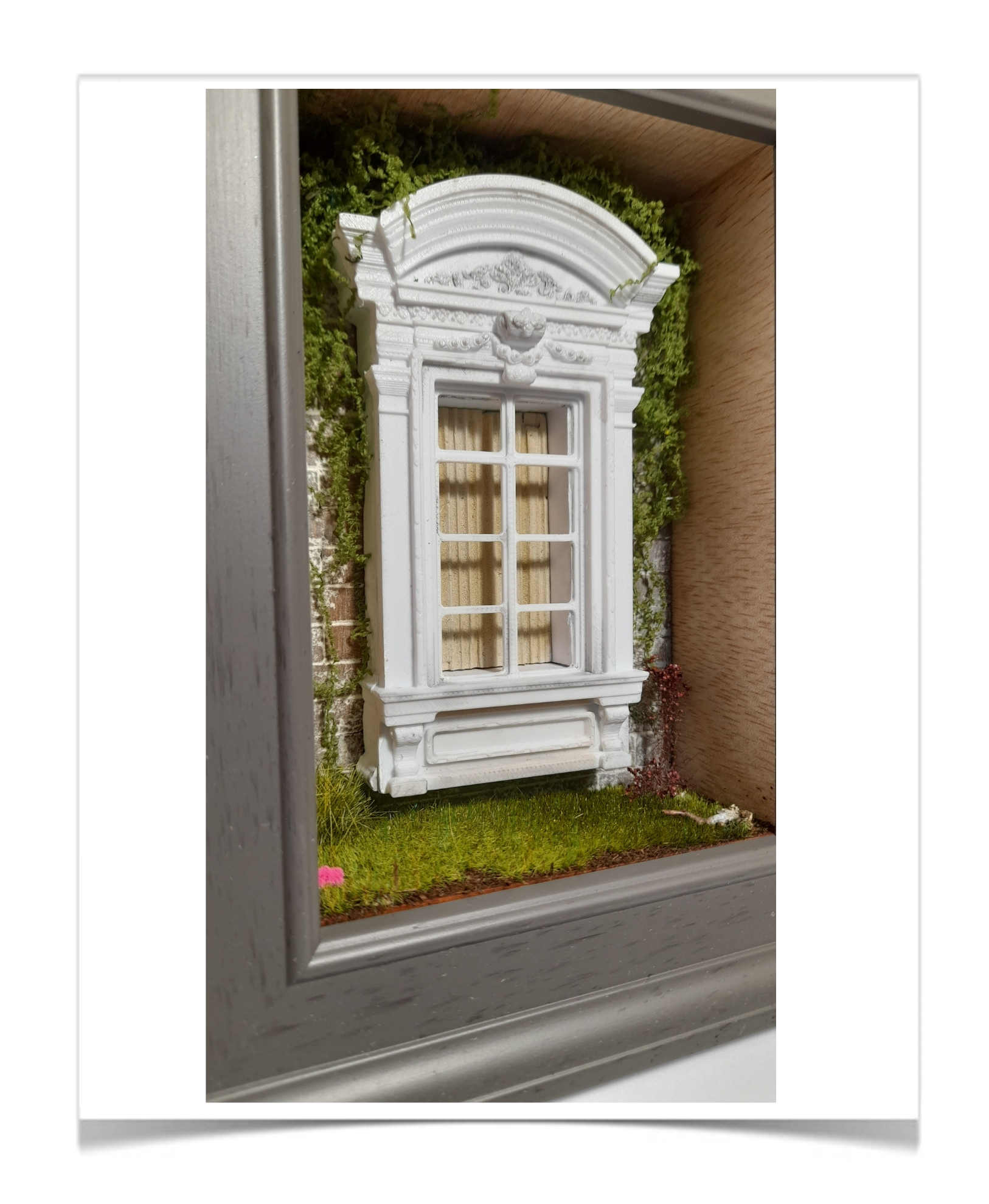 Deze miniatuur toont een klassiek vormgegeven raamnis met sierlijke architectonische details, zoals een pediment en pilasters. Achter het raam hangen lichte gordijnen die diepte en realisme toevoegen. De omliggende begroeiing en het gras met kleine bloemen creëren een natuurlijke, tuinachtige sfeer. Het geheel is uitgevoerd als een driedimensionale diorama in een shadowbox‑frame, waardoor het lijkt alsof je naar een klein stukje buitenwereld kijkt.