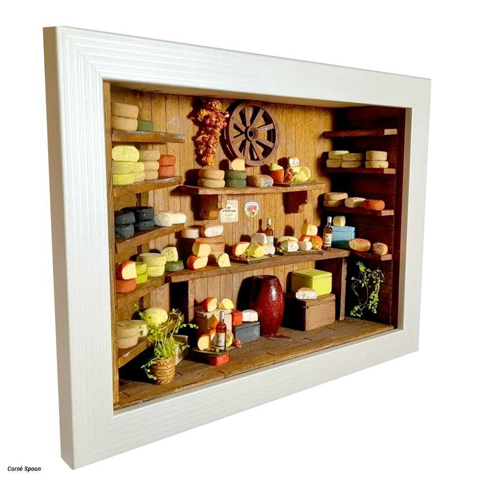 een heerlijk knus kijkje in een traditionele kaaskelder, waar houten planken vol liggen met ronde kazen in alle tinten geel en oranje. De flessen, kistjes en het oude wijnvat geven het gevoel dat hier al generaties lang met liefde wordt gewerkt. Een wagenwiel, hangende druiventrossen en een potplantje in de hoek brengen extra charme, alsof je zo een geurige, koele ruimte binnenstapt waar tijd geen haast kent.