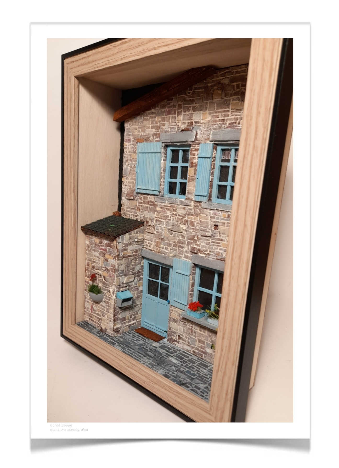 Deze miniatuur vangt de charme van een rustiek stenen huis, alsof het uit een stil dorpje in Zuid‑Europa is geplukt. Blauwe luiken staan open naar een zonnige dag, terwijl rode bloemen en groene planten het geheel kleur en leven geven. De verweerde stenen muur en het geplaveide pad suggereren jaren van verhalen en voorbijgangers. De houten lijst omlijst het tafereel als een klein venster naar een rustige, tijdloze plek waar het leven in een aangenaam tempo voorbij kabbelt.