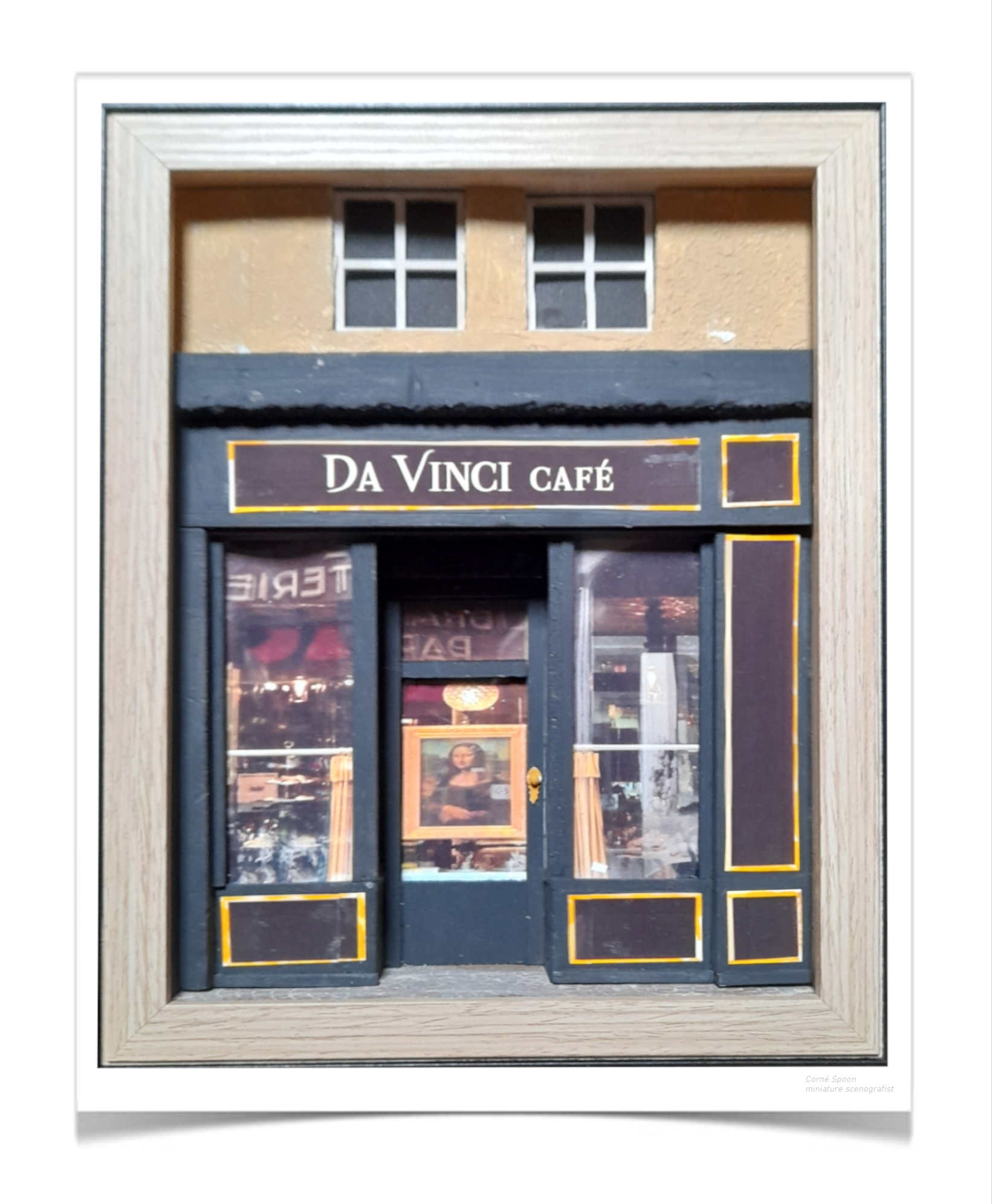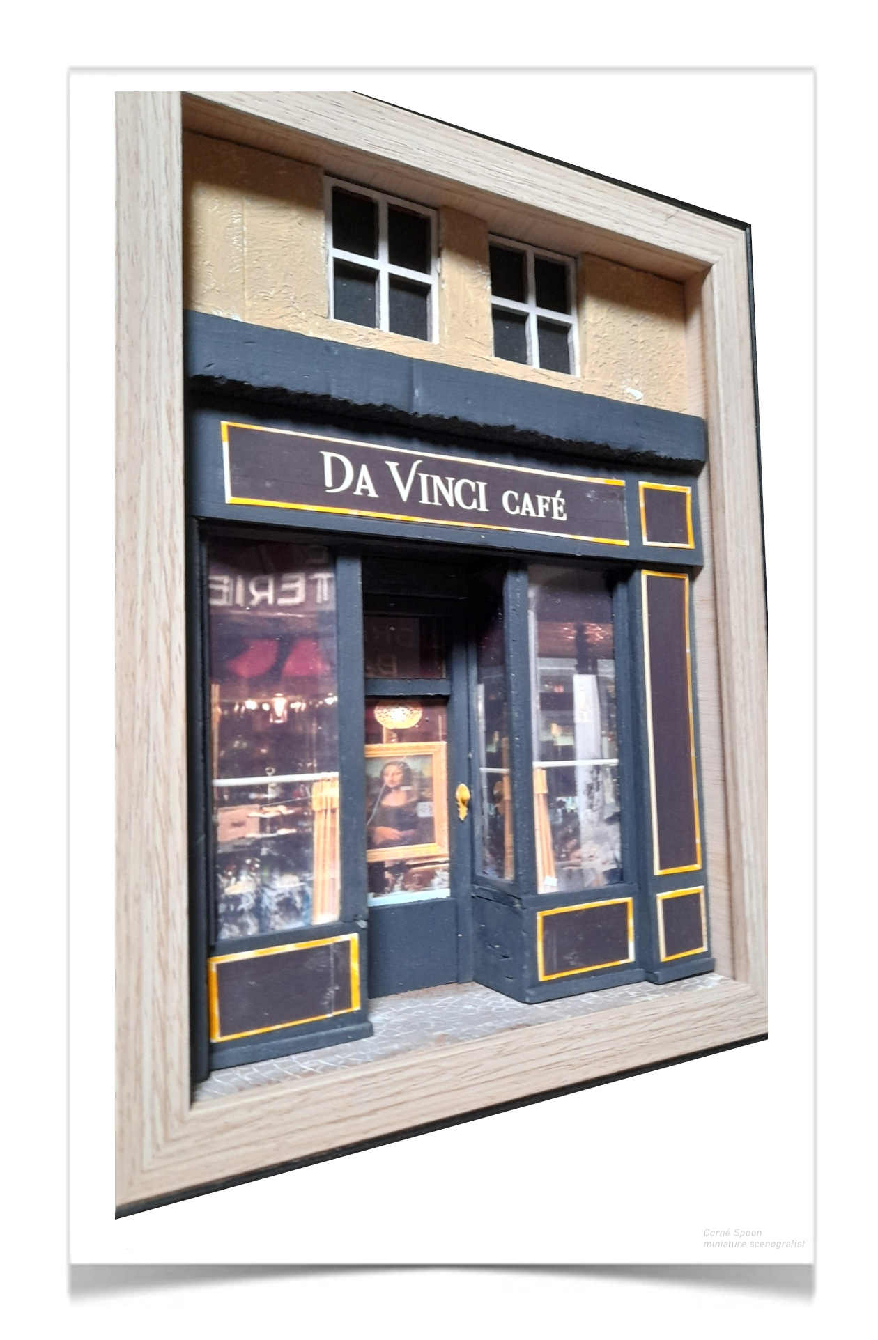 Deze miniatuur toont de bestaande gevel van het Da Vinci Café, uitgevoerd met een donkere luifel, grote ramen en een glazen deur. Boven de entree staat de naam van het café in witte letters. Door het raam is een interieur te zien met verlichting en een afbeelding die verwijst naar het werk van Leonardo da Vinci.