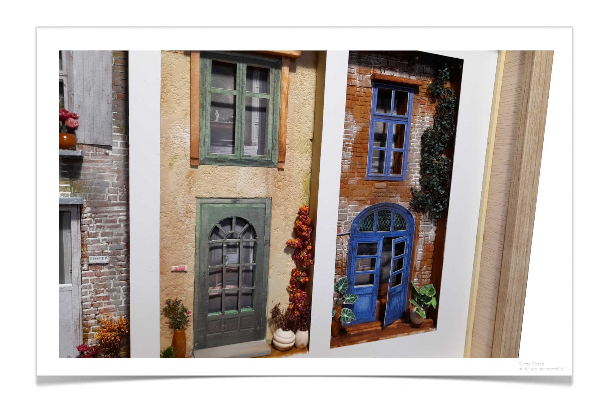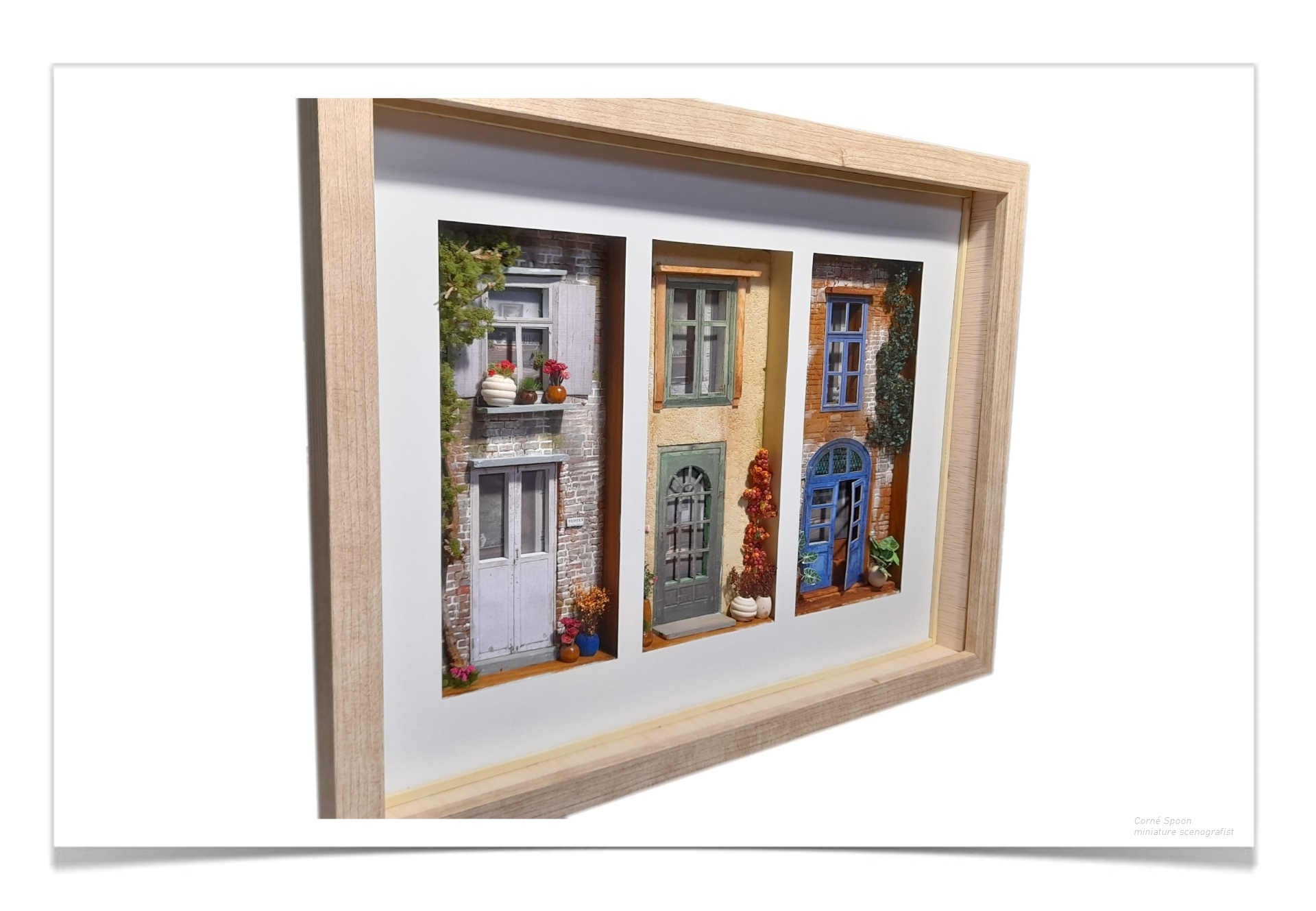 Drie werelden, één lijst. Dit handgemaakte drieluik toont een poëtische compositie van Europese gevels – elk met zijn eigen sfeer, kleur en verhaal. Van witte deuren met bloembakken tot blauwe poorten omringd door klimop: dit kunstwerk is een ode aan de schoonheid van het alledaagse.