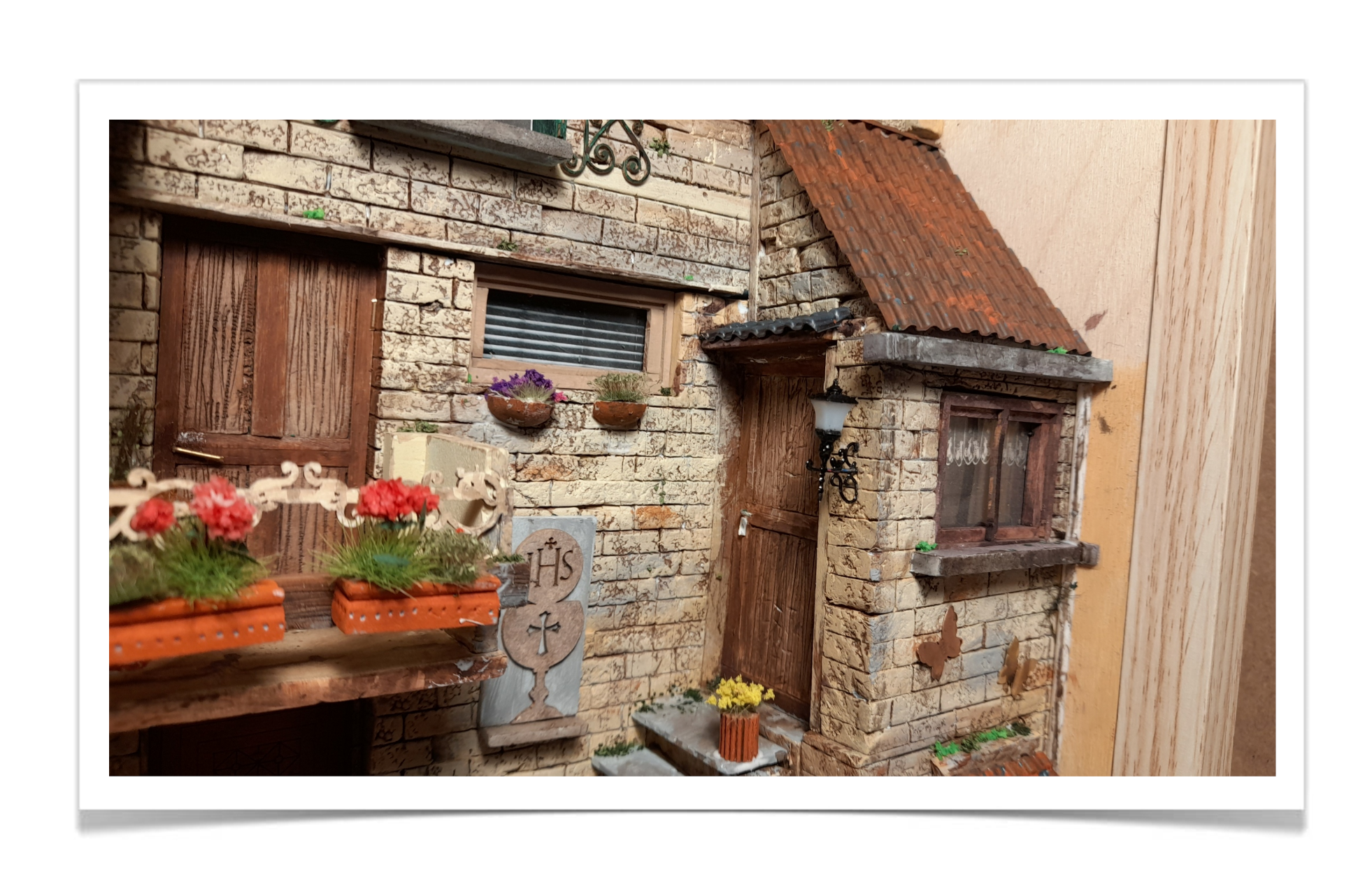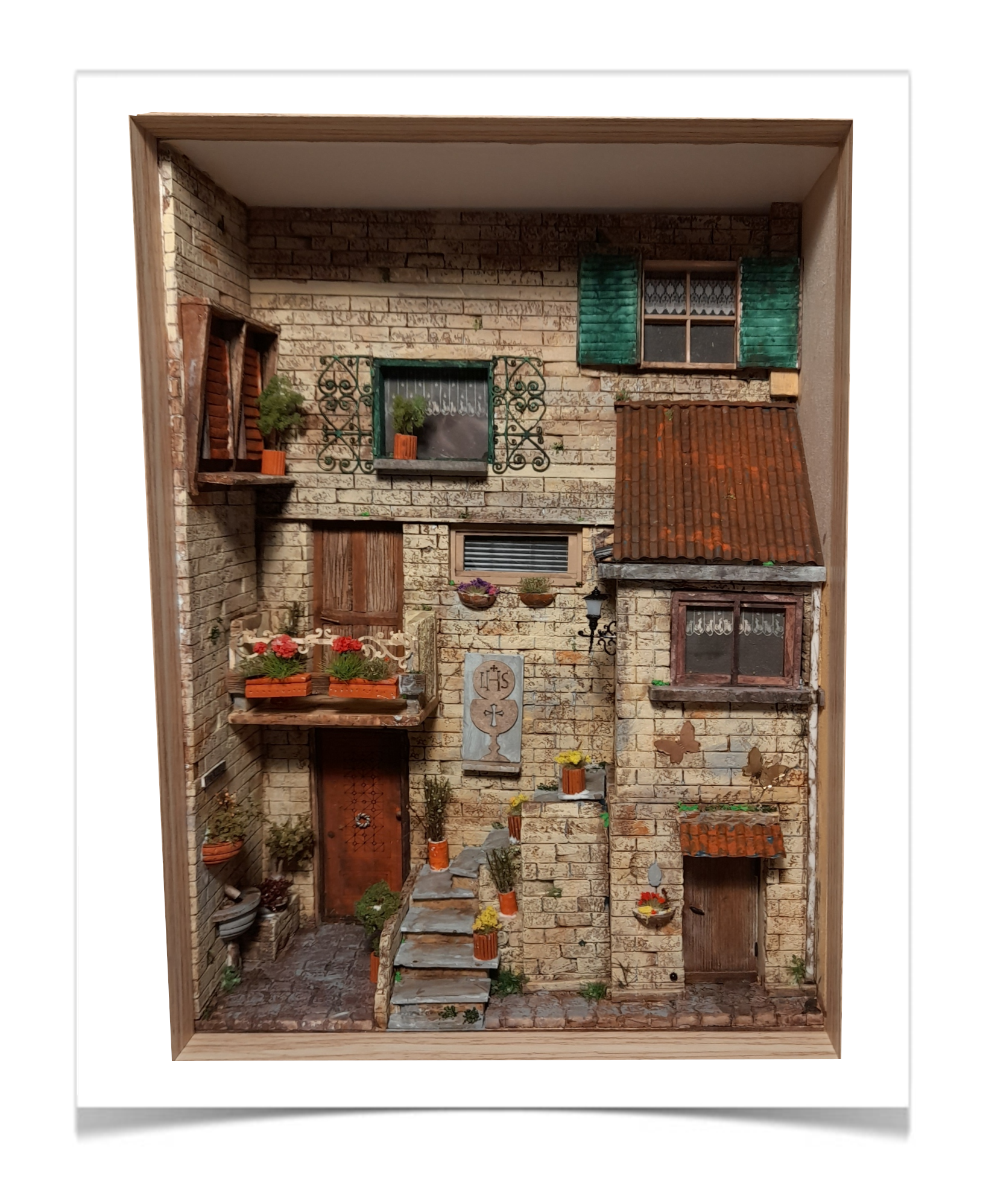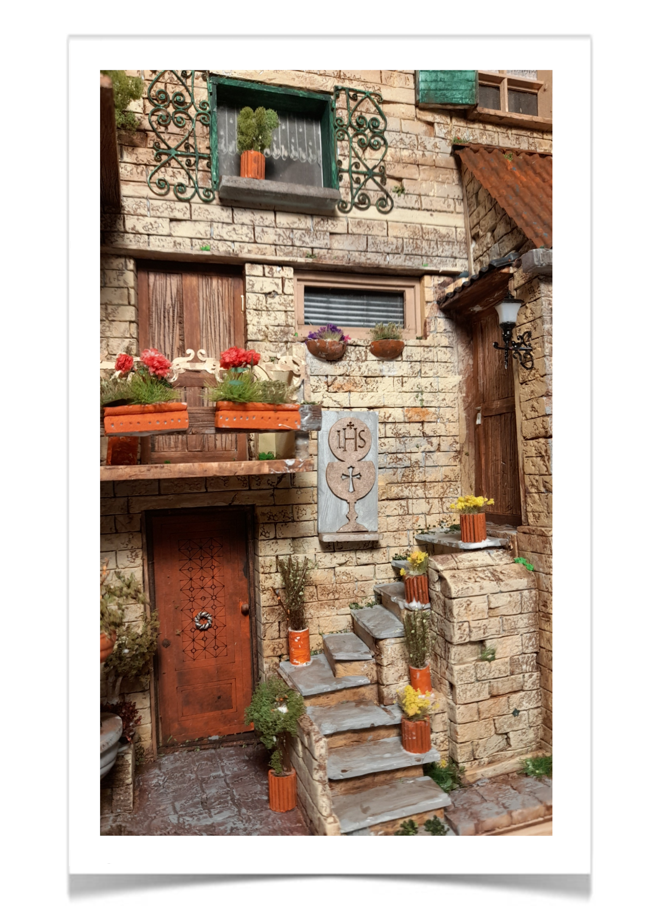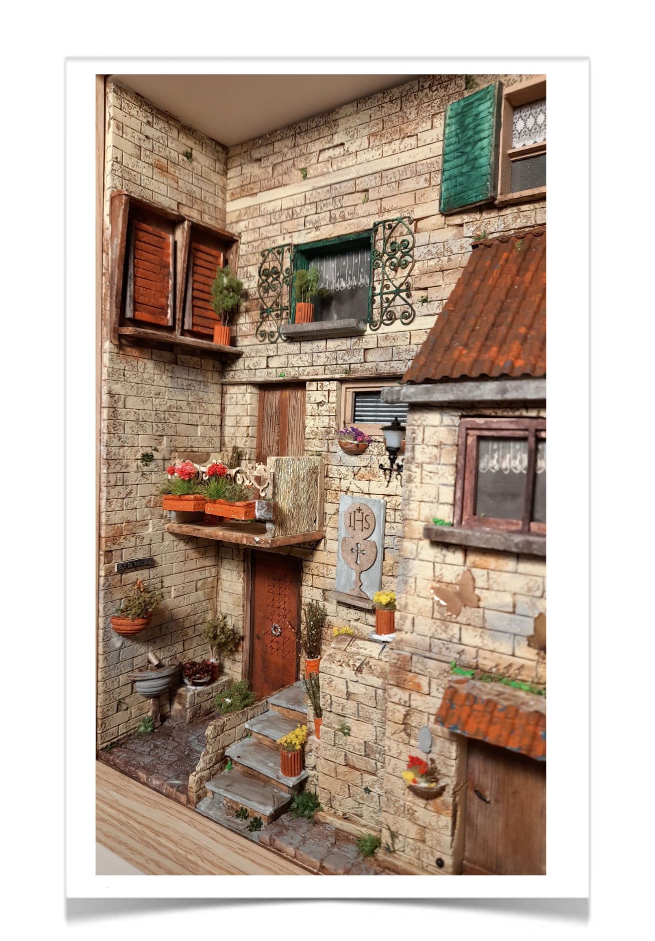 De warme, zuidelijke sfeer van een Toscaanse pastorie waar tijd zachtjes lijkt te vertragen. De verweerde stenen, houten luiken en kleine balkons vormen samen een intiem, bijna filmisch tafereel. De vele planten en bloemen brengen kleur en leven, terwijl de religieuze details een gevoel van historie en rust toevoegen. Een miniatuur die uitnodigt om even stil te staan en te kijken.