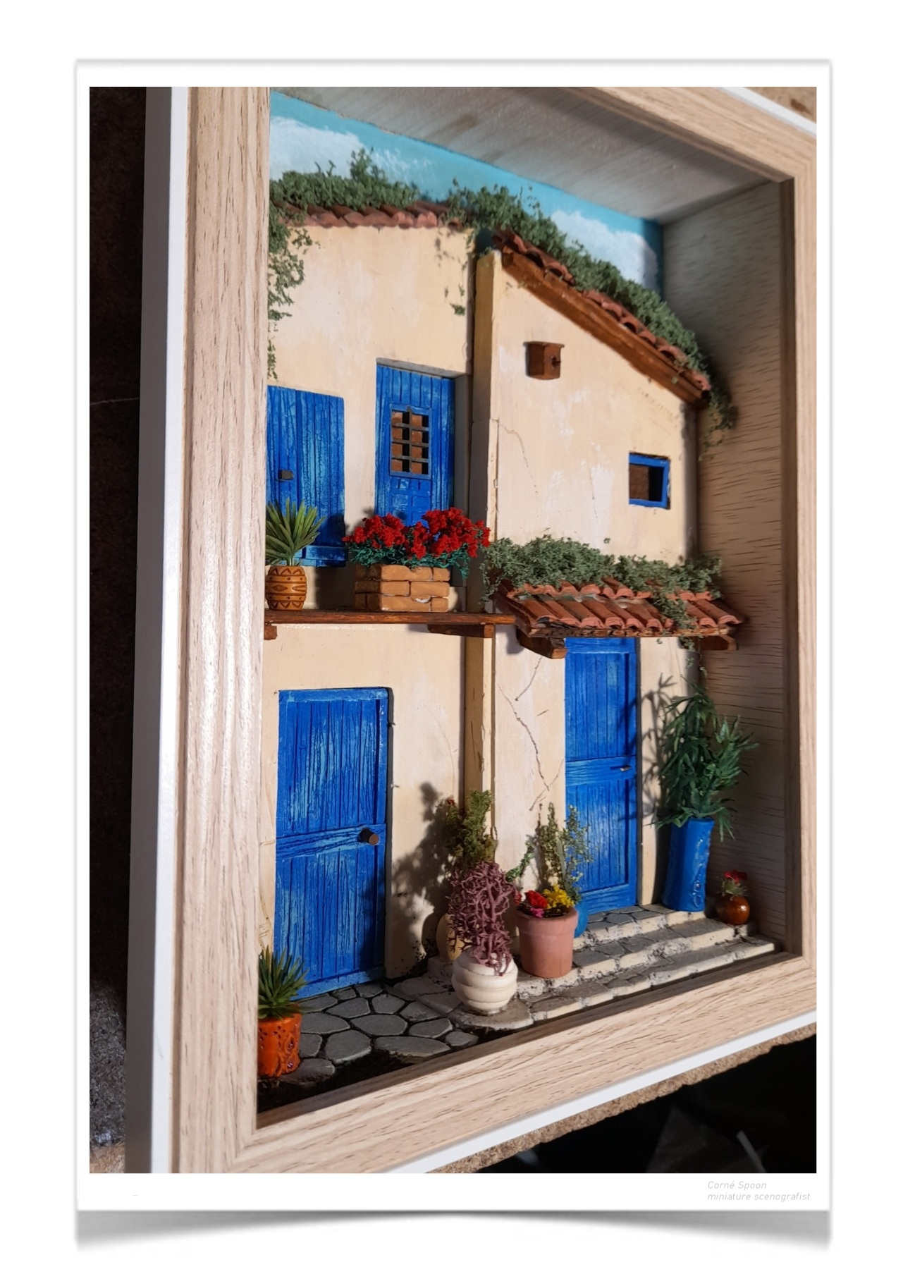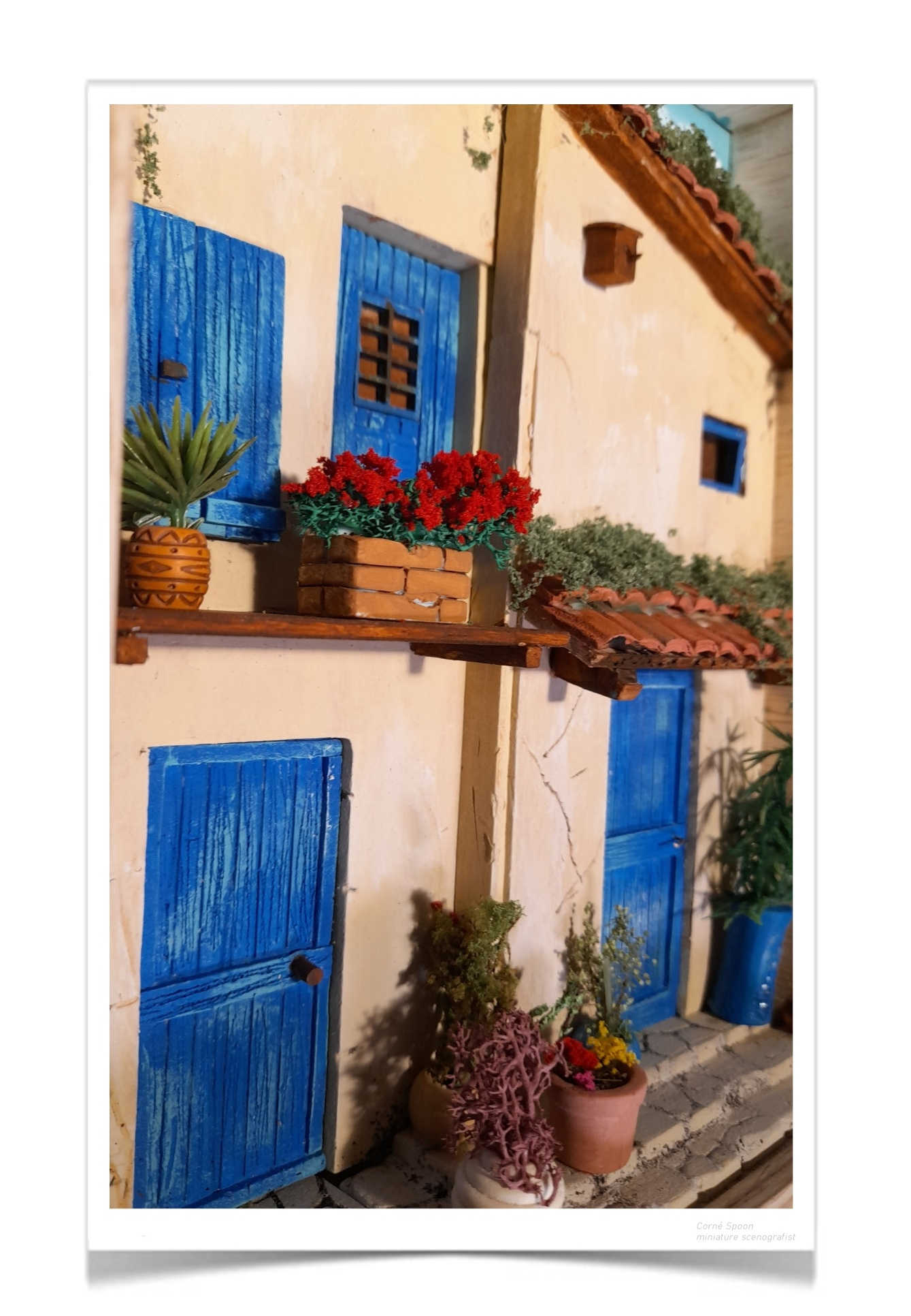 De warme, zuidelijke sfeer van een verweerd huisje met helderblauwe accenten. De scheuren in het pleisterwerk, de overgroeide dakrand en de vele potplanten geven het geheel een doorleefde charme. De blauwe deuren en ramen vormen een fris contrast met de zachte tinten van de muren. Een intiem tafereel dat direct doet verlangen naar zon, rust en een zacht briesje langs de kust