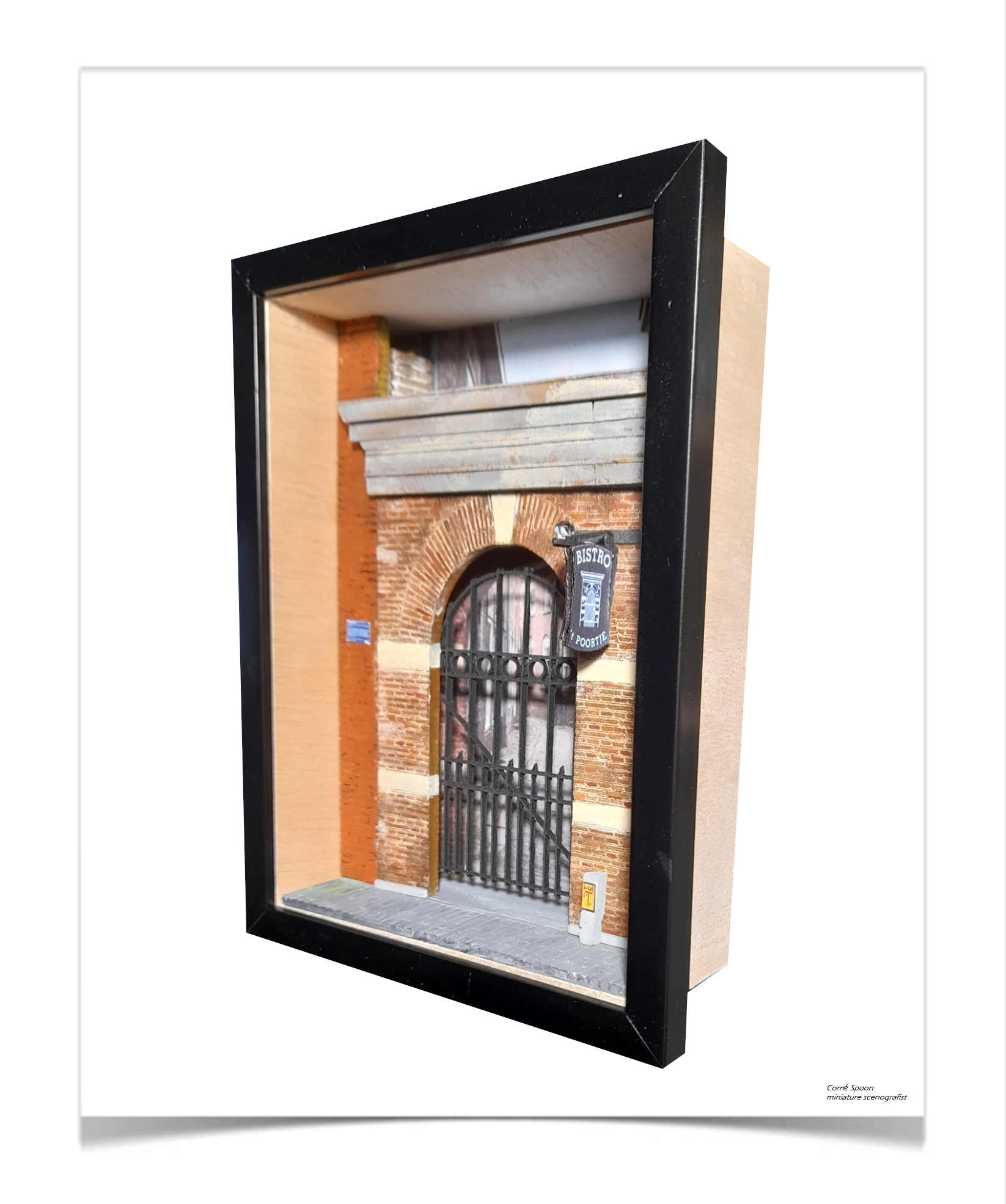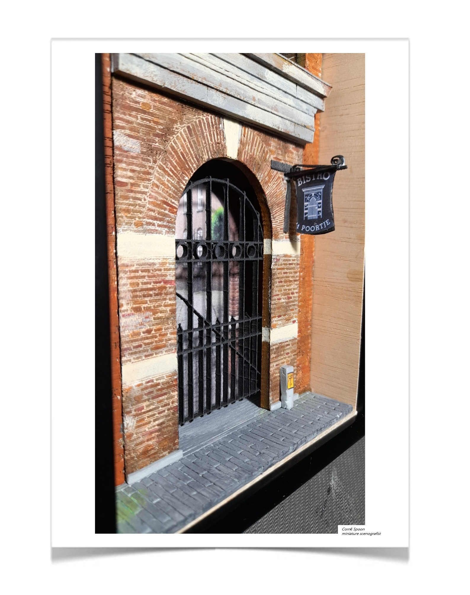Het ontwerp van het Poortje van Verlaan richt zich op de karakteristieke overgang tussen straat en binnenruimte. De baksteenstructuur is opgebouwd in een strak ritme, waarbij de witte horizontale accenten de gevel optisch verlichten. De ronde boog vormt het centrale element: een zachte tegenhanger van de verticale lijnen in het metselwerk. Het smeedijzeren hekwerk is bewust transparant gehouden, zodat de diepte achter de poort voelbaar blijft. Kleine details, zoals het uithangbord en de technische kast, zijn geïntegreerd als functionele componenten die het stedelijke karakter versterken. Het geheel is ontworpen als een compacte studie in balans, schaal en historische sfeer.