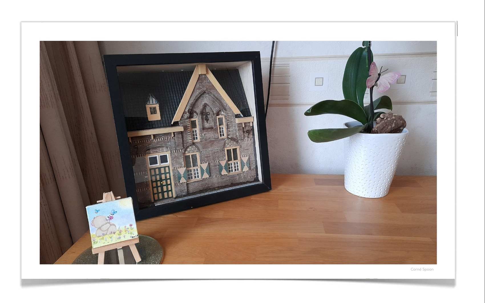 Dit is het neogotische jachthuis dat bij Kasteel Heeswijk hoort. Het gebouw, met een steil zadeldak en baksteenversieringen, dient als woning. De groene deur en luiken geven het geheel een warme, bijna dorpse uitstraling, terwijl het metselwerk en de daklijn een gevoel van historie oproepen. De symmetrie en kleine accenten maken het een intiem tafereel dat direct charme en herkenning uitstraalt.