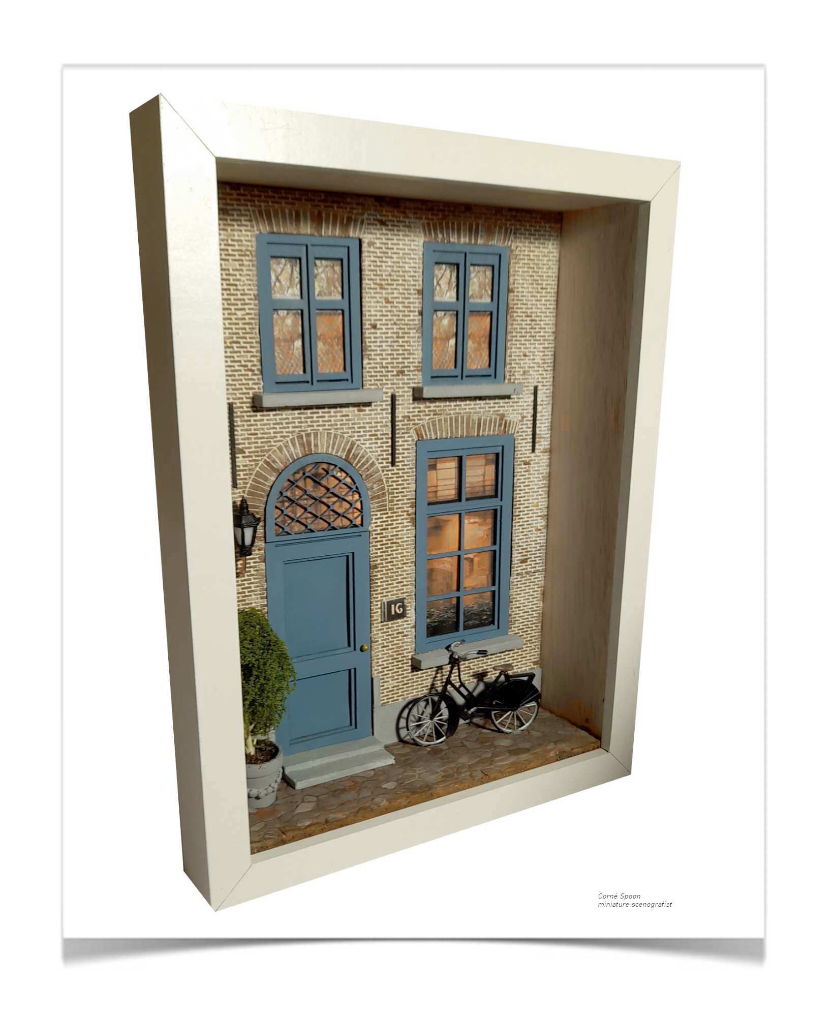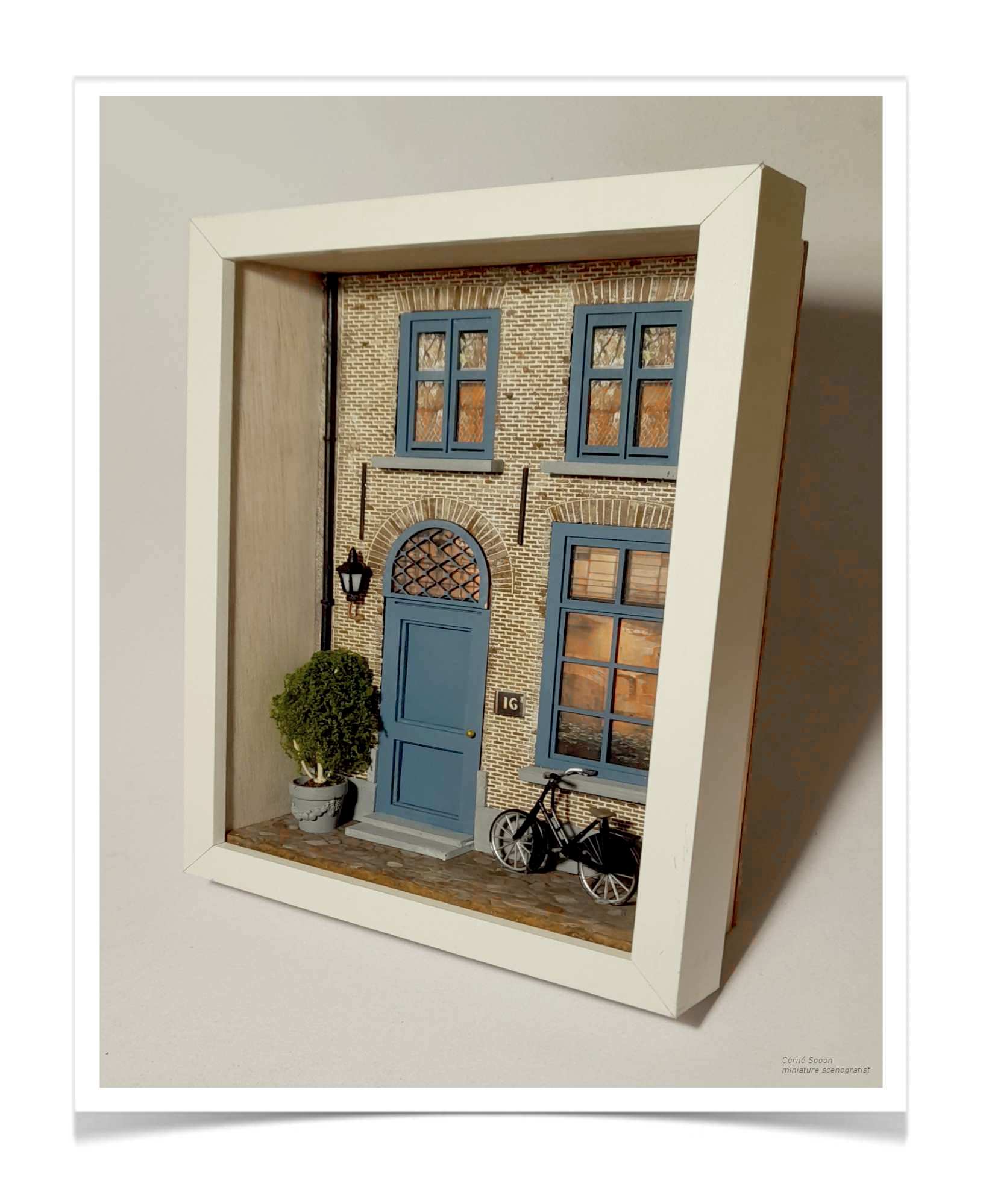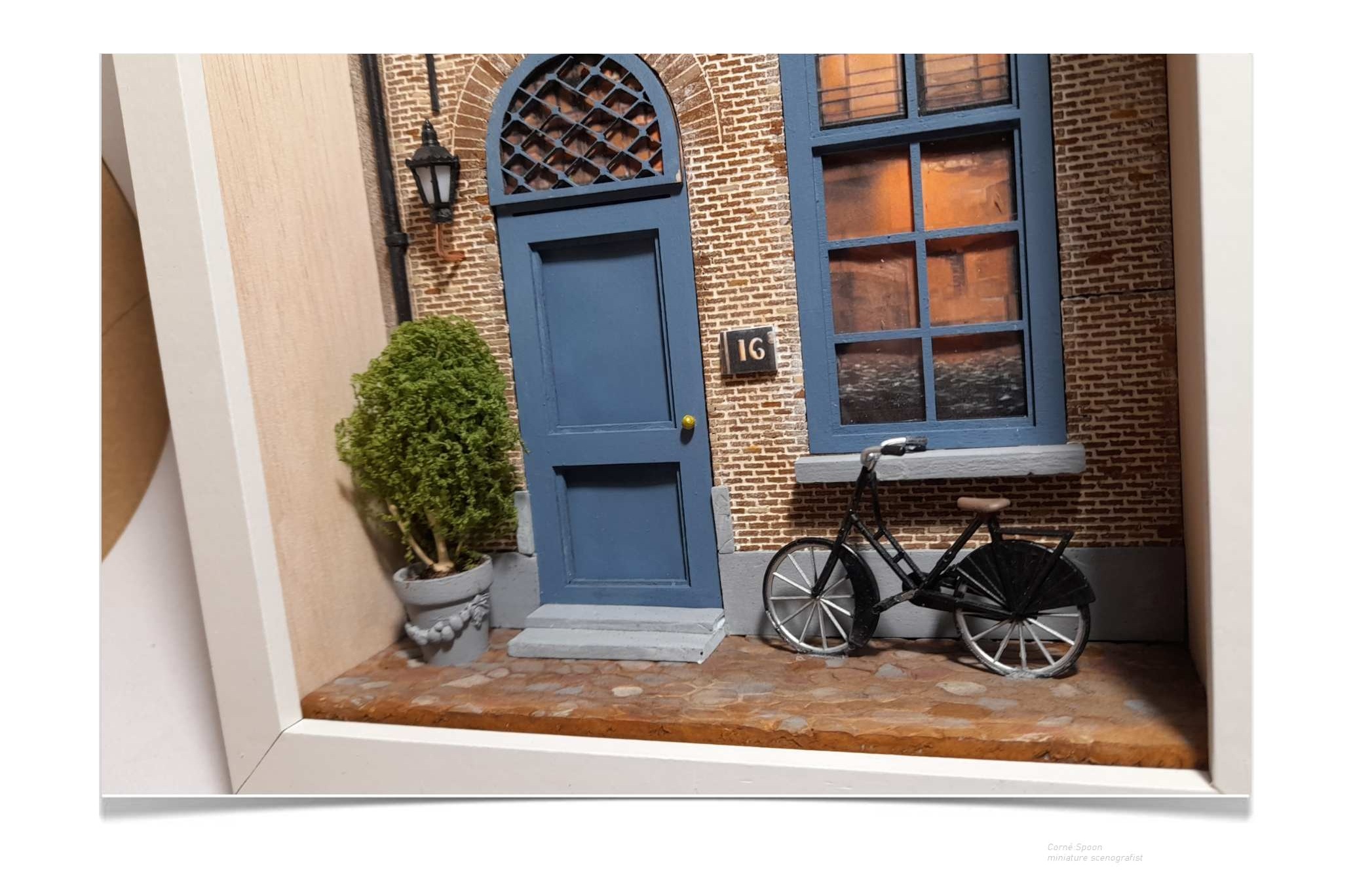 Ontdek de magie van miniatuurkunst met deze prachtig gedetailleerde gevelscène. Elk element – van de blauwe voordeur tot het sfeervol verlichte raam en de authentieke fiets – is met zorg ontworpen om een warm, levendig straatbeeld tot leven te brengen.