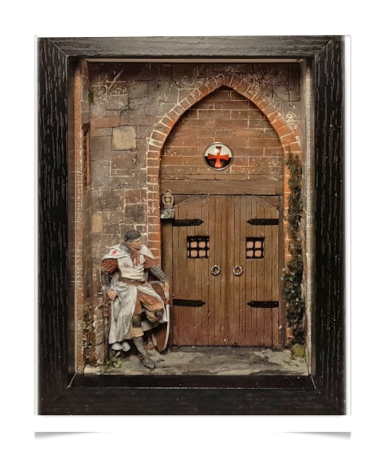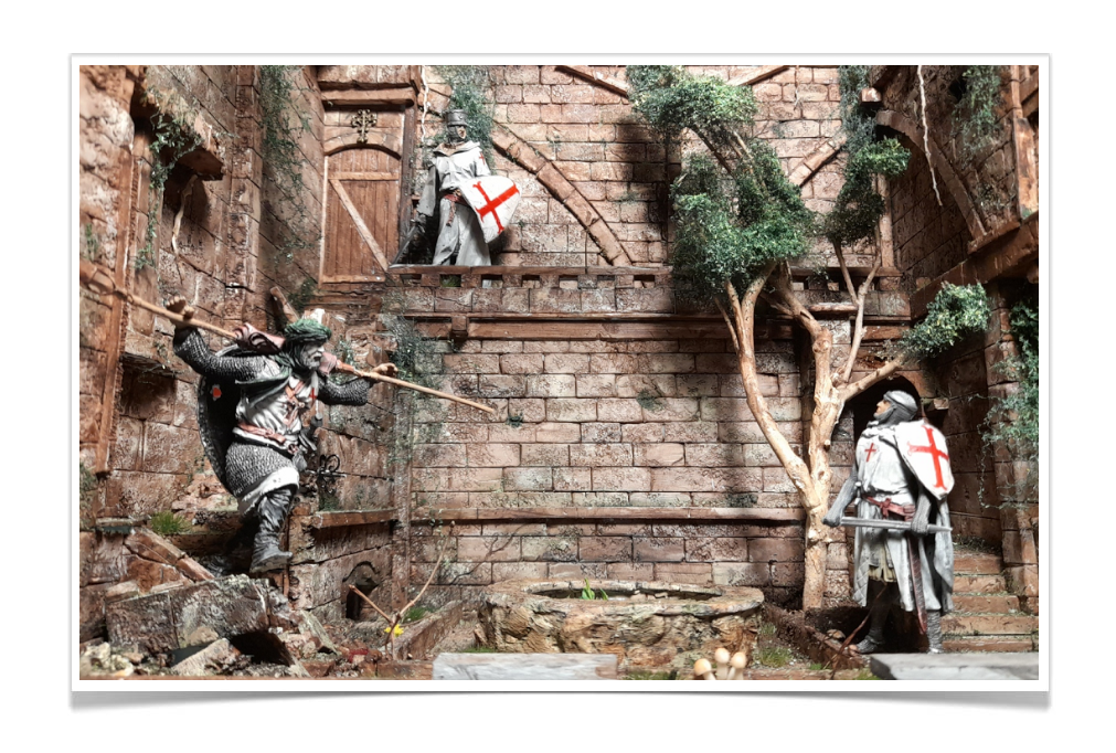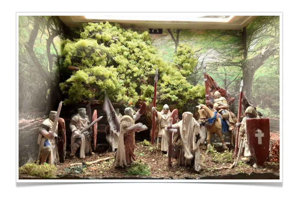Een detailfoto van een diorama van kruisridders. Dit was commissiewerk voor een verzamelaar