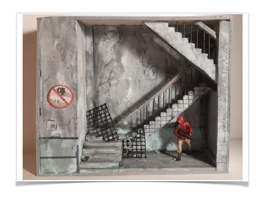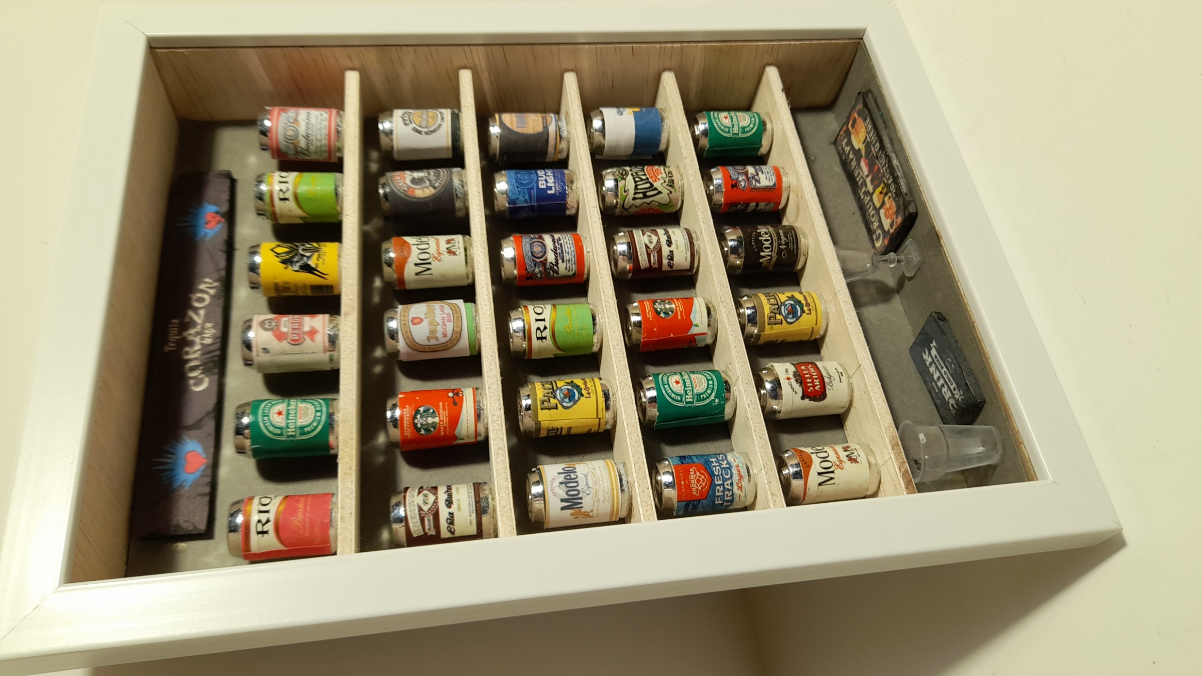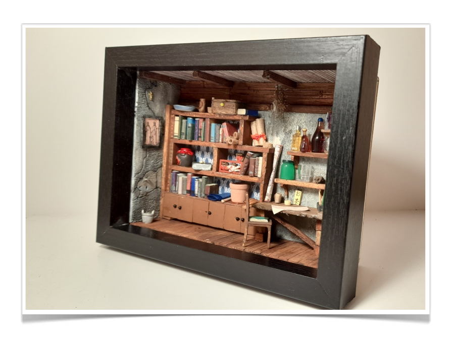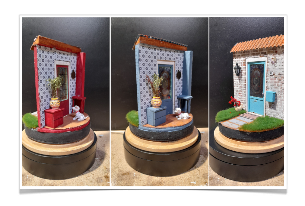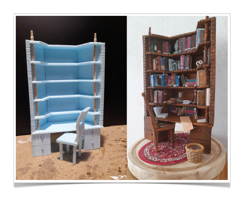 Ik had nog een glazen stolp in de kast. Dus heb ik er een oude boekenkast in gebouwd. Links de ongeverfde versie en zoals je ziet gemaakt van foam