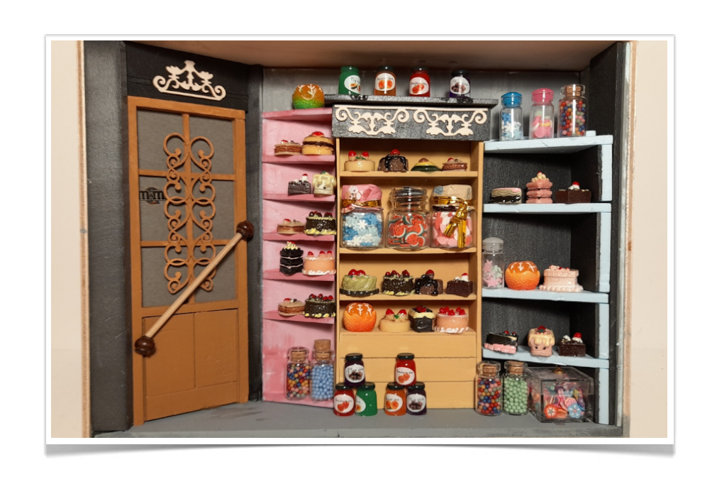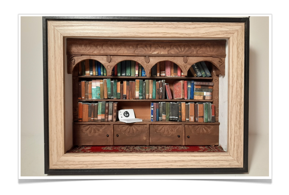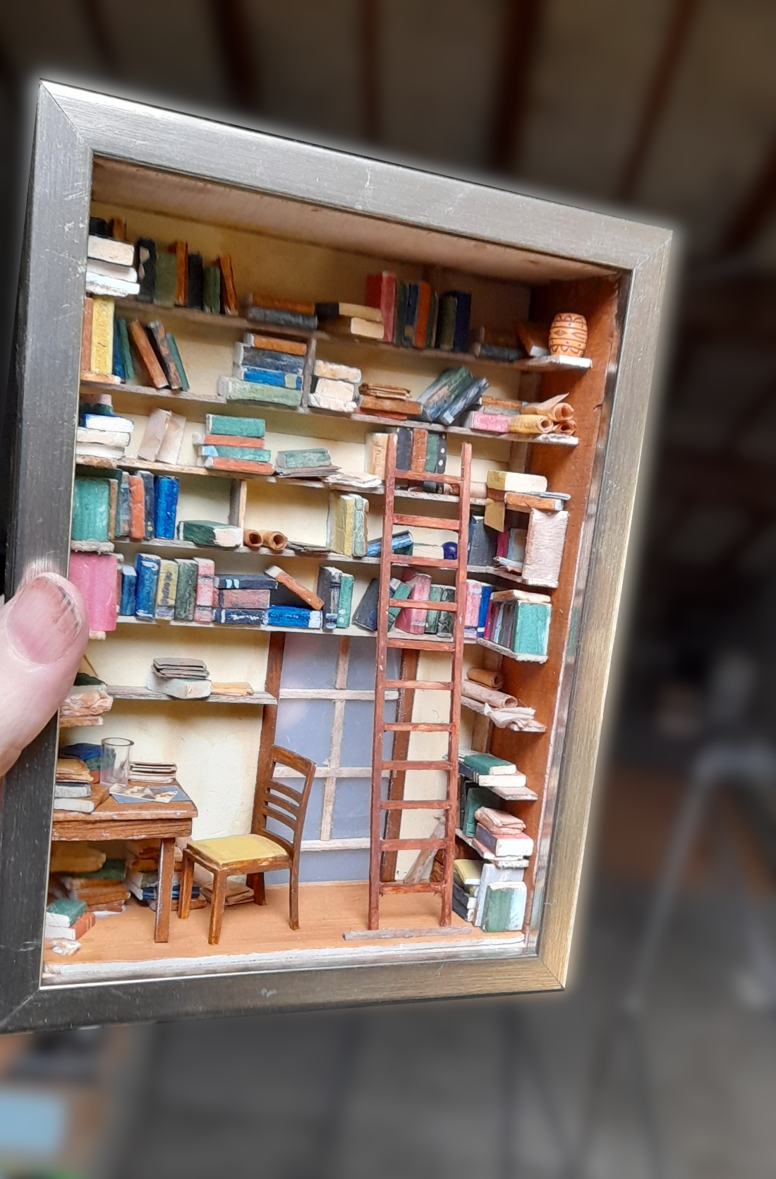 Ik had nog wat zelfgemaakte boekjes over van een ander project, dus er maar een boekenkast omheen gebouwd