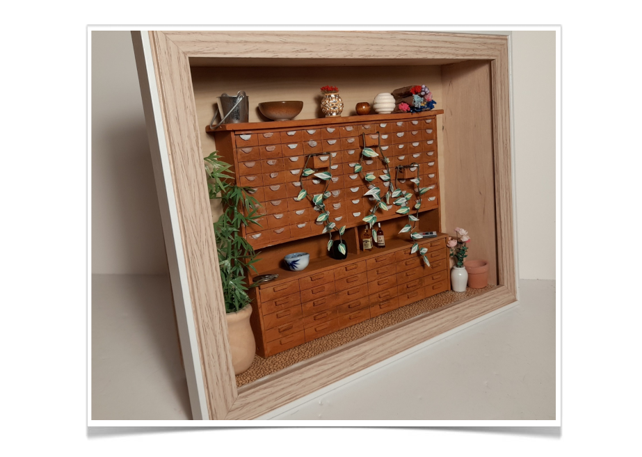 Dit is een oude kast die vroeger werd gebruikt om zaden op te slaan. Staat in een tuincentrum bij mij in de regio