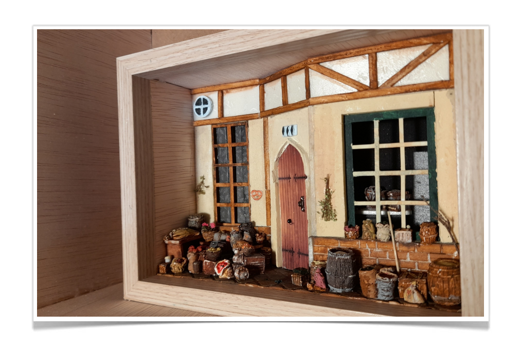 Een winkeltje met zakken, kratten en tonnen voor de etalage. Beetje Middeleeuws